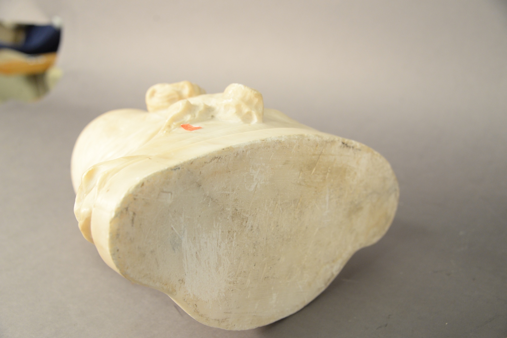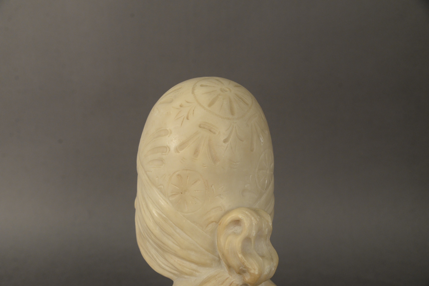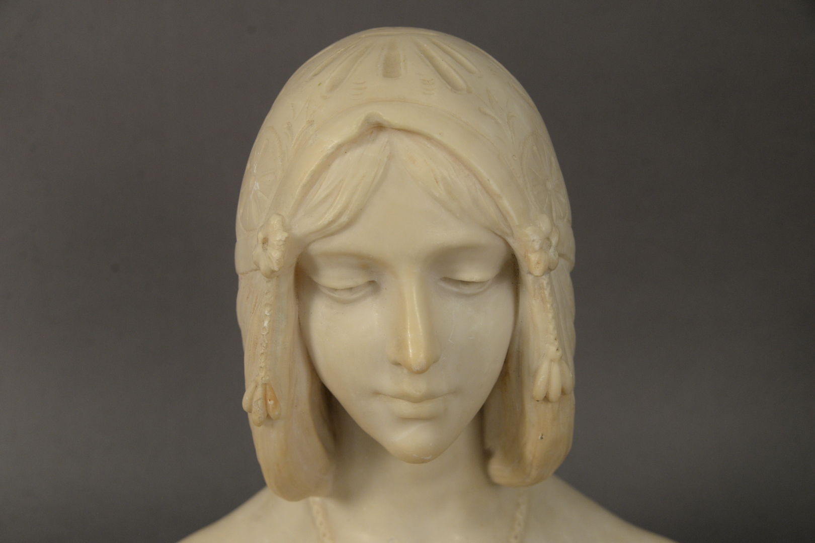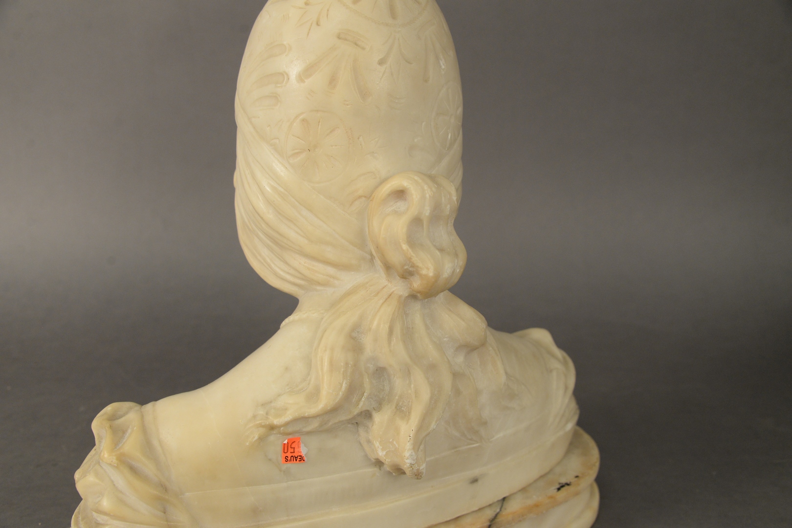 Lot 402: Marble Bust of a Woman, wearing a partial fleur-de-lis necklace, on matching marble base, height 16 inches, width 16 inches, depth 6 1/2 inches, partial loss to the chest.