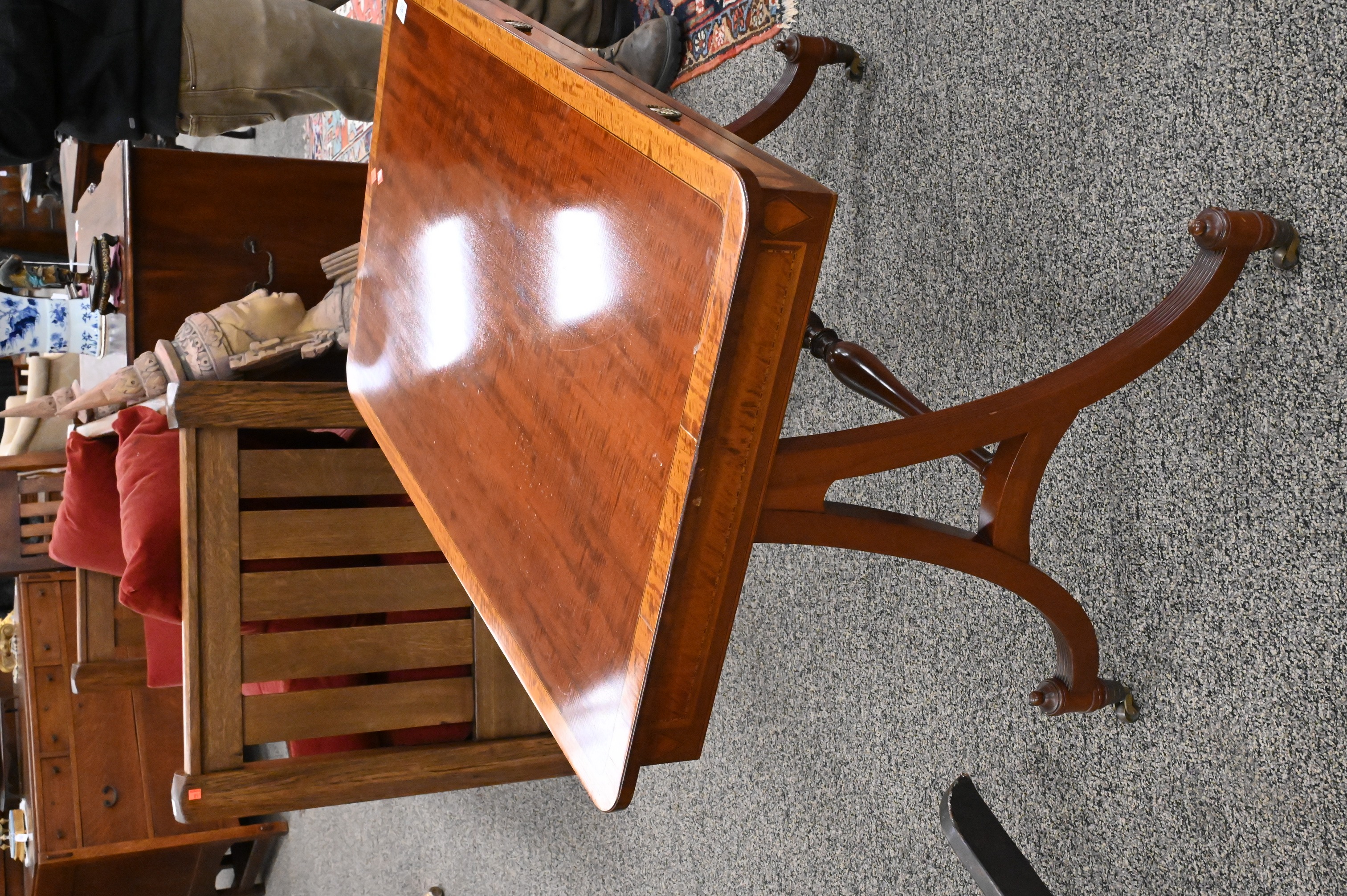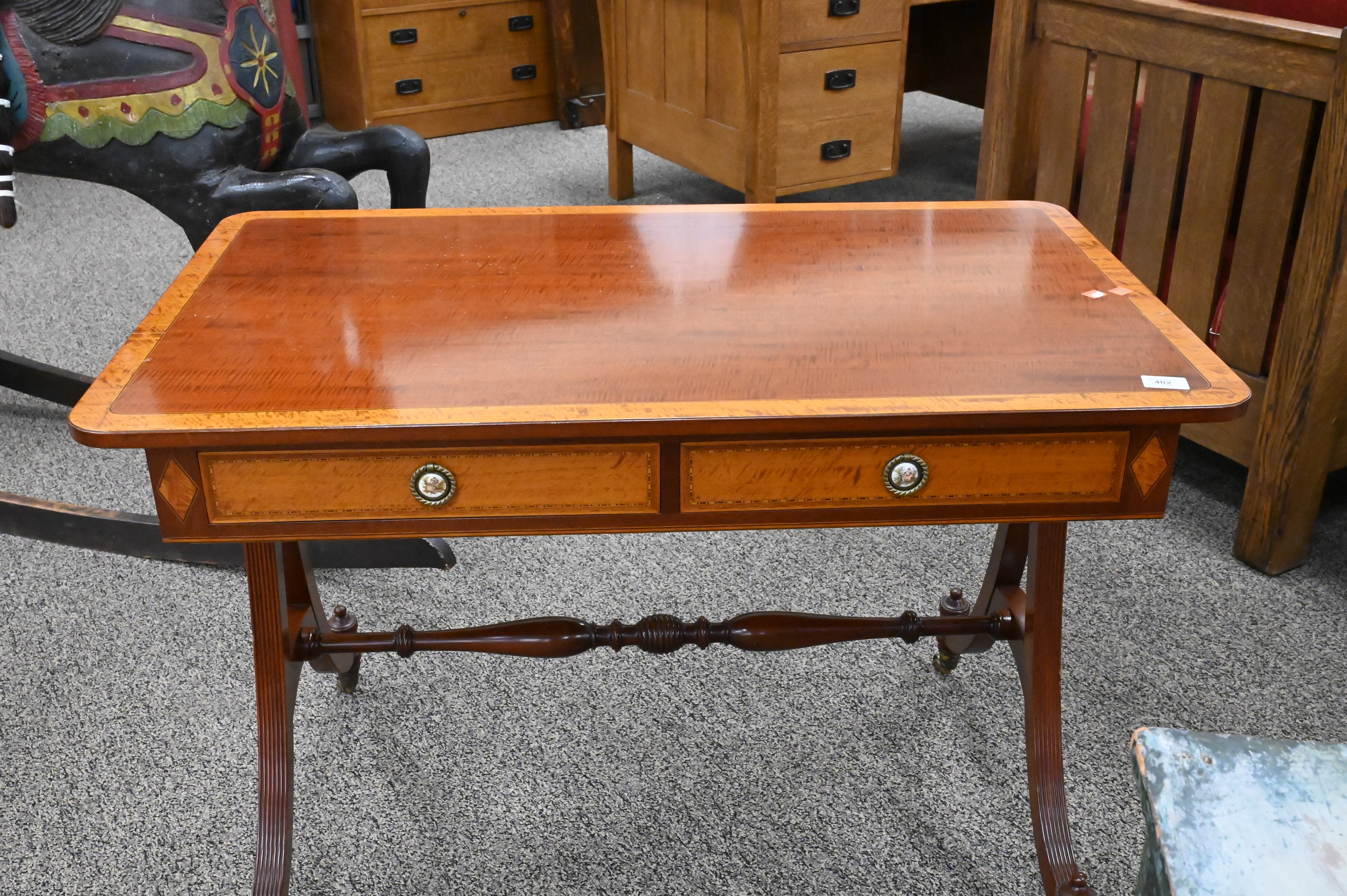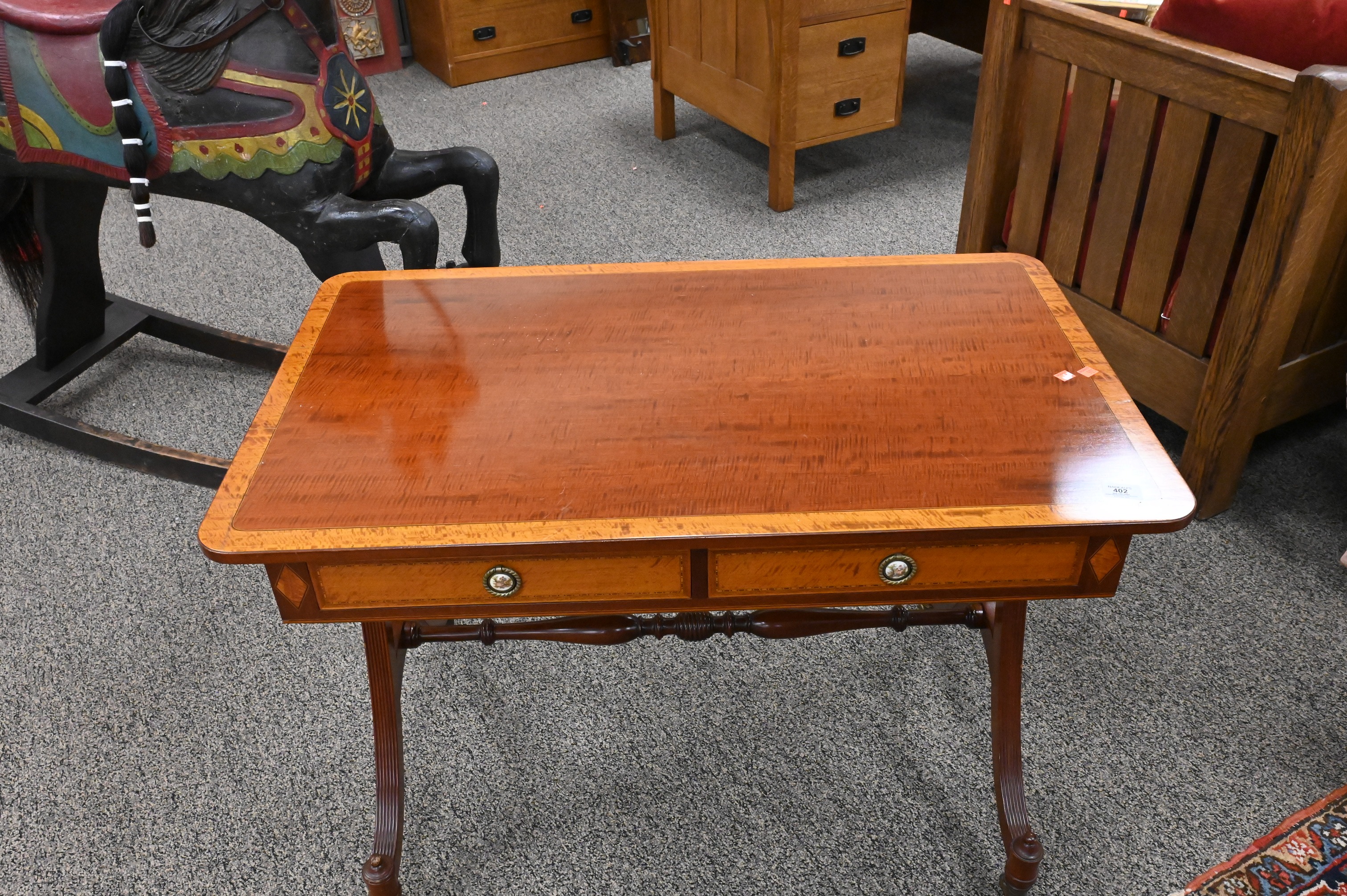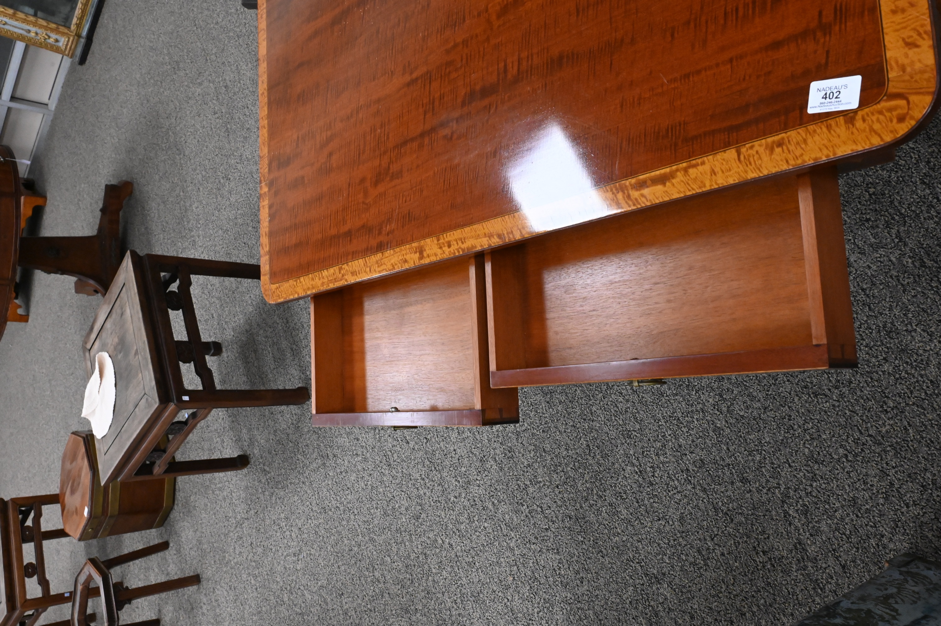 having banded inlaid top over two drawers and two false drawers, set on four downswept reeded members, top made of fiddleback mahogany, signed Margolis with brand mark