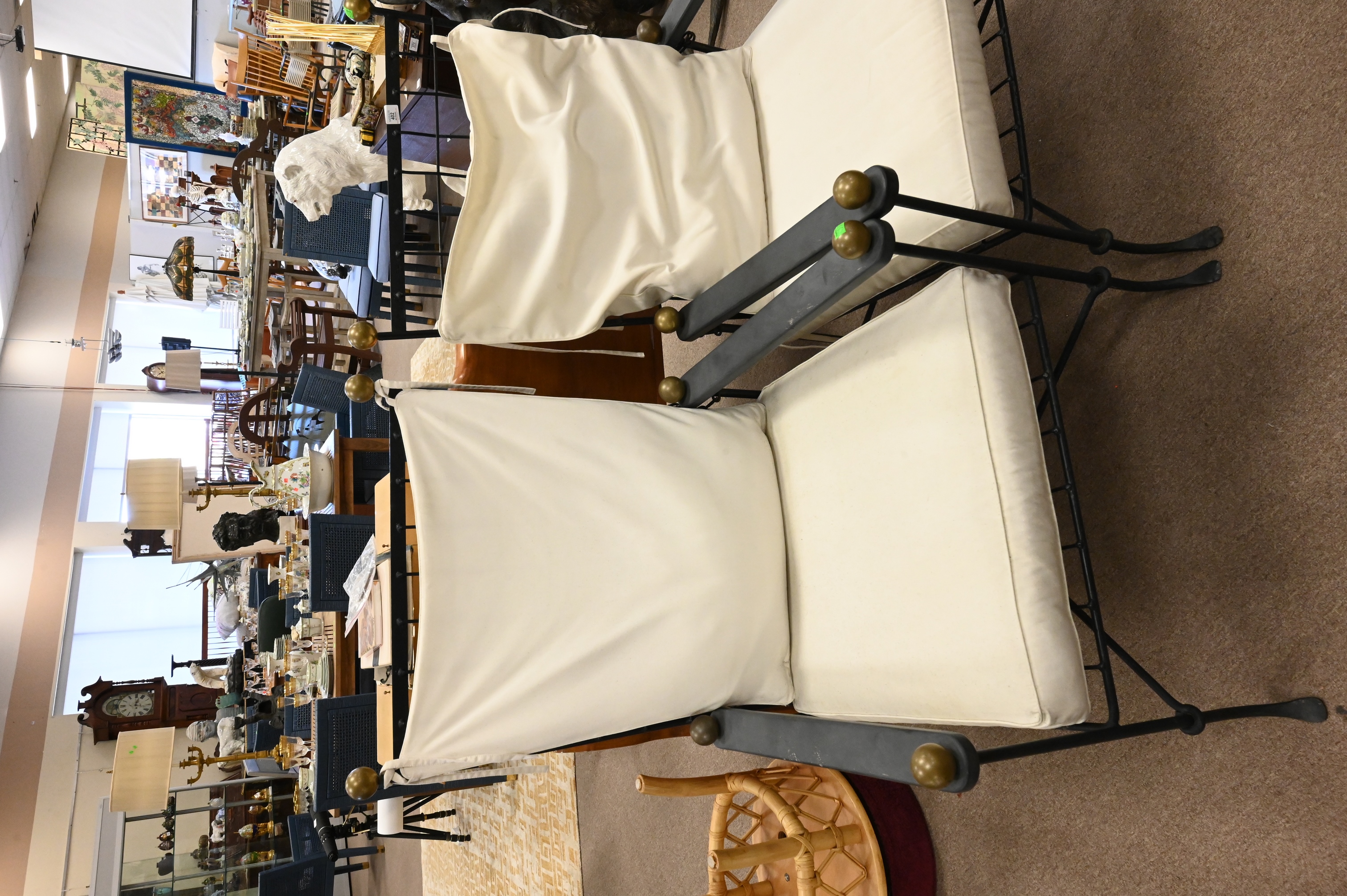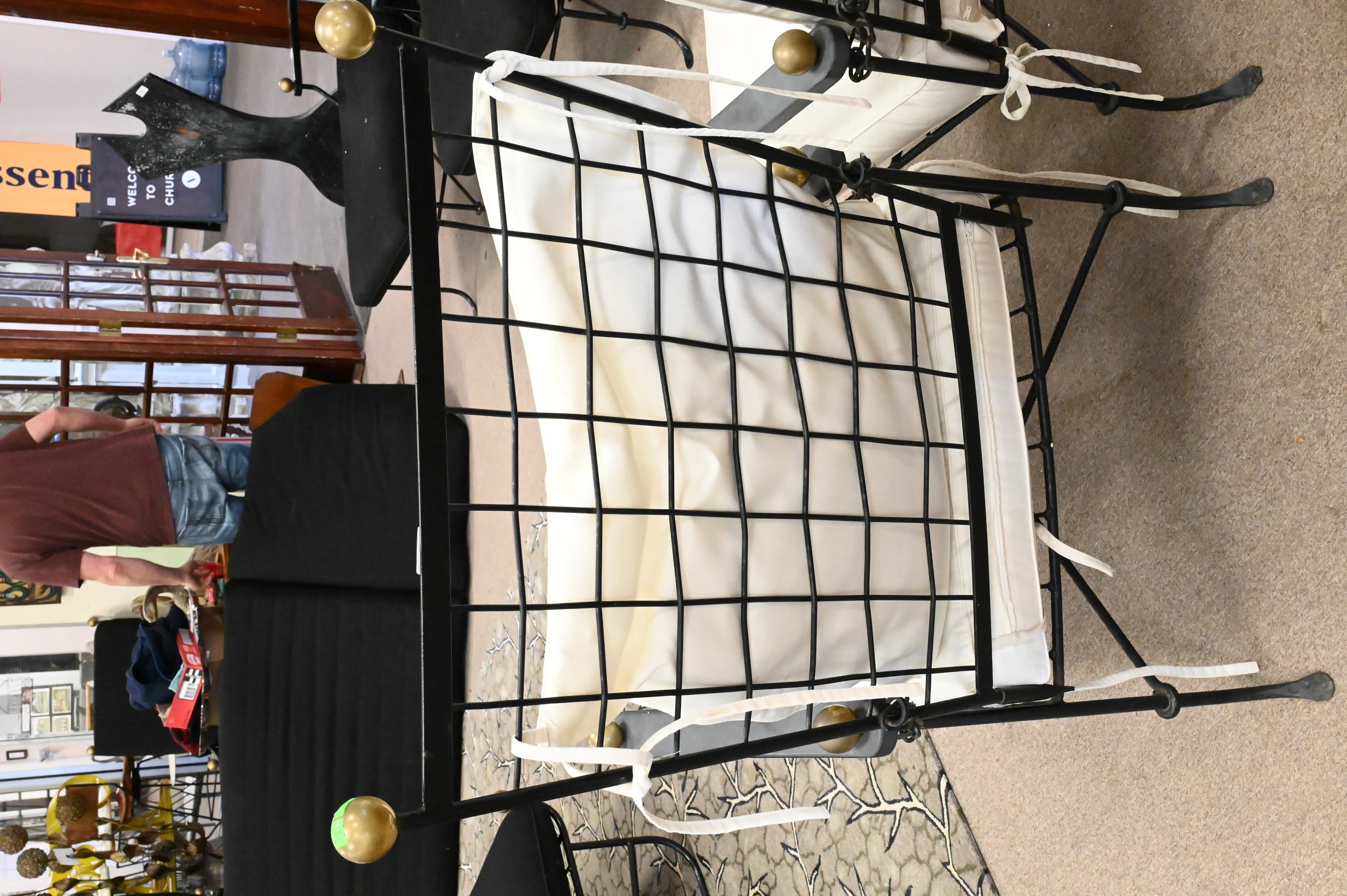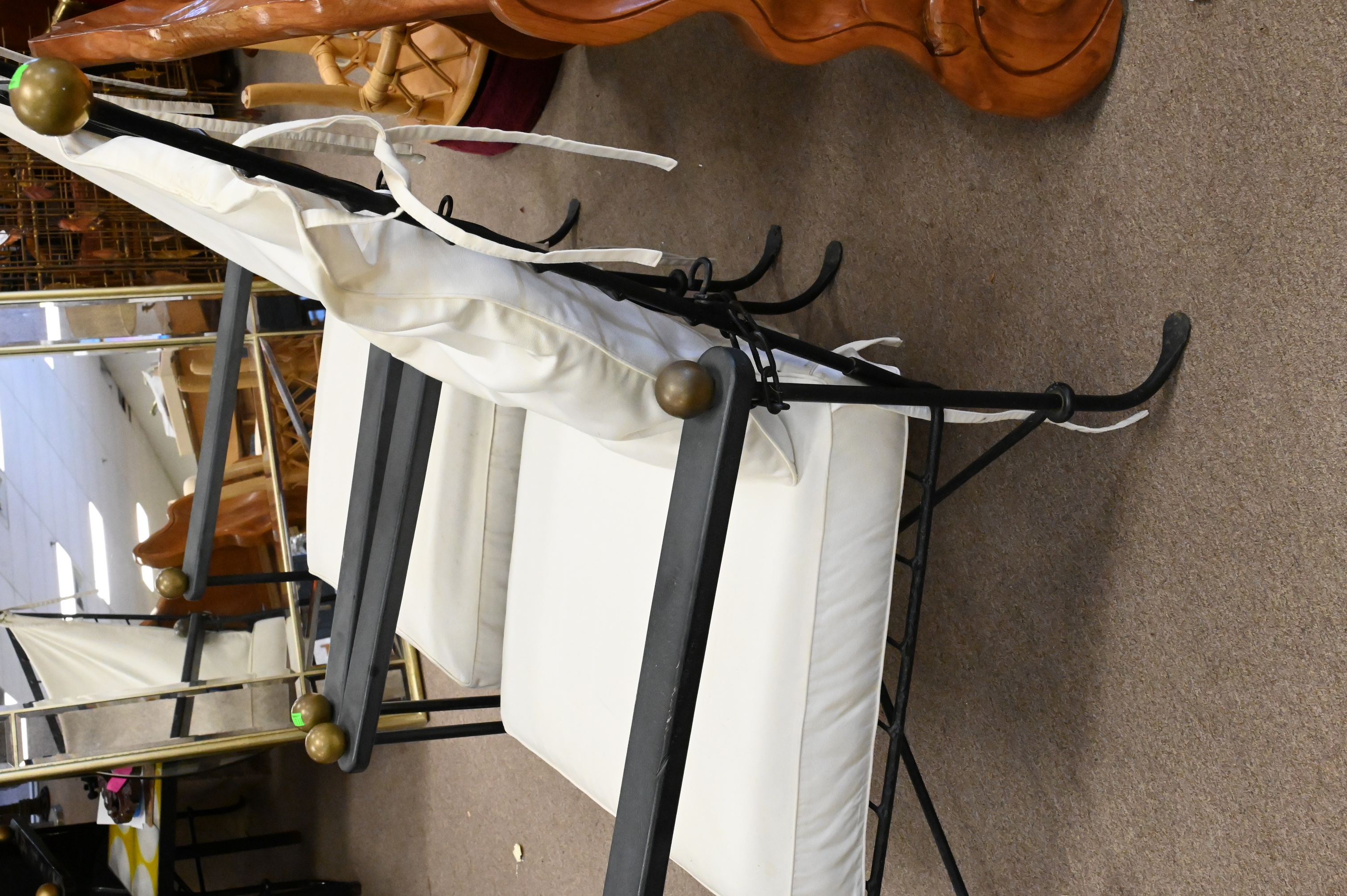wrought iron woven design having brass ball finials and chains for adjustable back along with white cushions