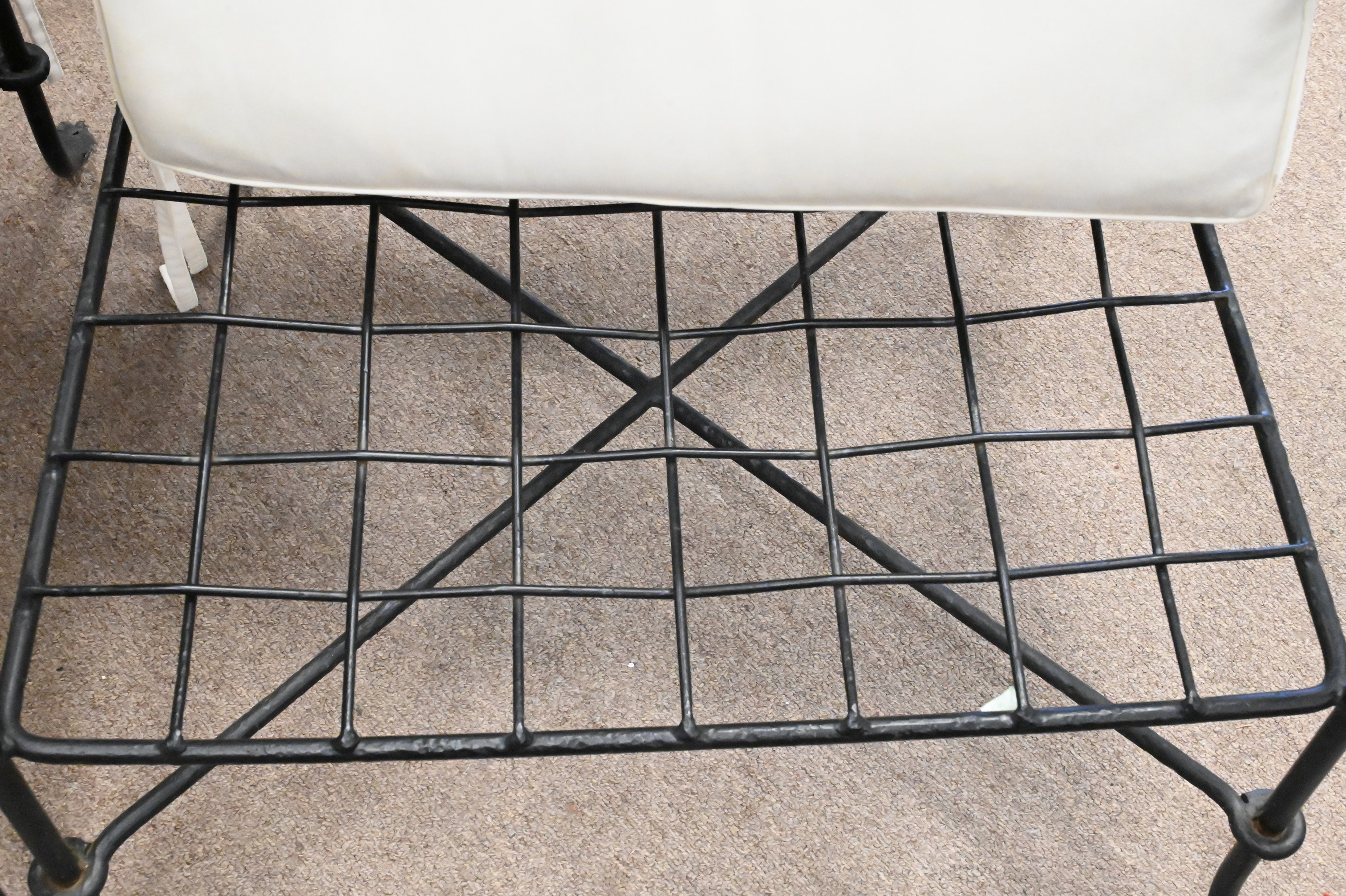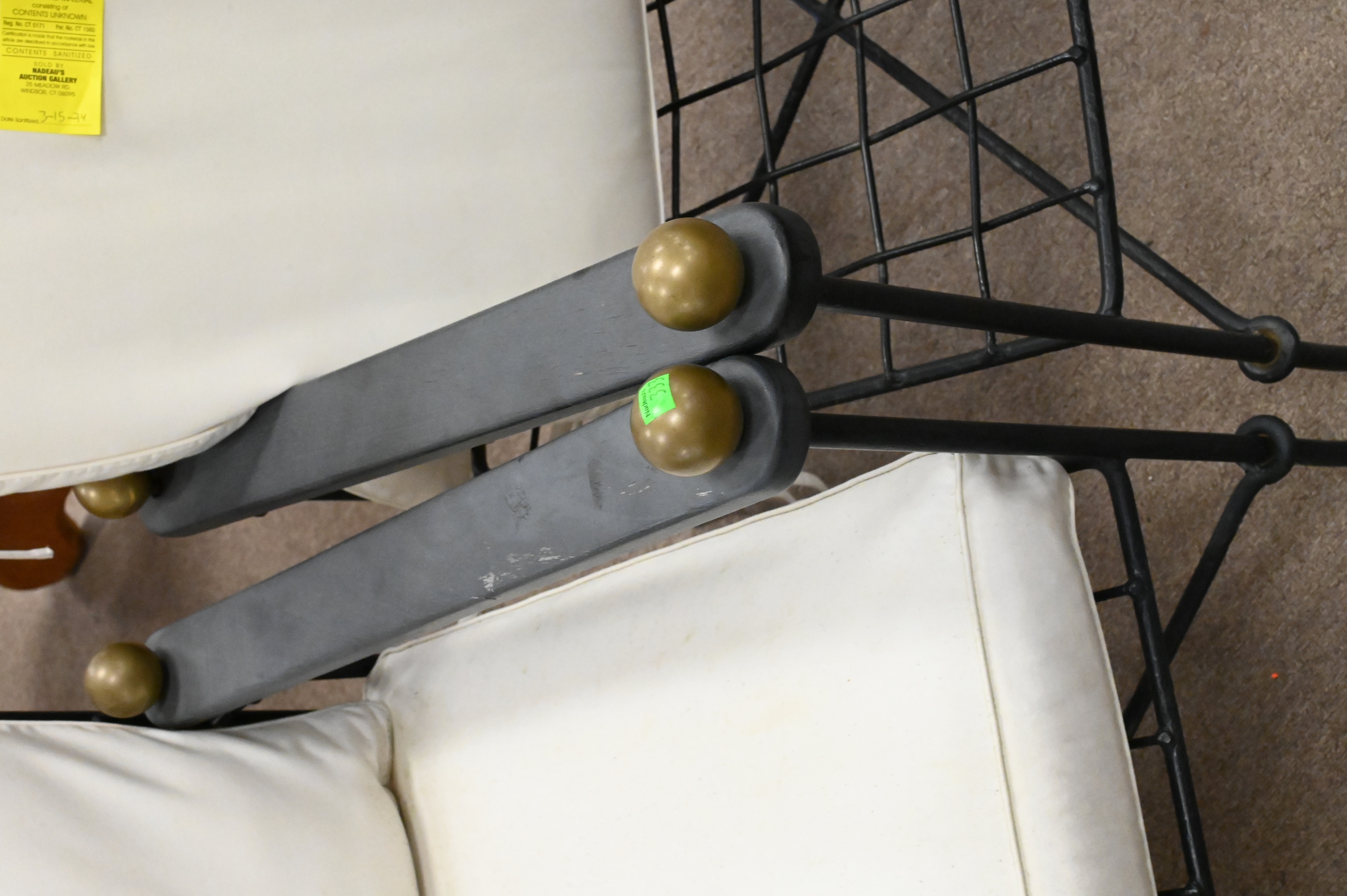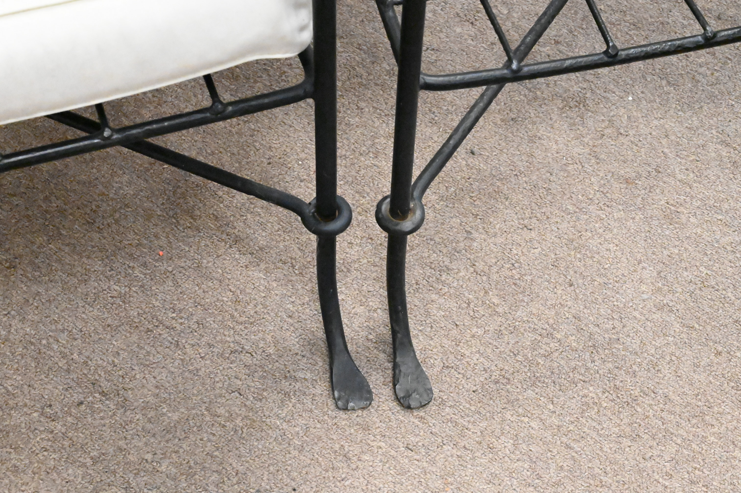 wrought iron woven design having brass ball finials and chains for adjustable back along with white cushions