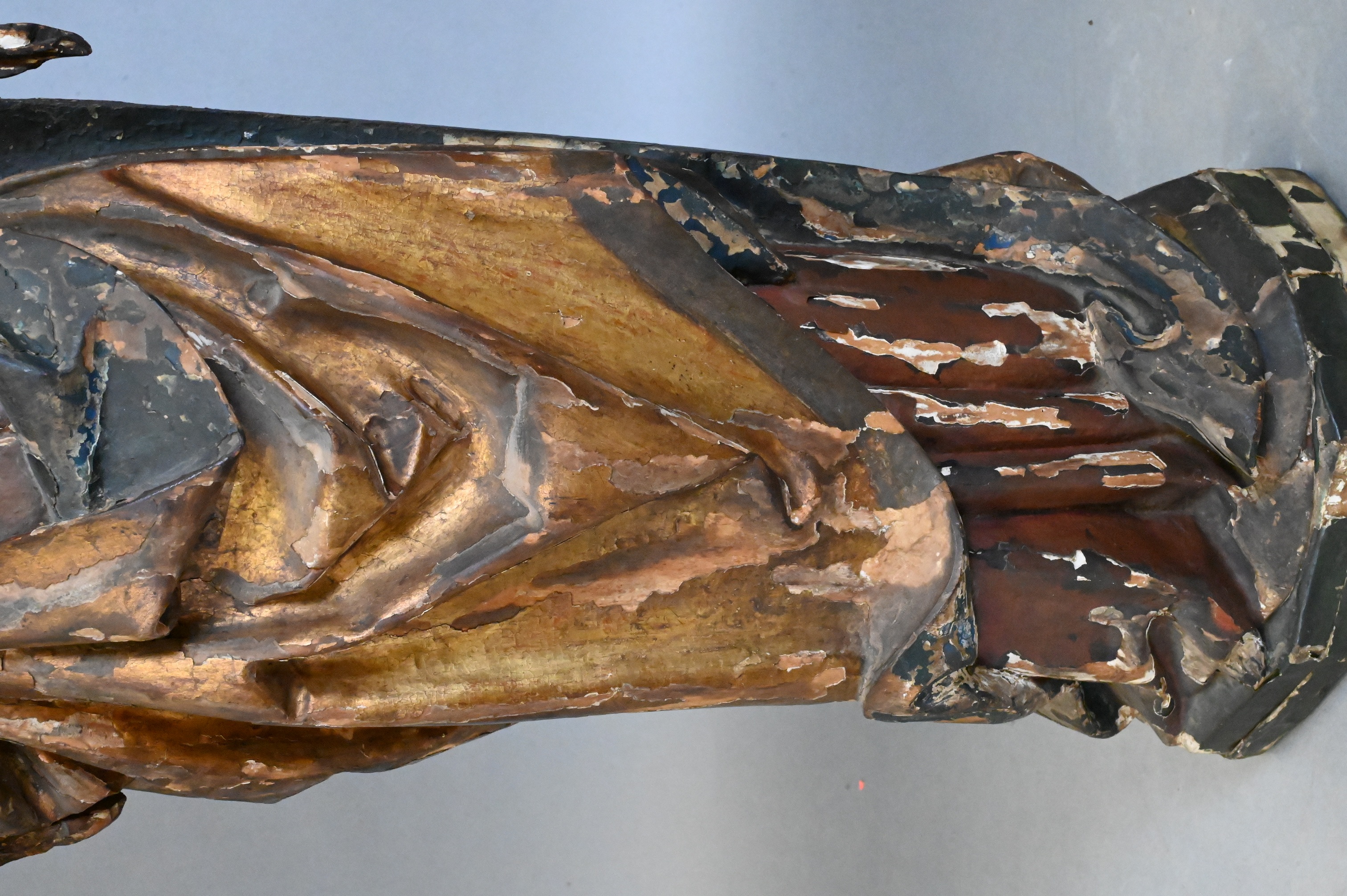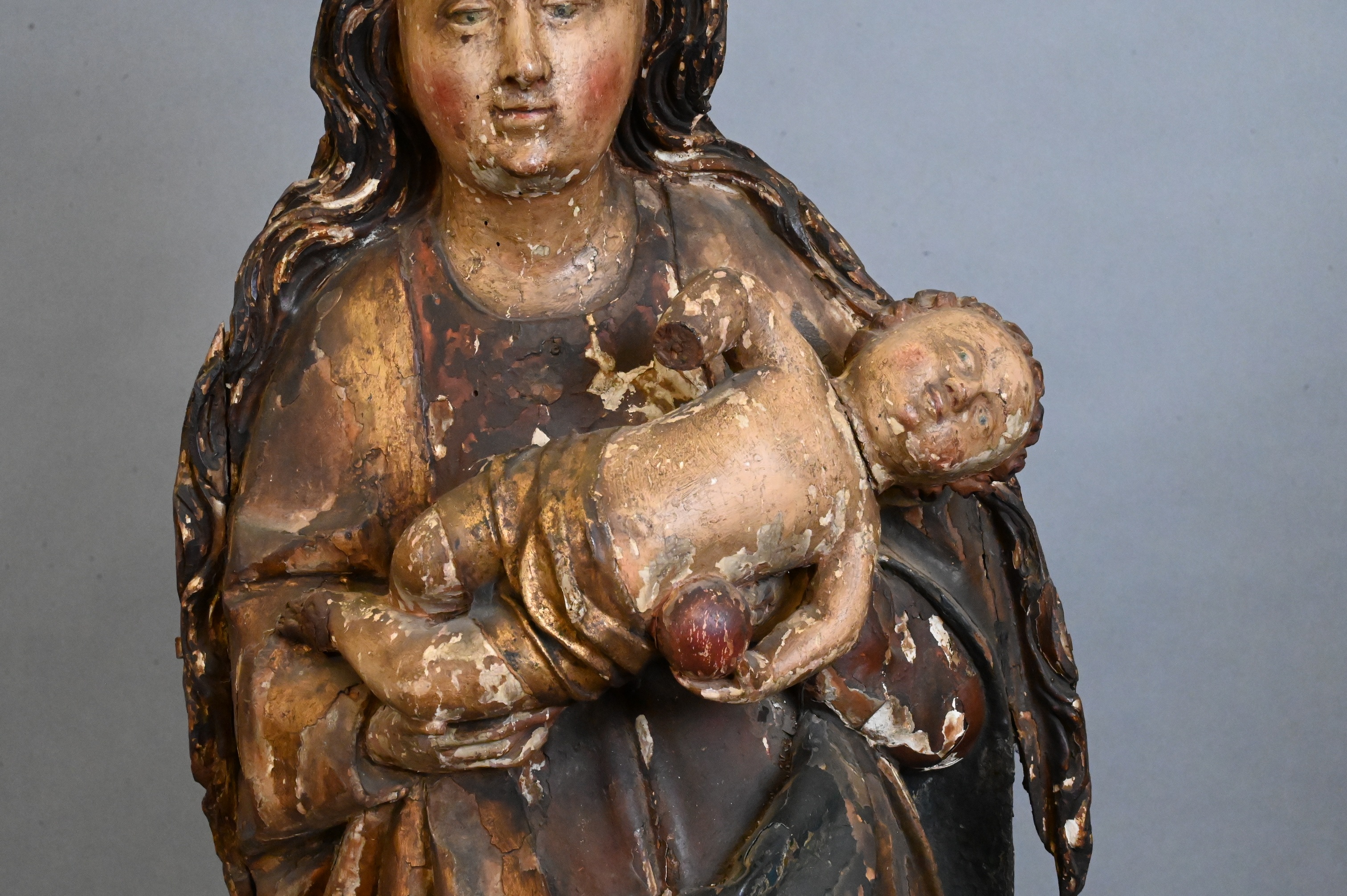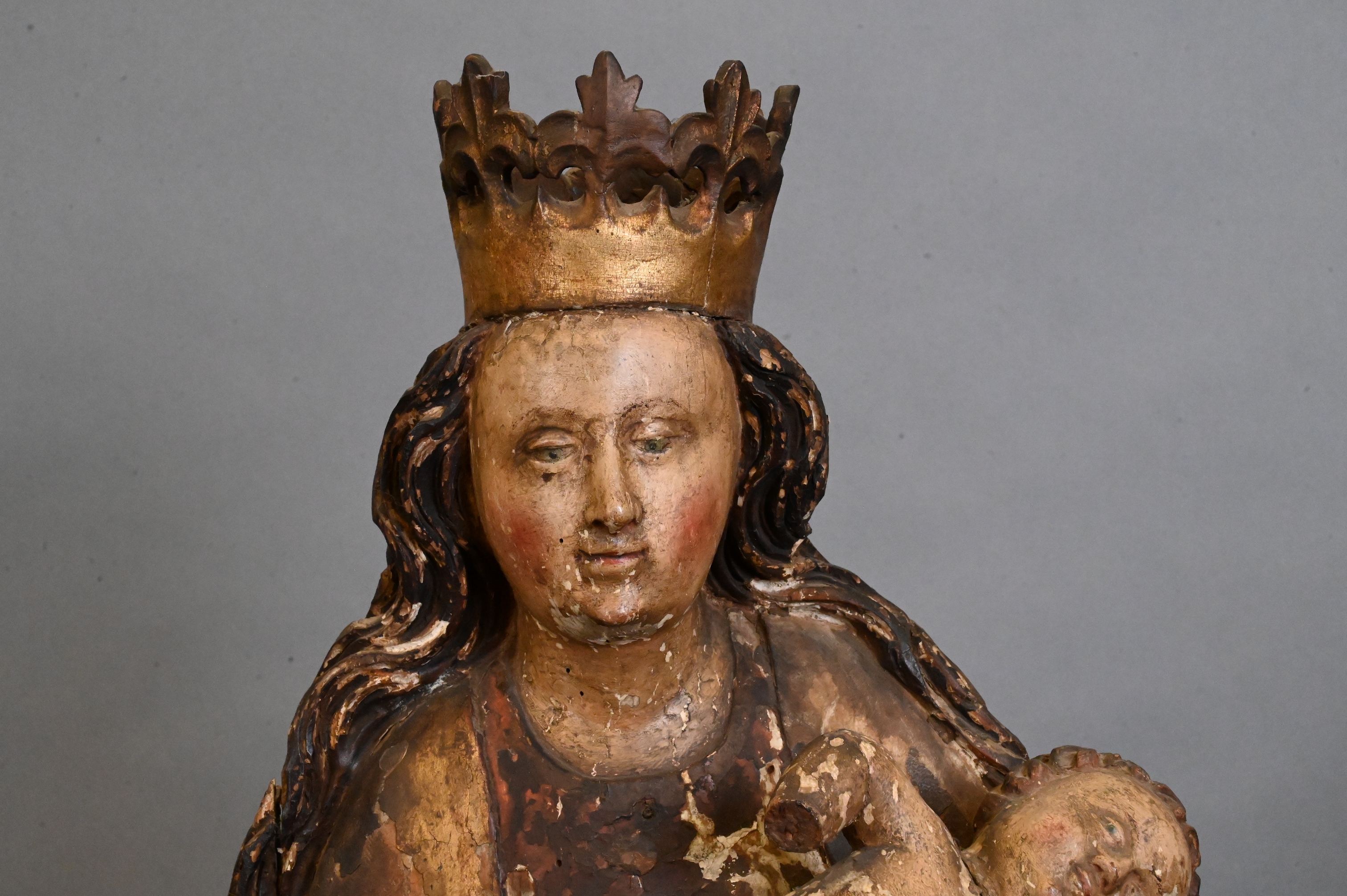 A carved and polychrome limewood figure of the crowned Virgin, shown standing and looking slightly downward, her long tresses falling over her shoulders. Her robe is carved in deeply cut V-shaped folds, and she holds the Christ Child in both hands. The Child holds an orb, The sculpture retains traces of original and later polychromy; over-painted in the 19th century.