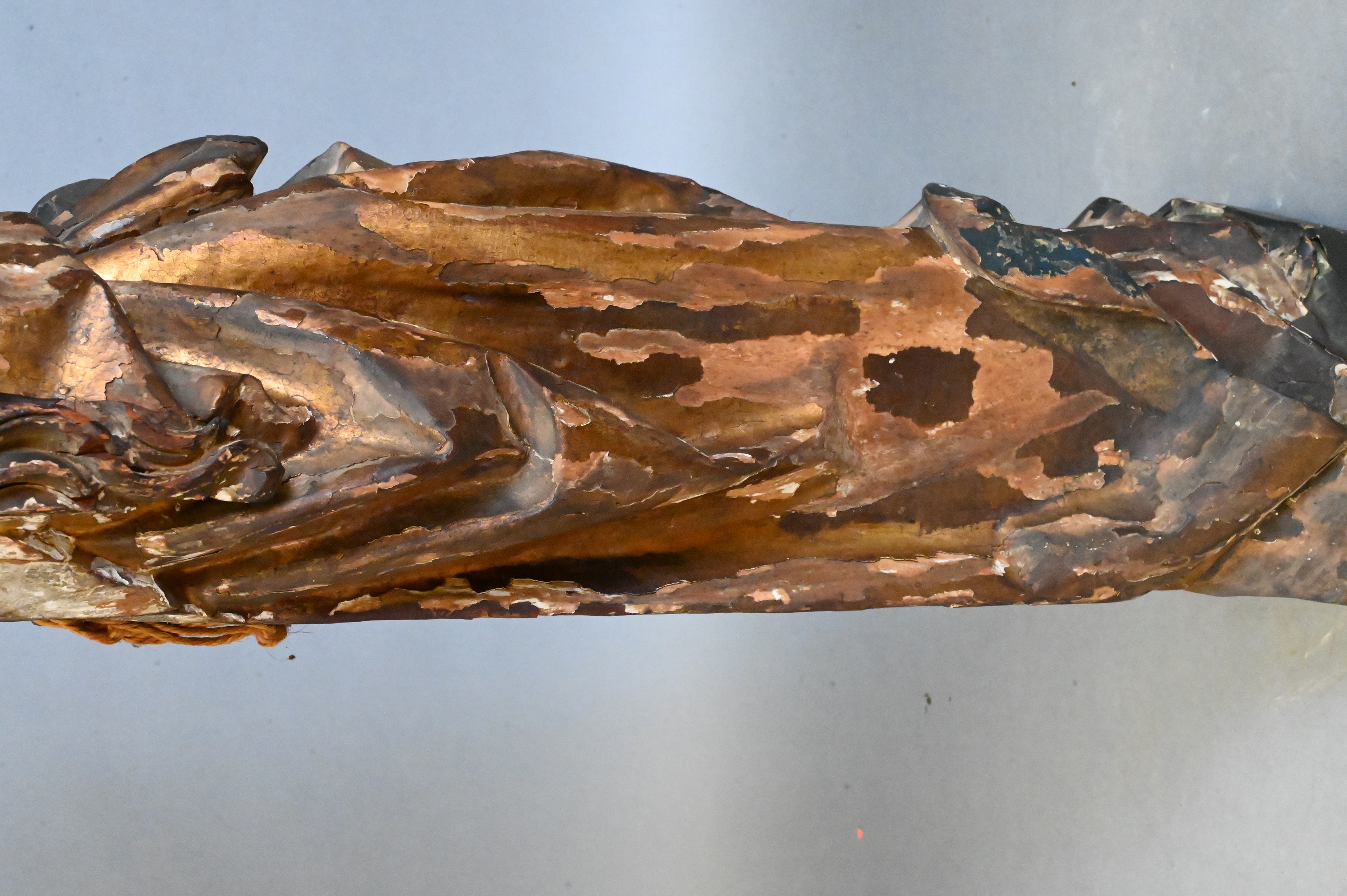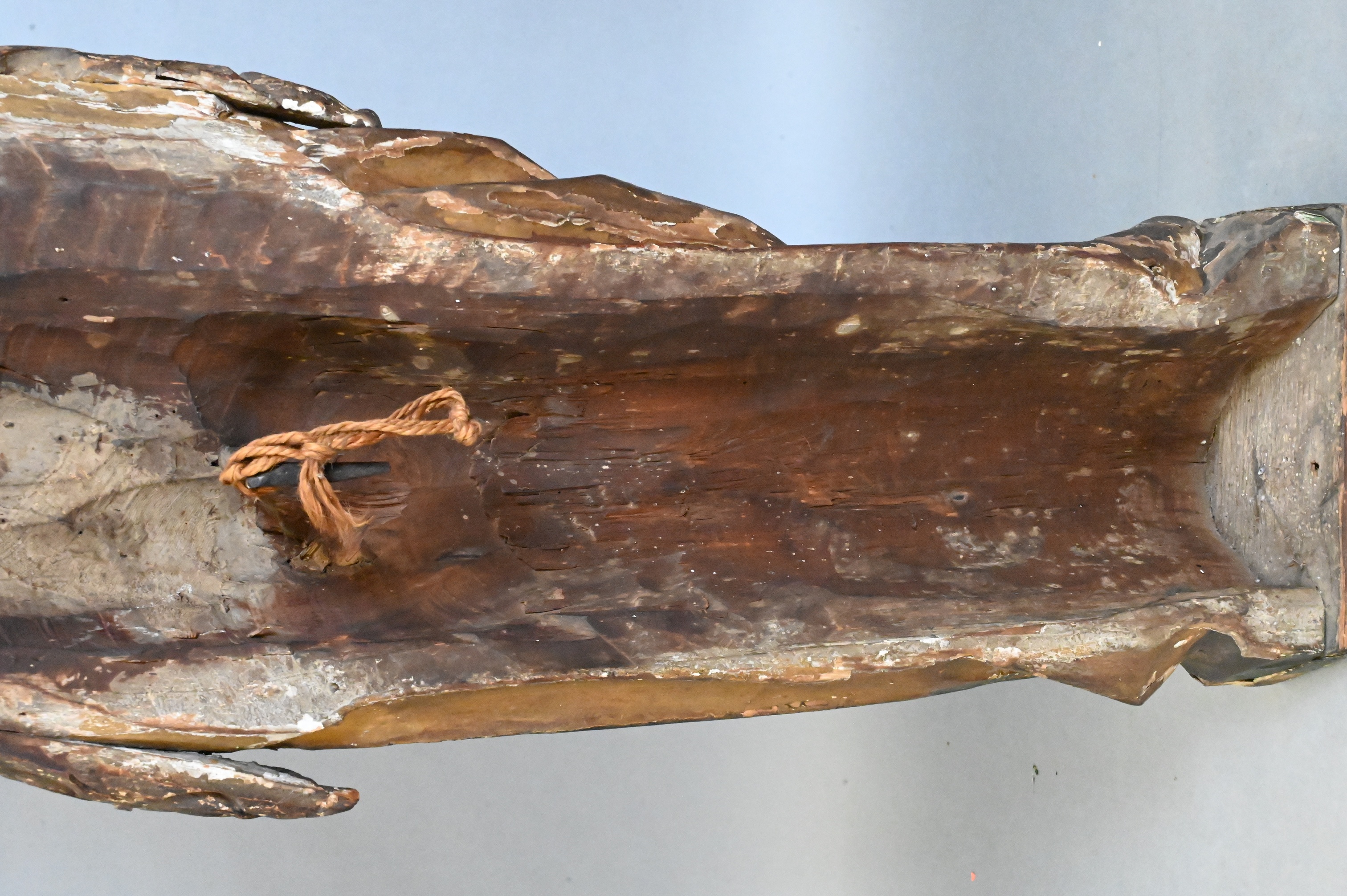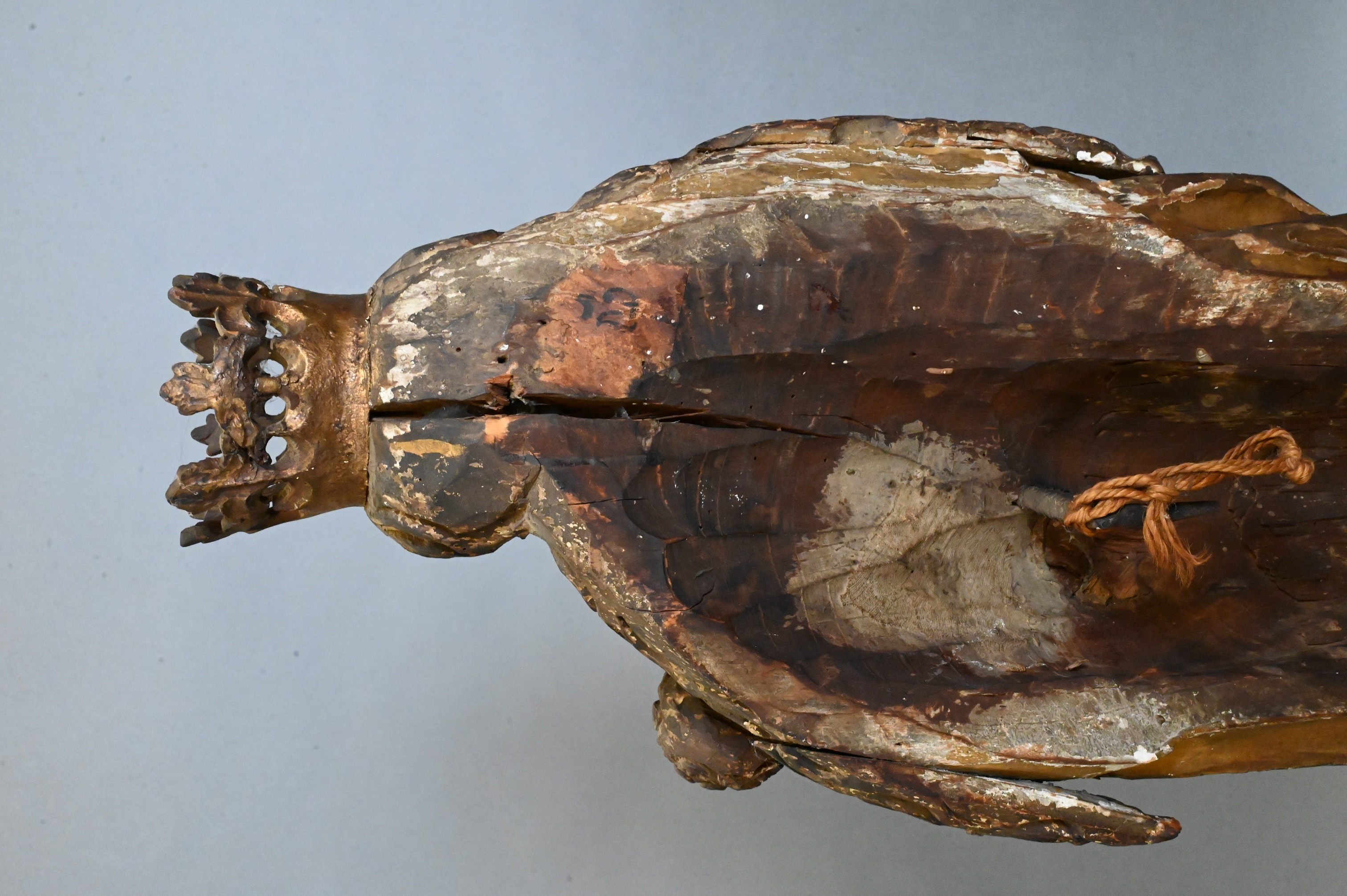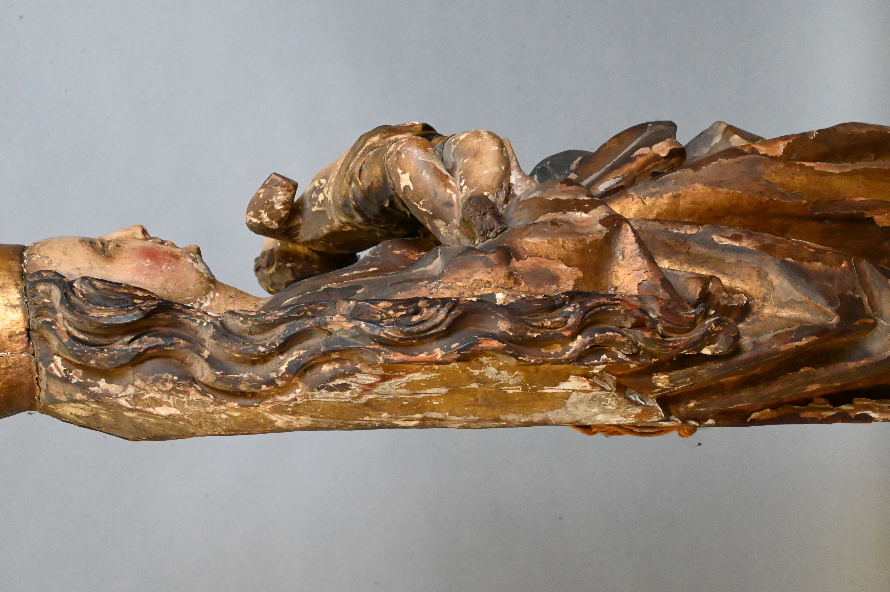 A carved and polychrome limewood figure of the crowned Virgin, shown standing and looking slightly downward, her long tresses falling over her shoulders. Her robe is carved in deeply cut V-shaped folds, and she holds the Christ Child in both hands. The Child holds an orb, The sculpture retains traces of original and later polychromy; over-painted in the 19th century.