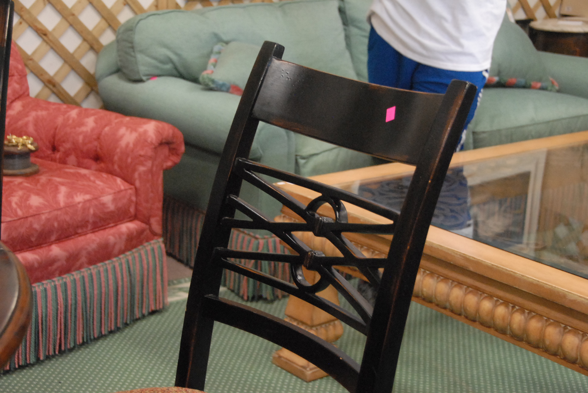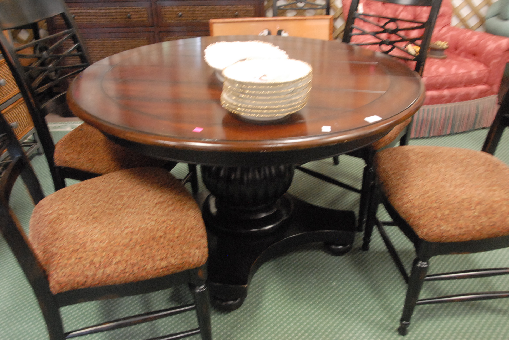 Lot 402: Seven piece dining set with round pedestal table with one 20 leave and 6 chairs, ht. 30 in. dia. 47 in.