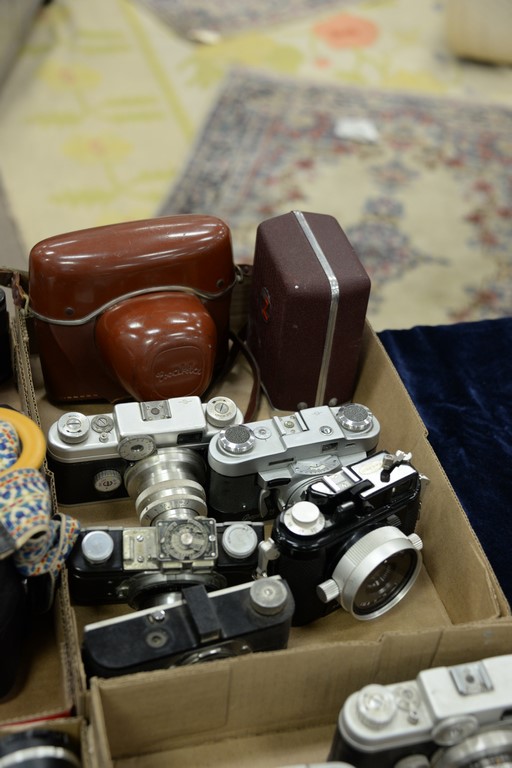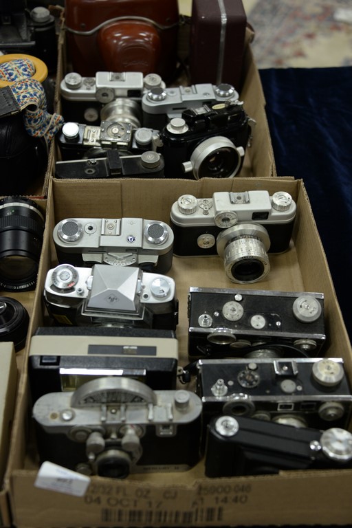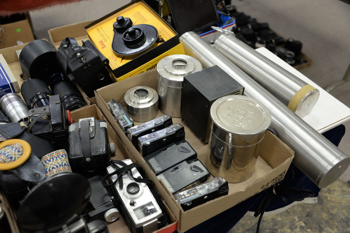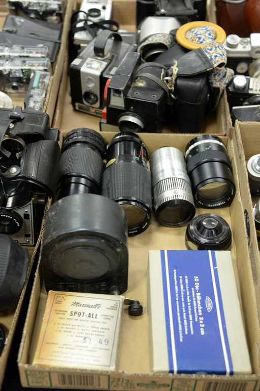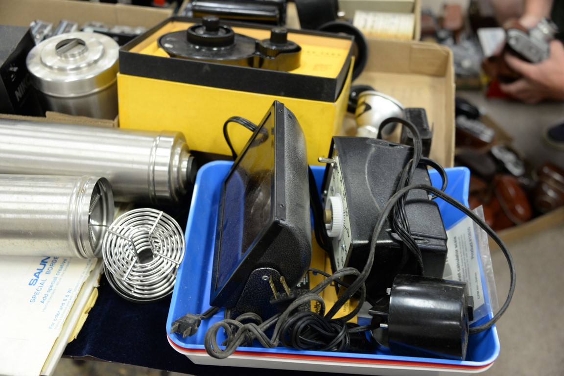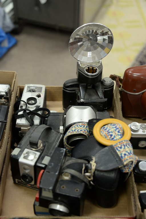 Lot 402: Six box lots: Camera and darkroom equipment lot to include miscellaneous cameras by Exakta, Nikoros, Graphic 352, Falcon, Mercury,…