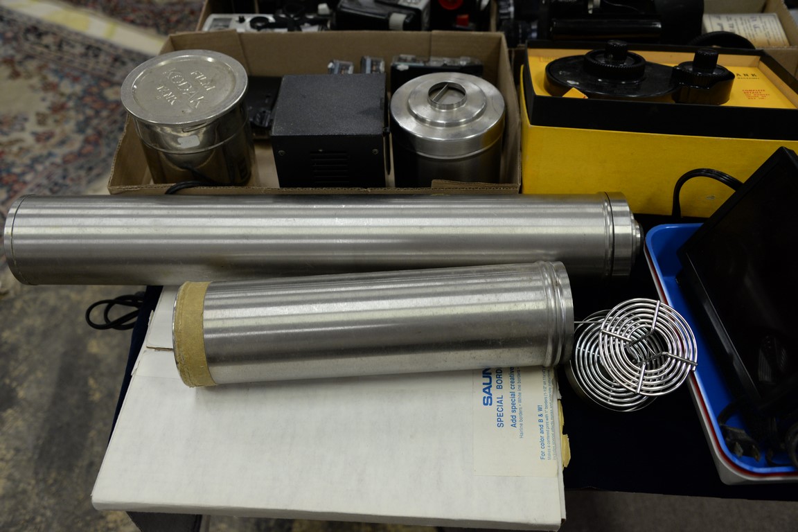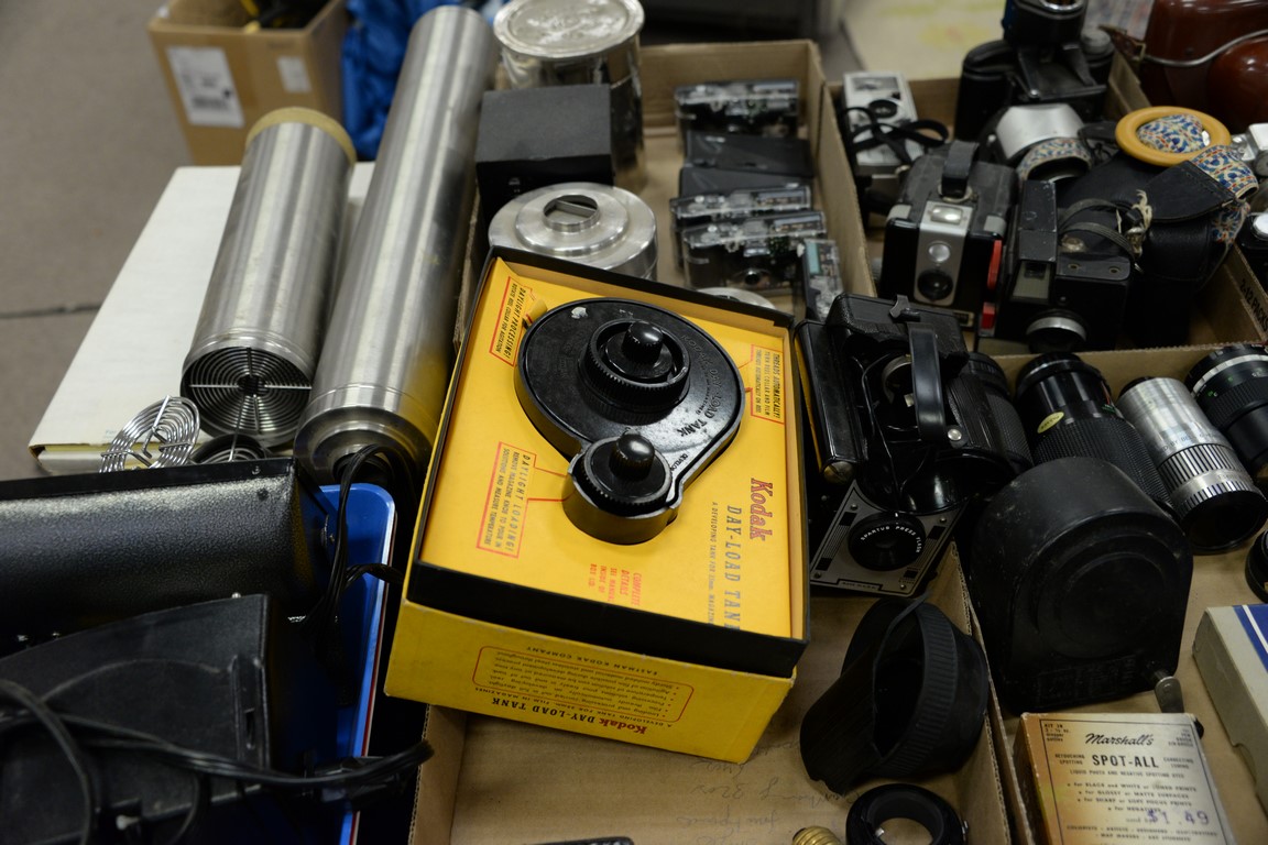 Six box lots: Camera and darkroom equipment lot to include miscellaneous cameras by Exakta, Nikoros, Graphic 352, Falcon, Mercury, Baldinette, Argus, and much more in addition to ss tanks, Safelite, trays, timers, daylight filk loaders, easel, and Nikon by Roller power supply for colorhead.