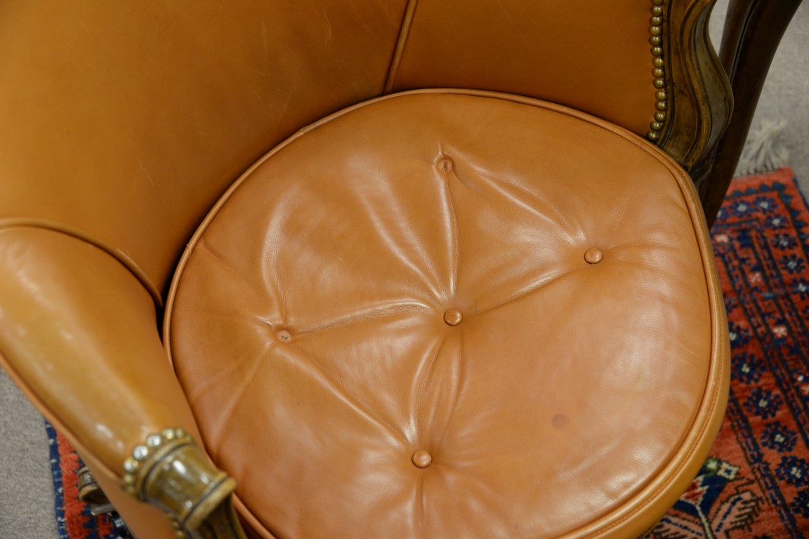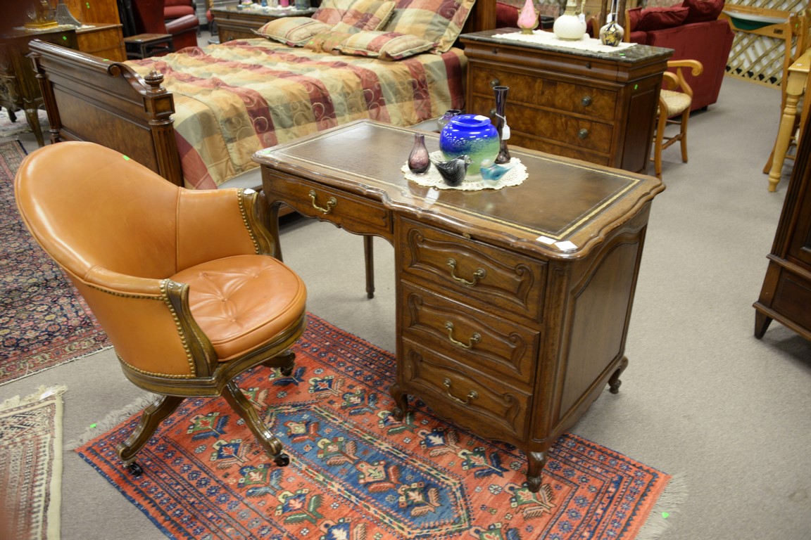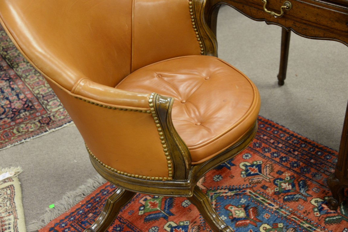 Two piece Don Rousseau lot including a Louis XV style desk with tooled leather top, ht. 30in, top: 22 x 43 and a leather swivel office chair.