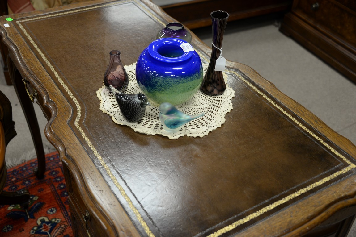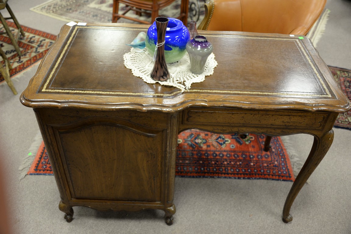 Lot 402: Two piece Don Rousseau lot including a Louis XV style desk with tooled leather top, ht. 30in, top: 22 x 43 and a leather swivel of…