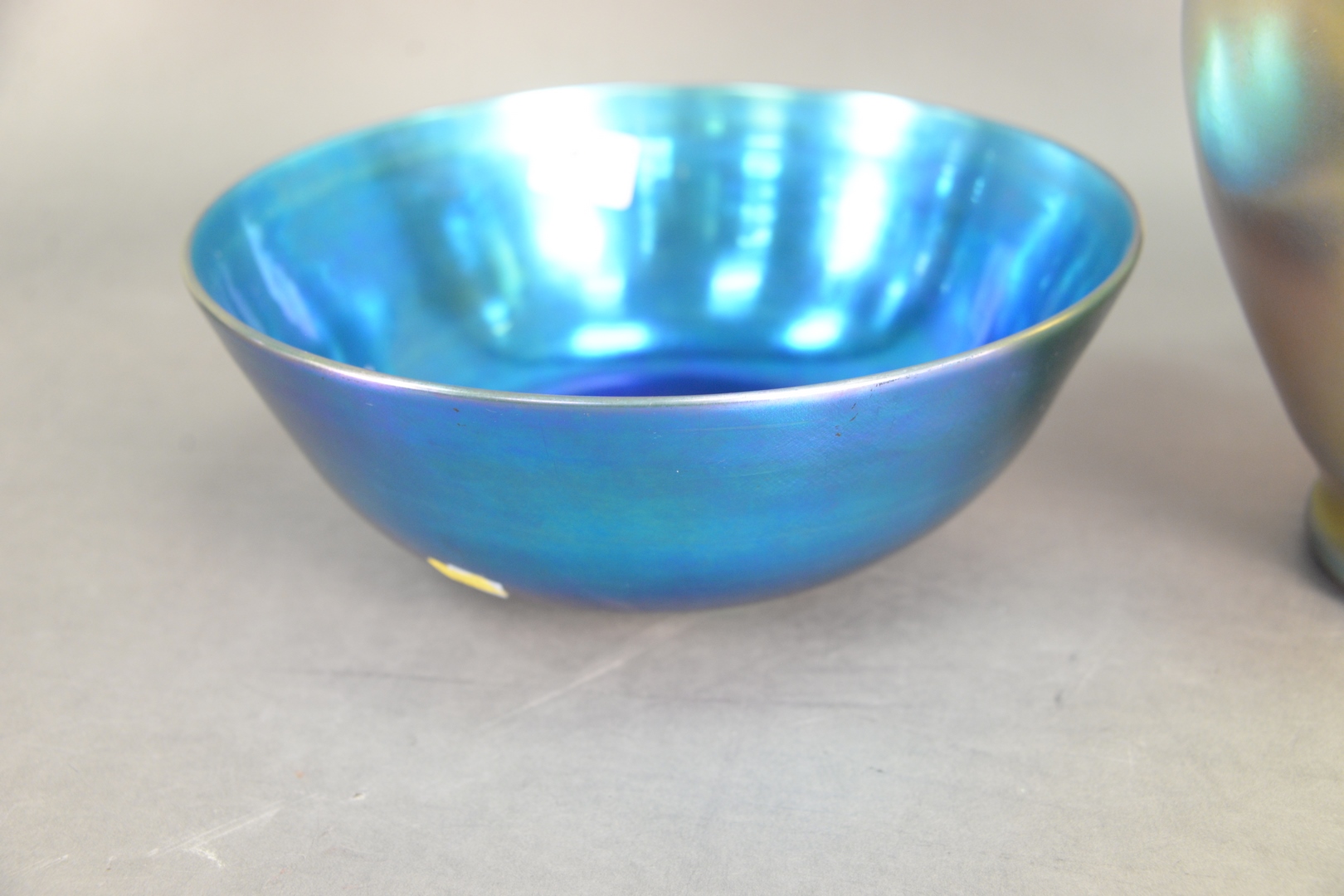 Two Steuben Art Glass Pieces, to include blue iridescent Steuben aurene glass bowl, having footed base, along with gold iridescent vase marked Aurene, (cracked), height 10 1/2 inches, diameter 11 5/8 inches.
