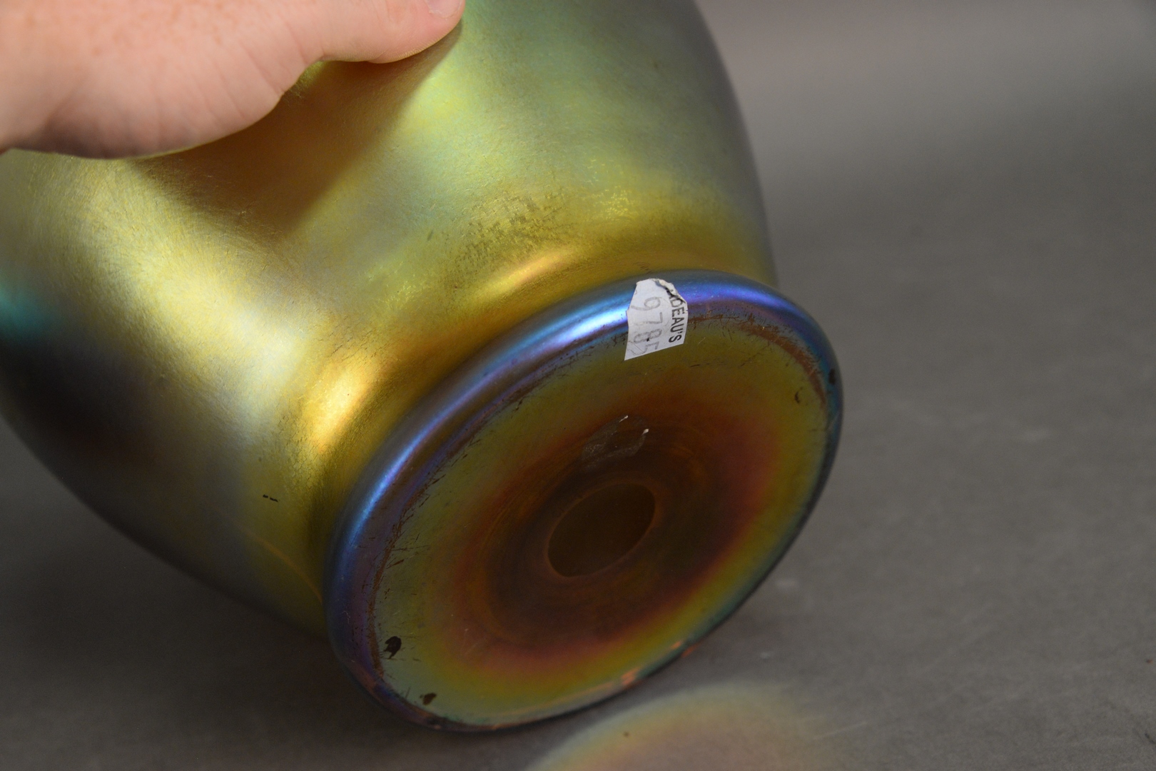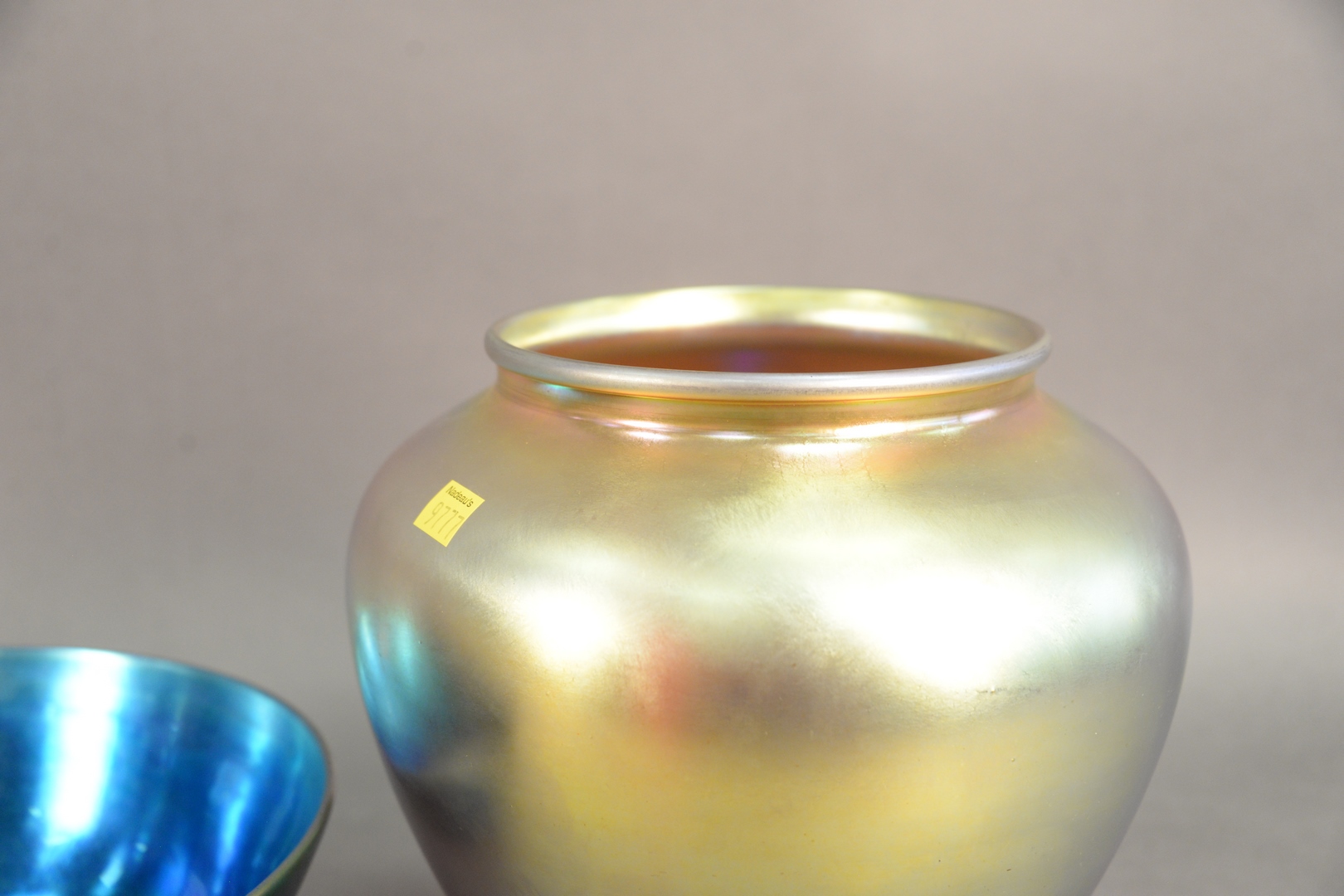 Lot 402: Two Steuben Art Glass Pieces, to include blue iridescent Steuben aurene glass bowl, having footed base, along with gold iridescent vase marked Aurene, (cracked), height 10 1/2 inches, diameter 11 5/8 inches.