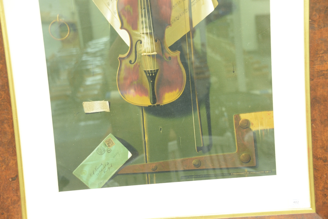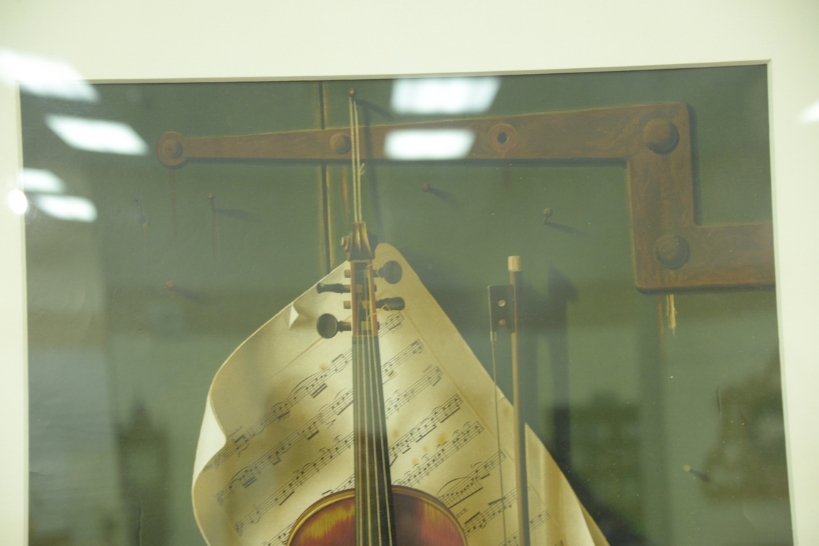 Lot 402: William Michael Harnet 1848-1892 chromolithograph The Old Violin-1887 Tromp L’oeil style, published by Frank Tuchfarber, 34 3/4…