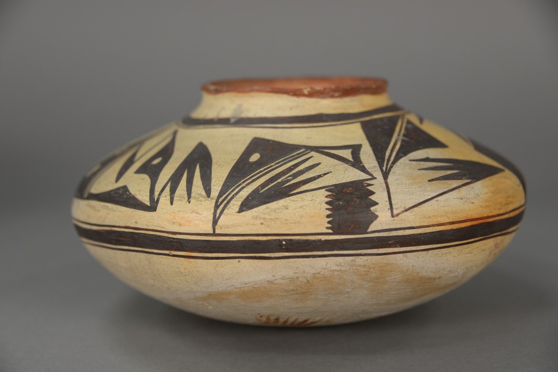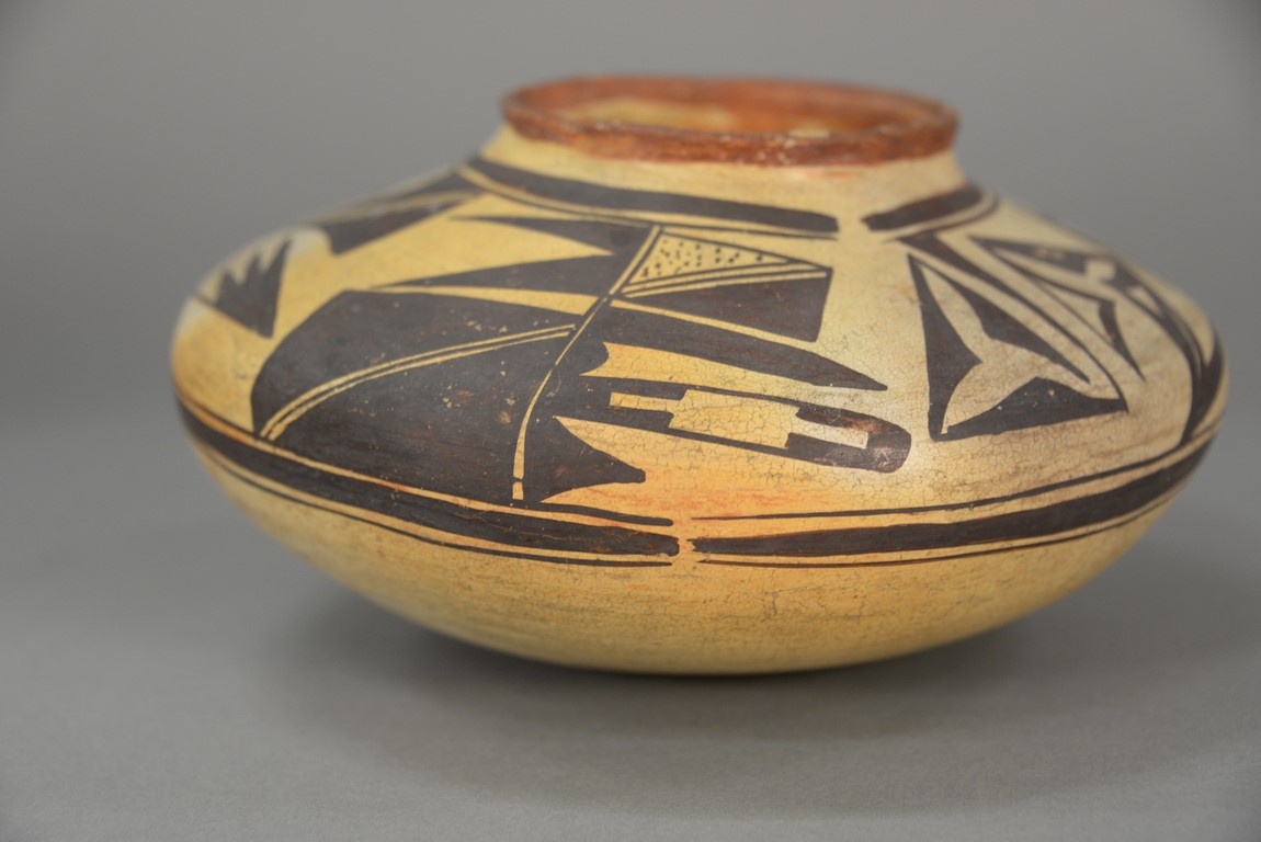 Acoma Pottery bowl/vase, brown decorated shoulders. ht. 4 in. opening dia. 3 in.