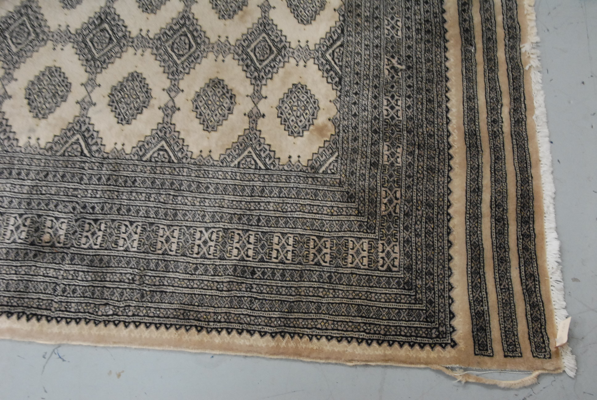 Black and white Bokhara Oriental rug, 9’1 x 12’2.