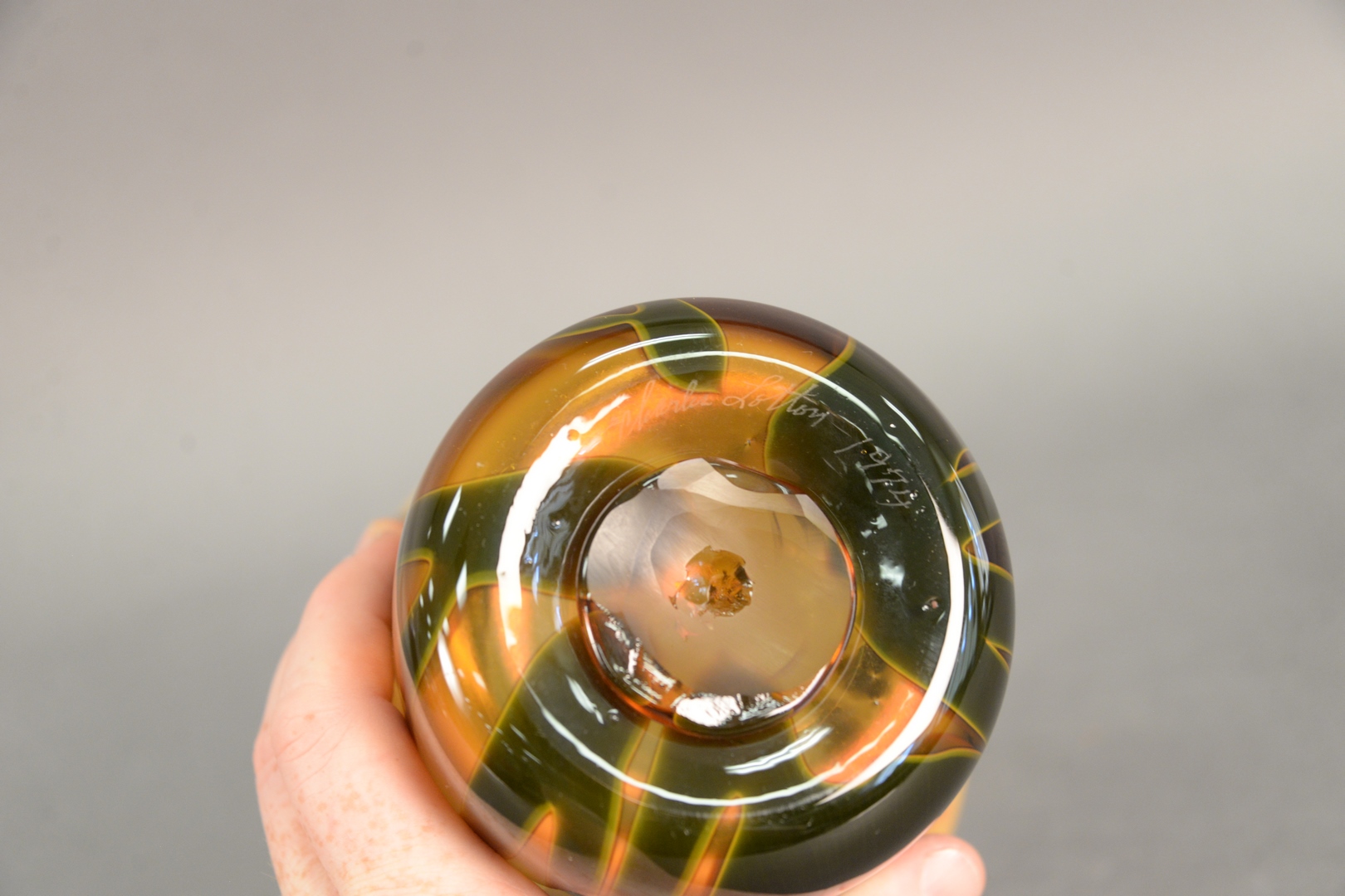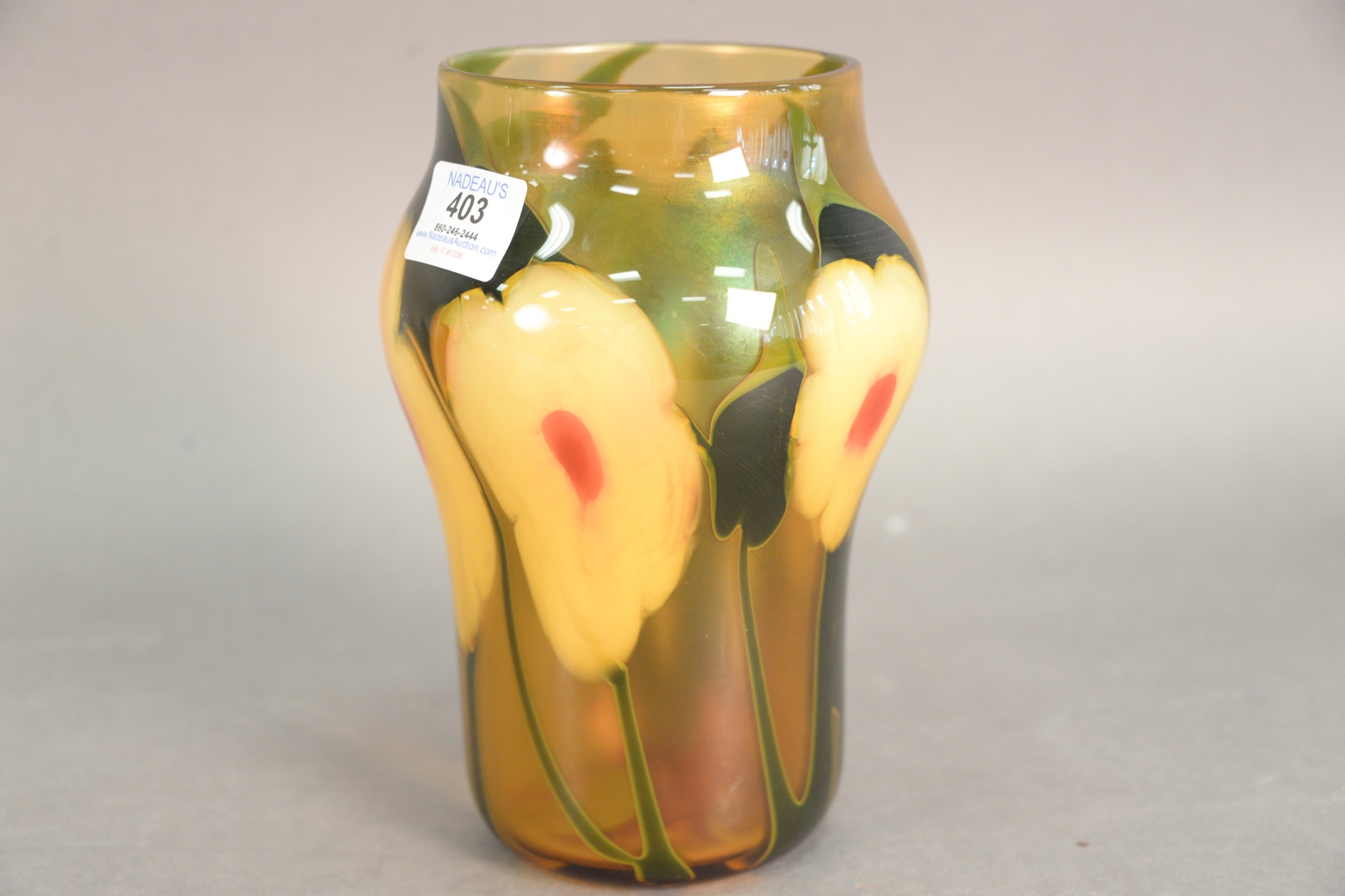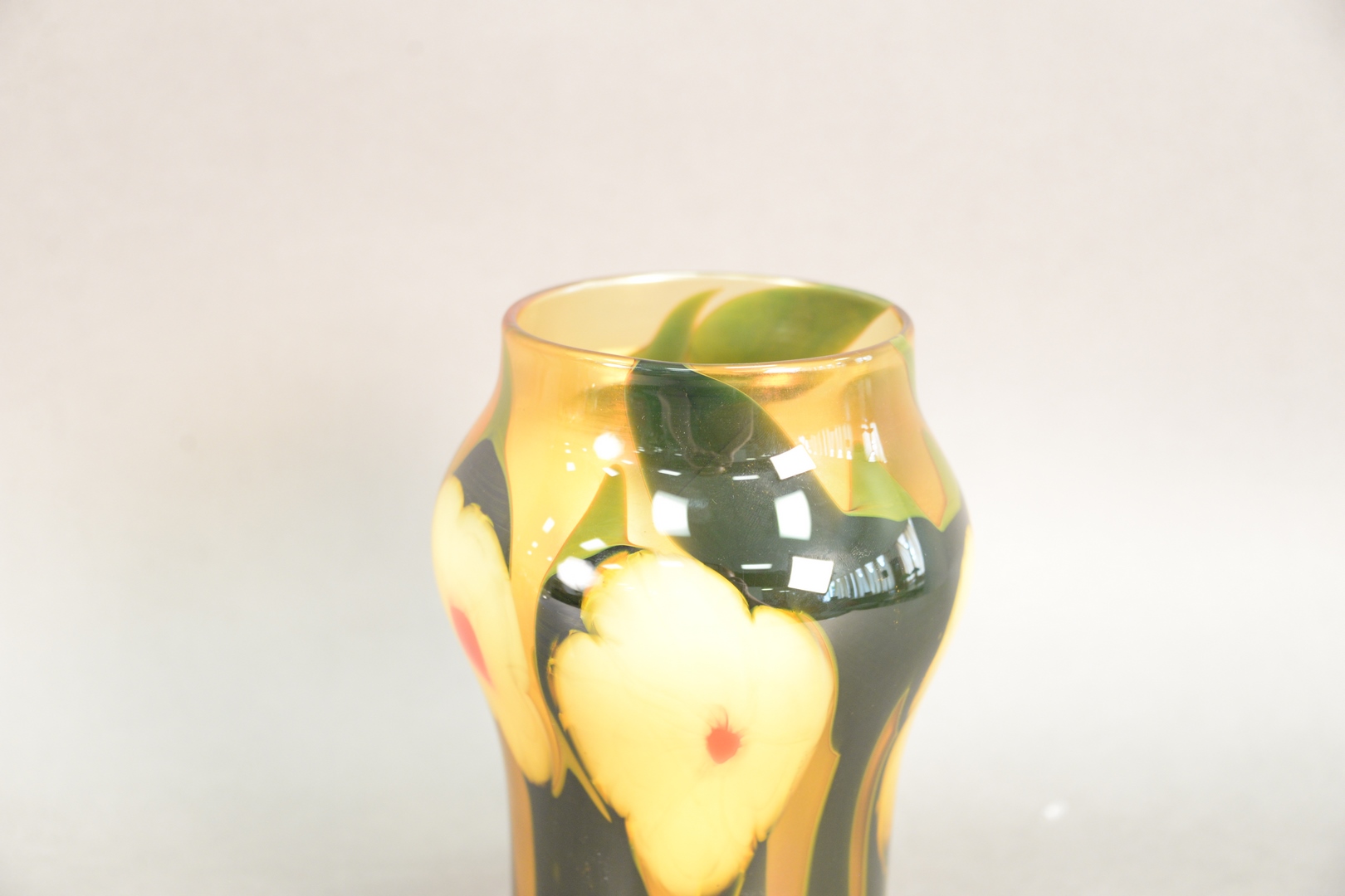 Lot 403: Charles Lotton Art Glass Vase, having yellow and red flowers, signed and dated to the underside “Charles Lotton, 1974”, height 8 1/2 inches, diameter 4 1/4 inches. Provenance: Estate of James Wadhams