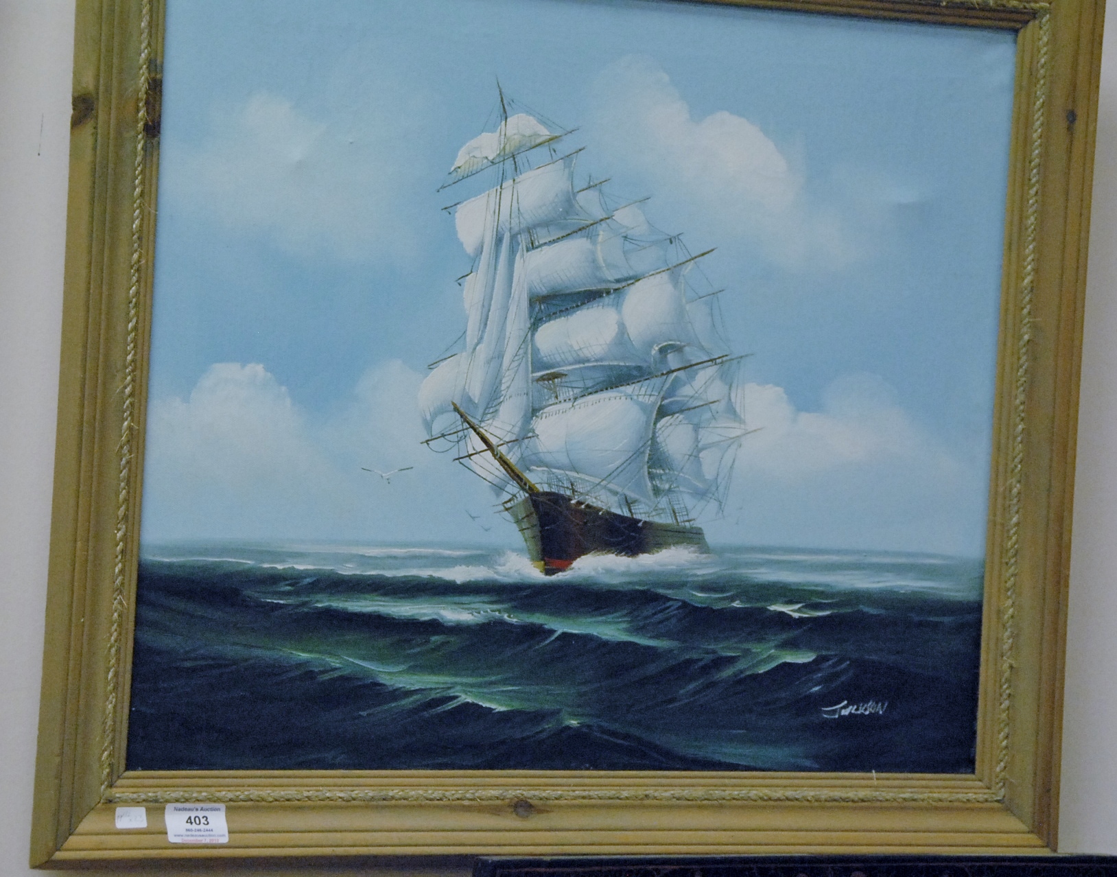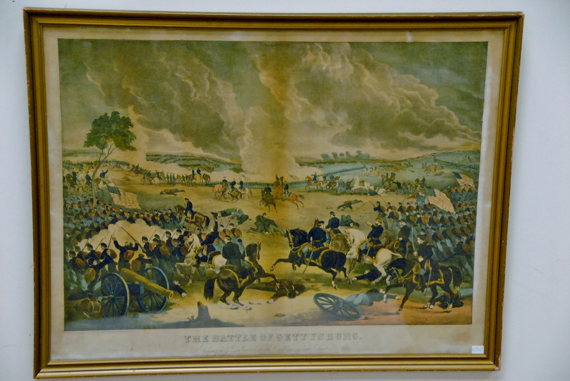 Lot 403: Five piece lot to include print of Battle of Gettysburg, oil on canvas of ship signed Jackson and three prints.