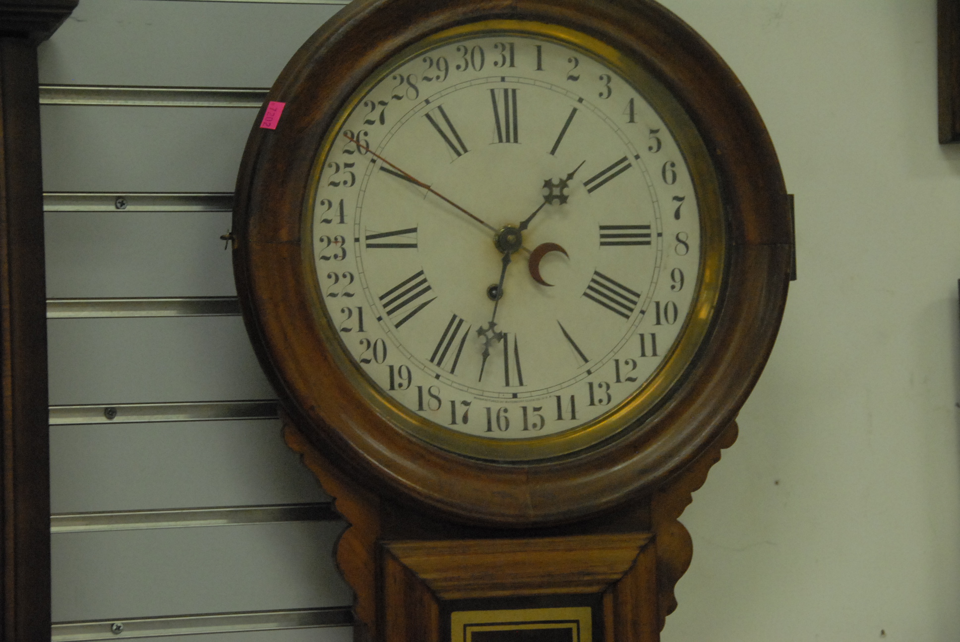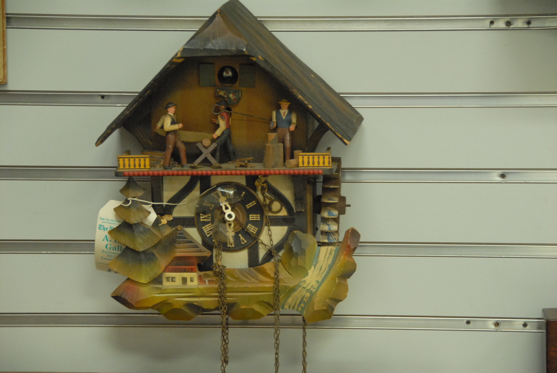 Four clocks including coo-coo clock, calendar regulator clock, and two regulator clocks.