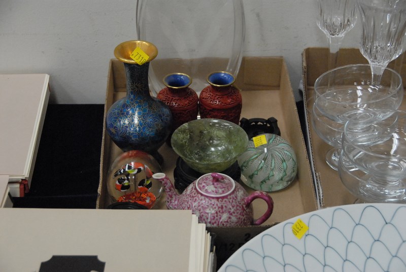 Lot 403: Group of Asian books, large charger, small hardstone cup on stand, cloissonne vase, two cinnabar vases, tea pot, and glass vase.