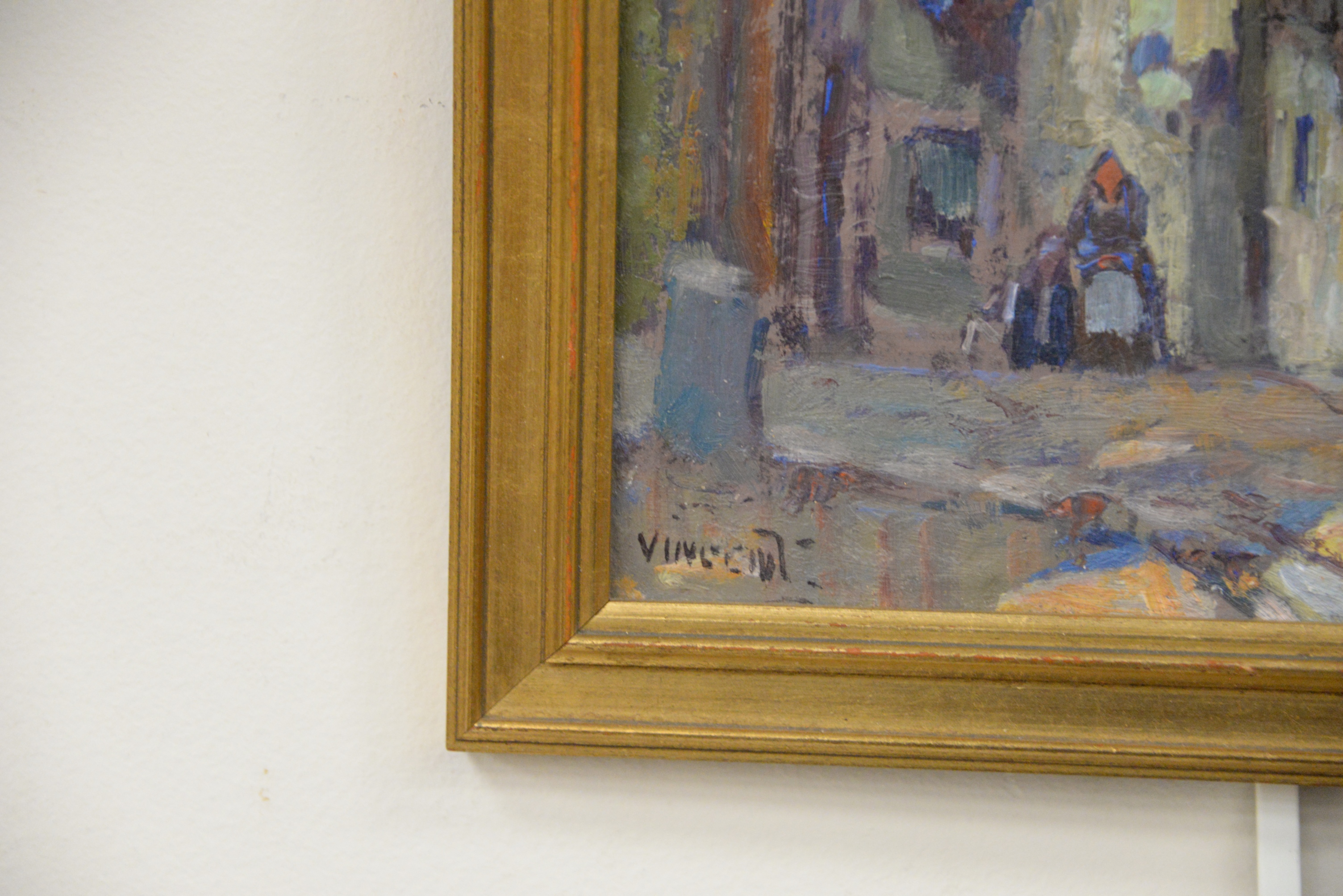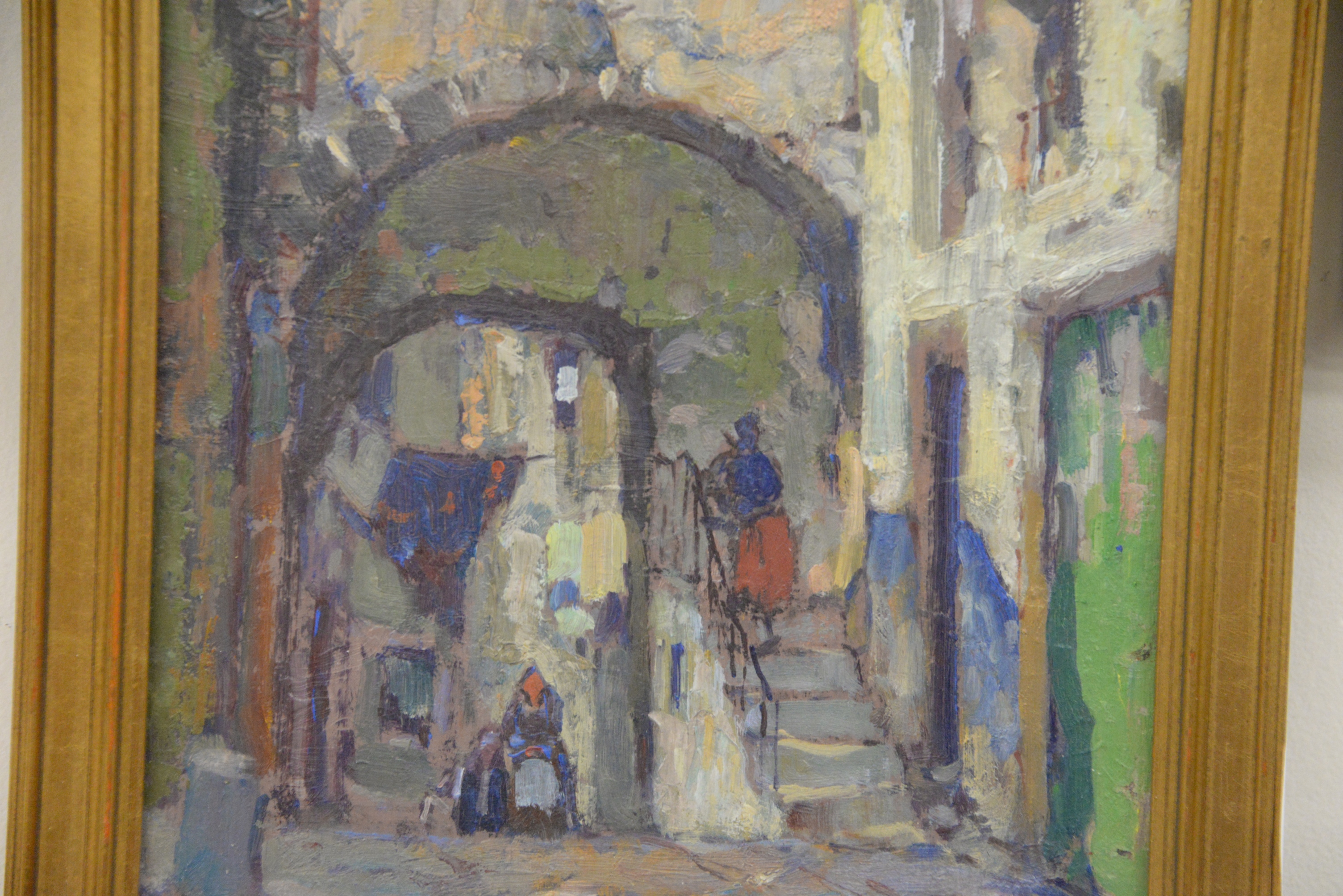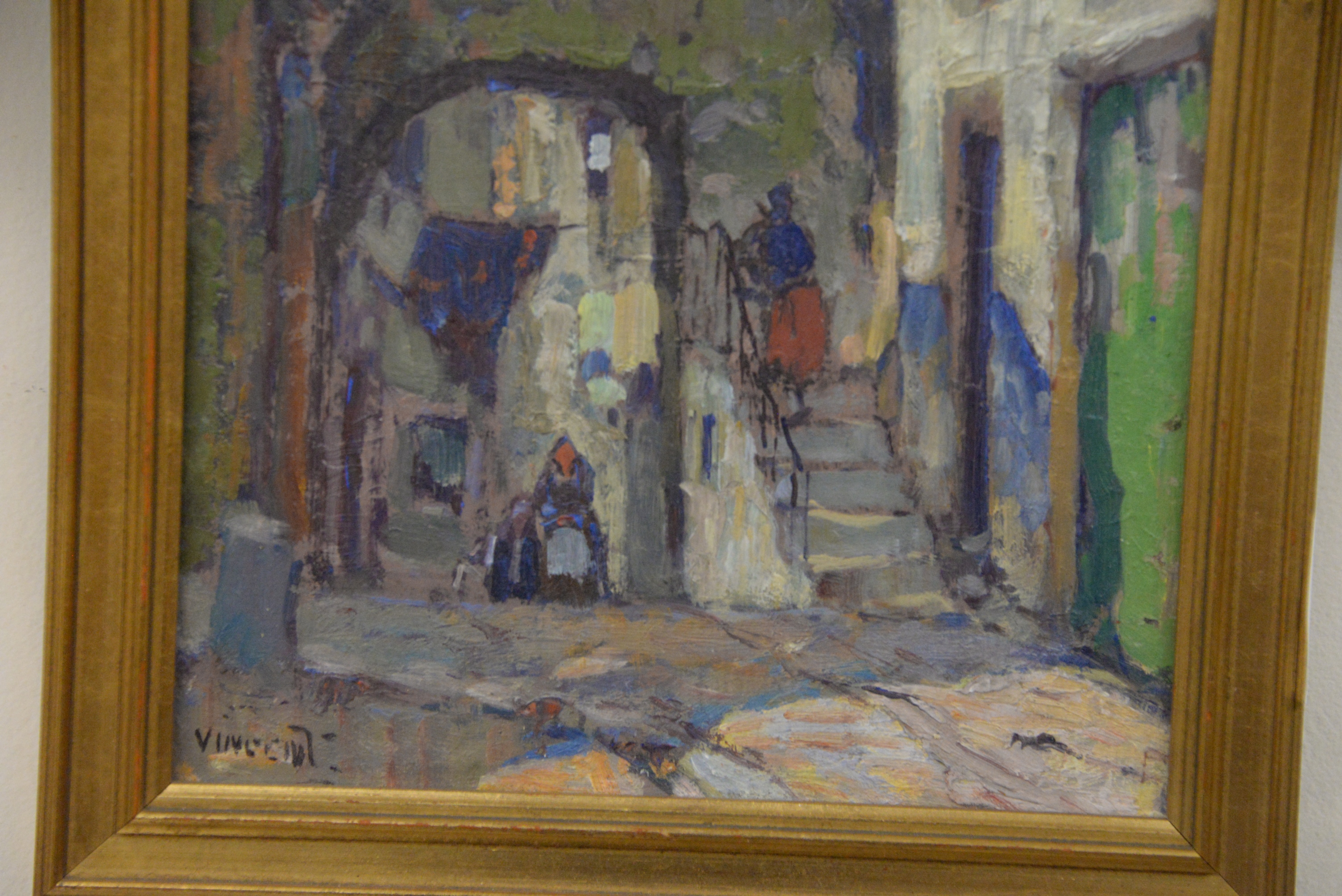 Harry Aiken Vincent (American Impressionist, 1864 – 1931) French alley streets oil on board signed lower left “Vincent” 9 1/2″ x 8″.
