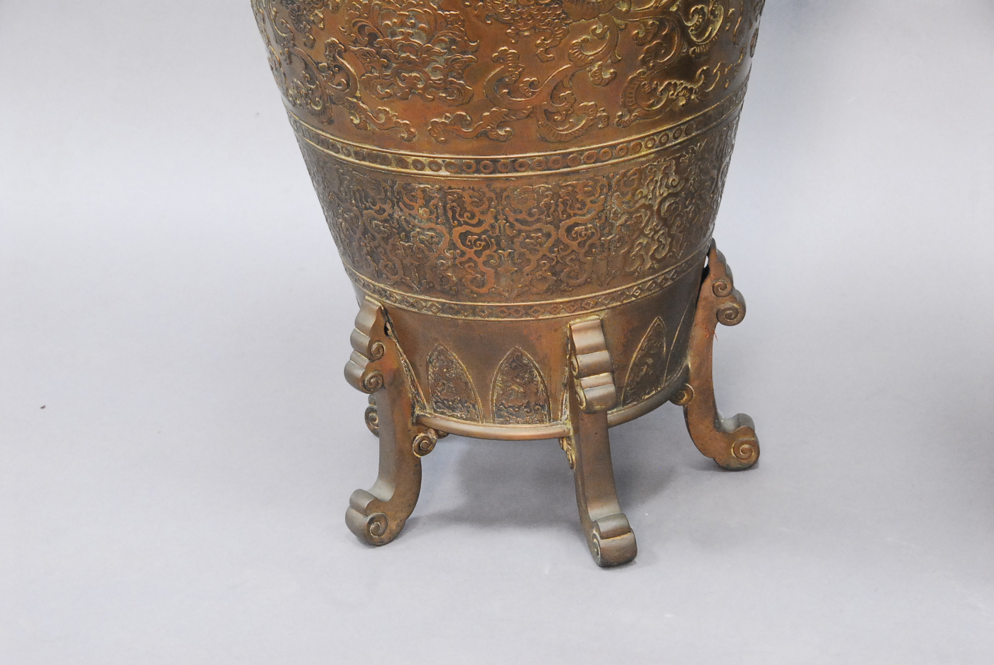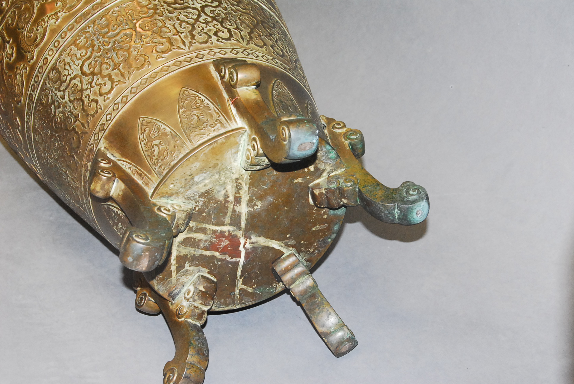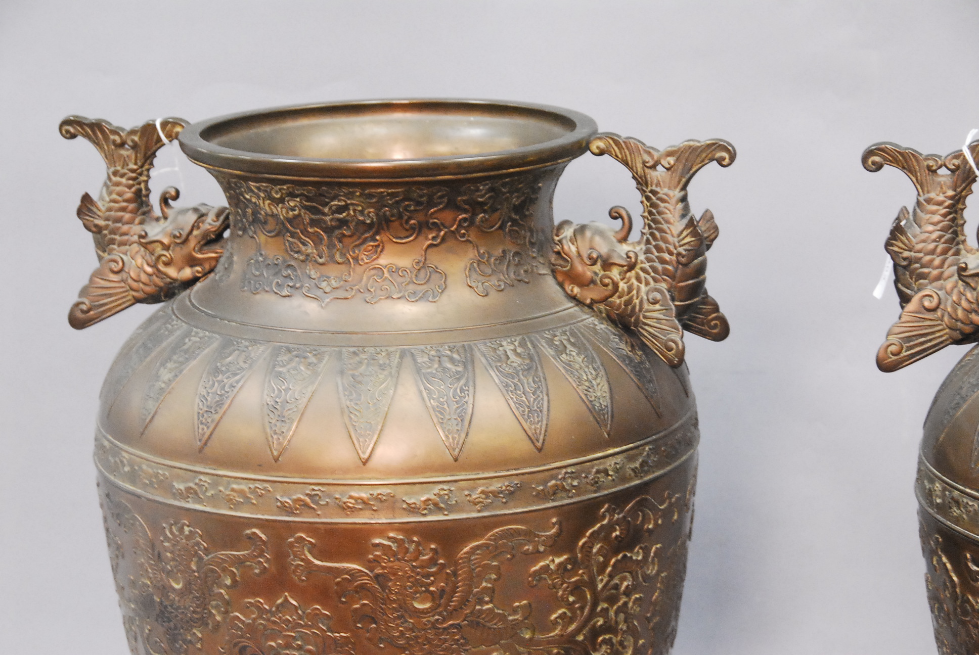 Lot 403: Large pair of brass baluster form phoenix bird urns having molded phoenix decoration around the exterior, dragon fish handles, and f…