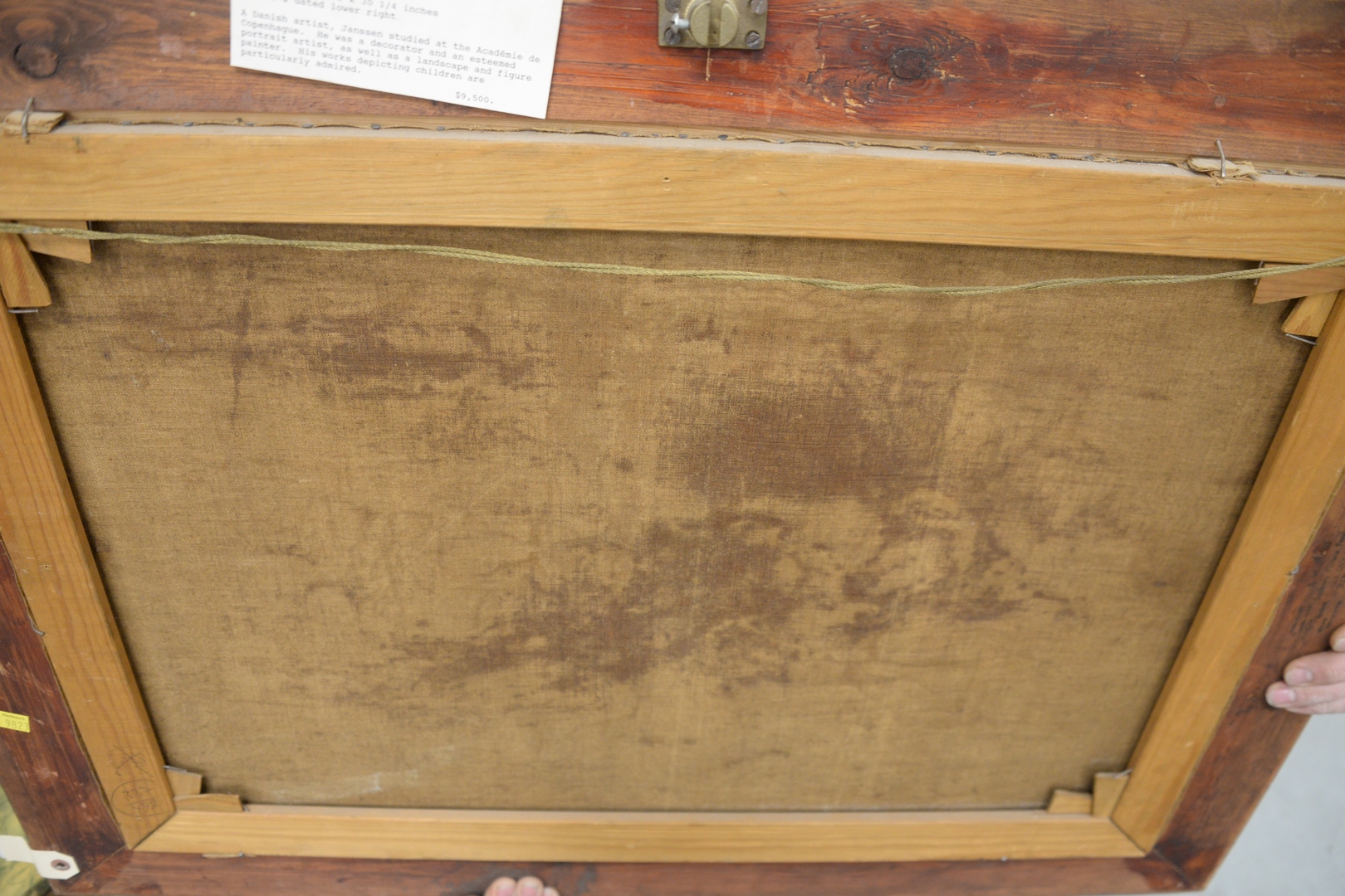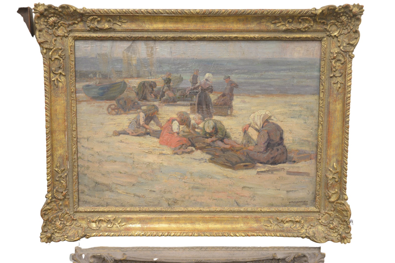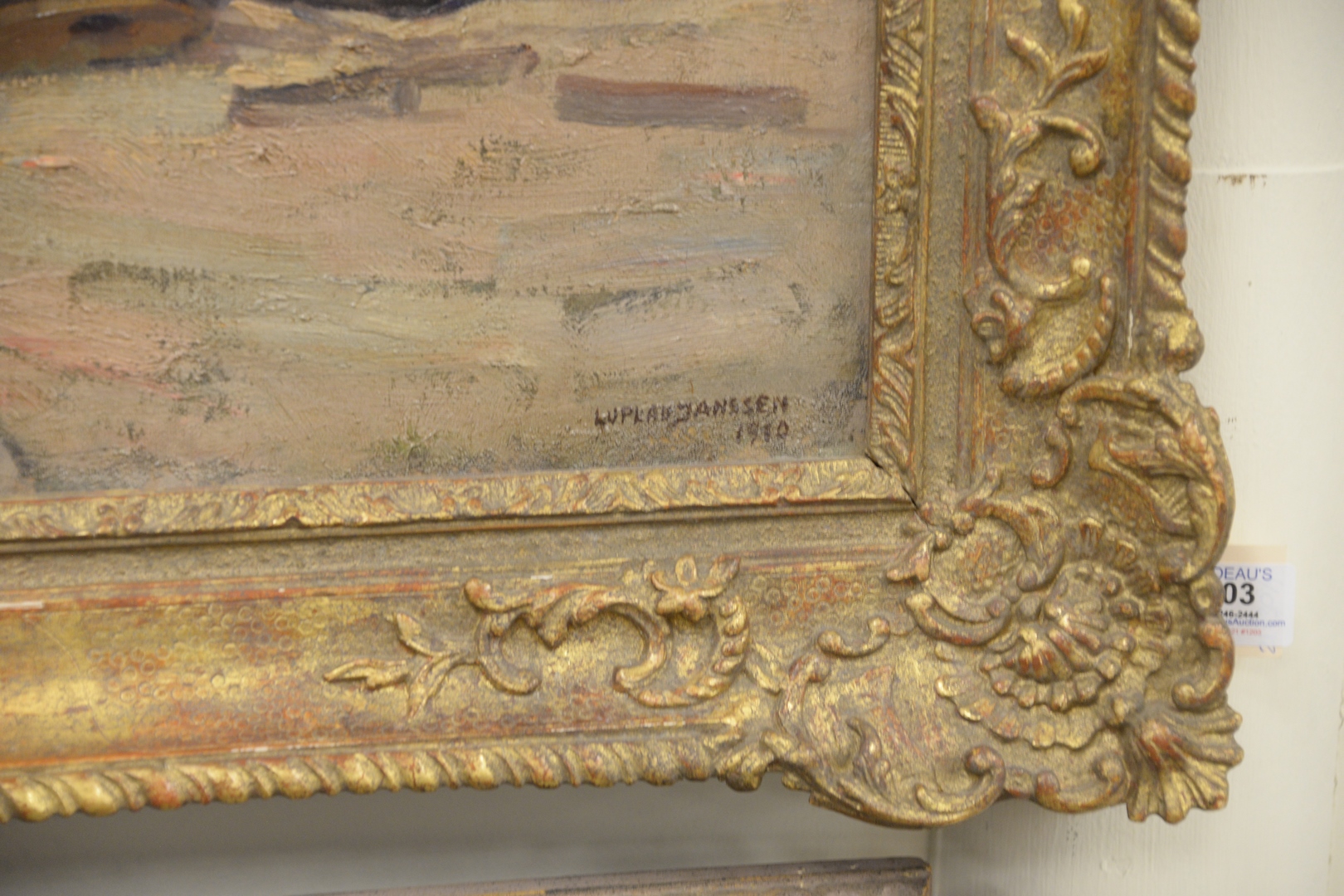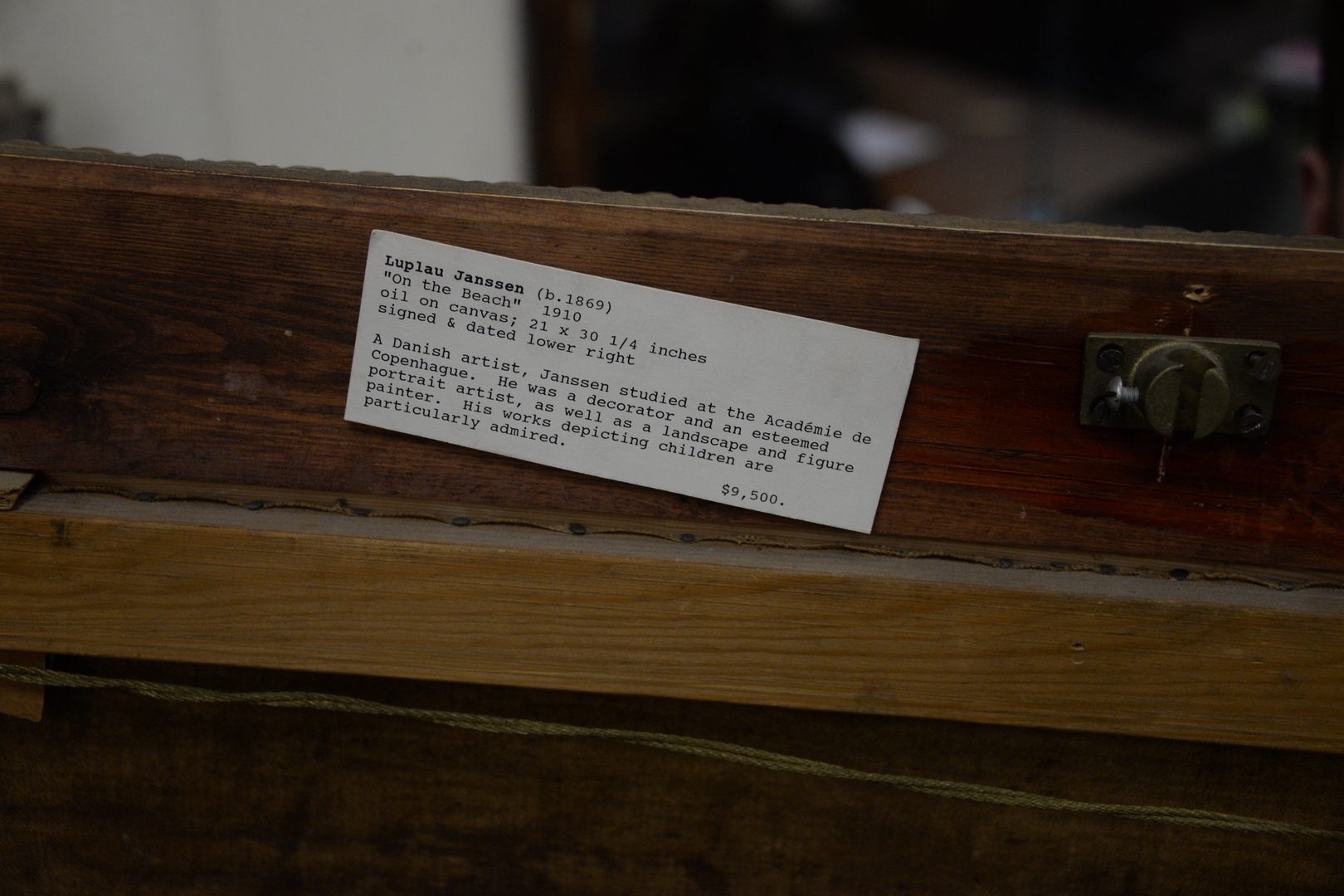 Lot 403: Luplau Janssen Danish, 1869 – 1927, beach scene with ships and figures, 1910, oil on canvas, signed and dated lower right Luplau Janssen, 1910, 21 x 30 1/2. Provenance: The Edward C. Cohen Gallery Acquired by the present owner, November 1988.