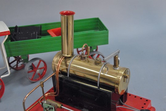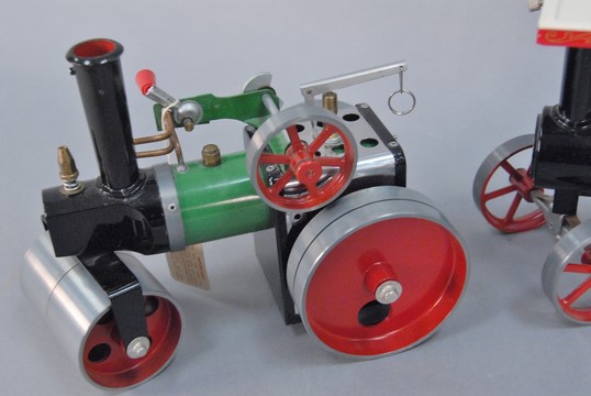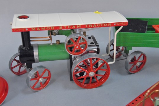 Mamod Steam tractor engines TE1A and SR1A with trailer and cover and a twin cylinder steam engine S.E.3.