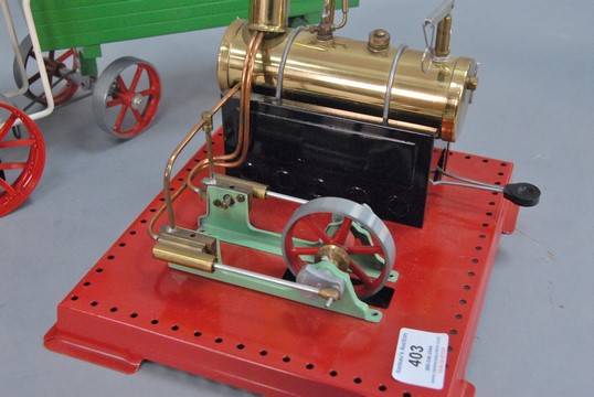 Lot 403: Mamod Steam tractor engines TE1A and SR1A with trailer and cover and a twin cylinder steam engine S.E.3.