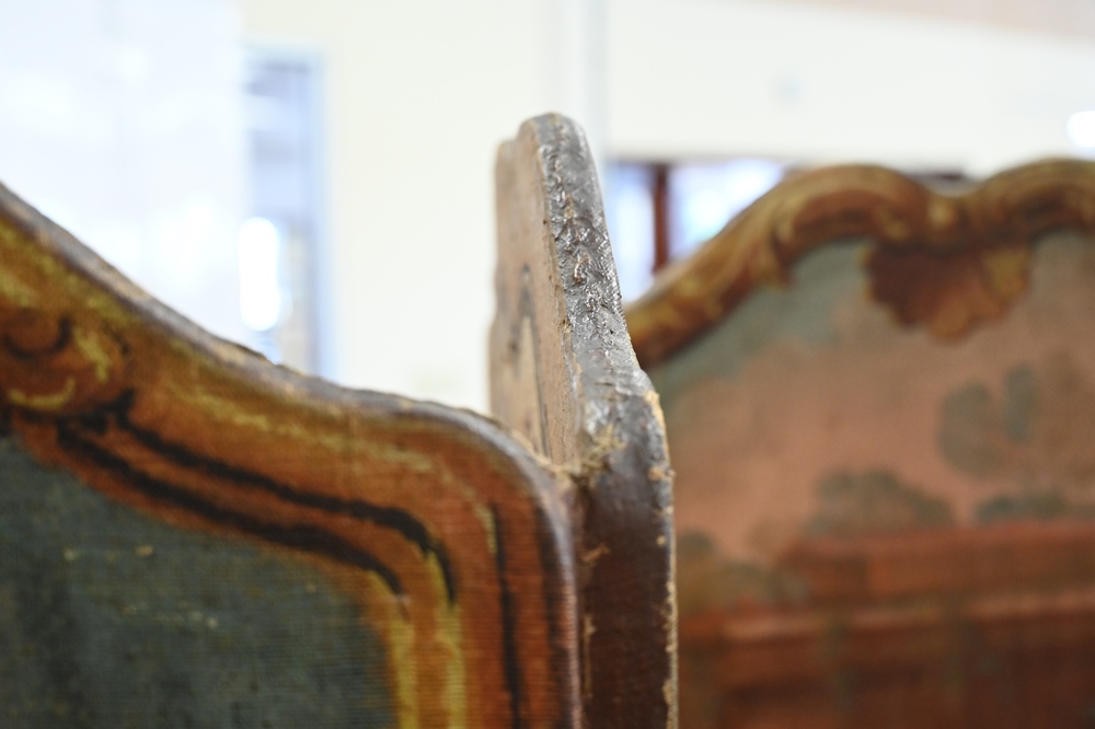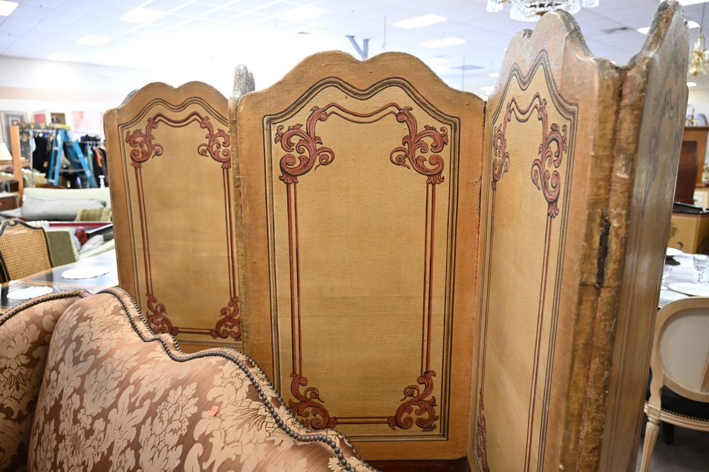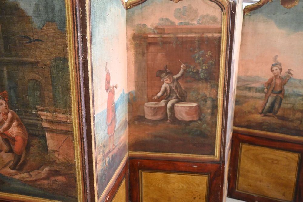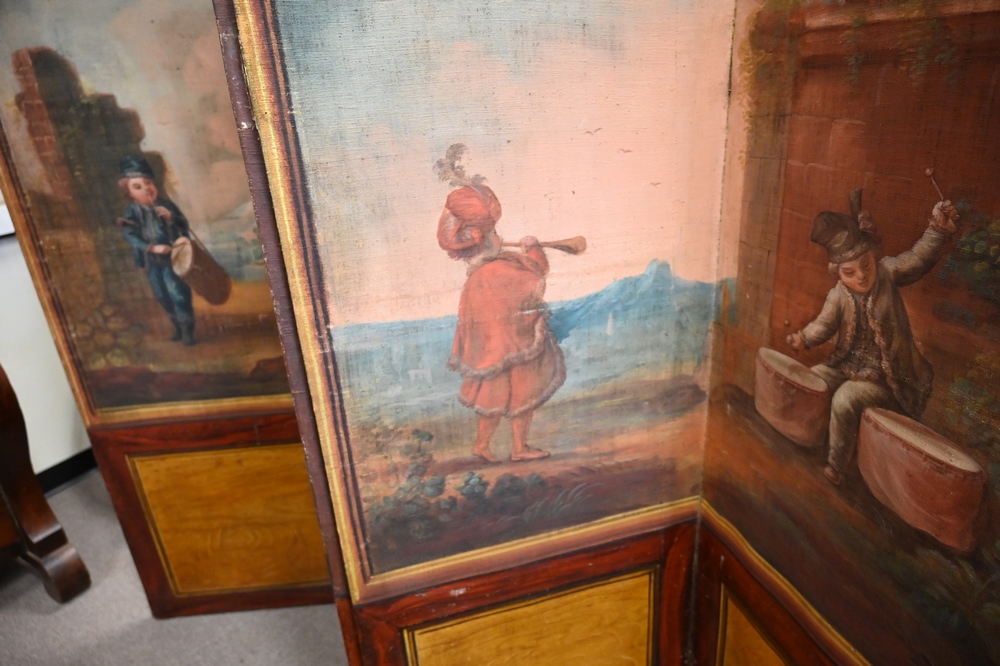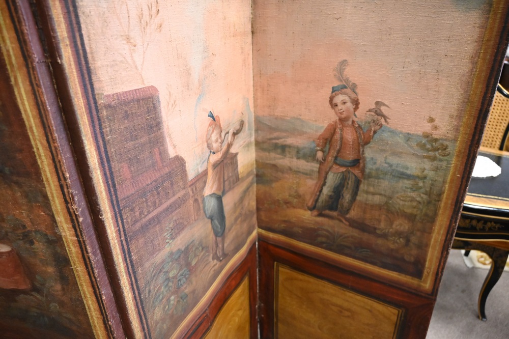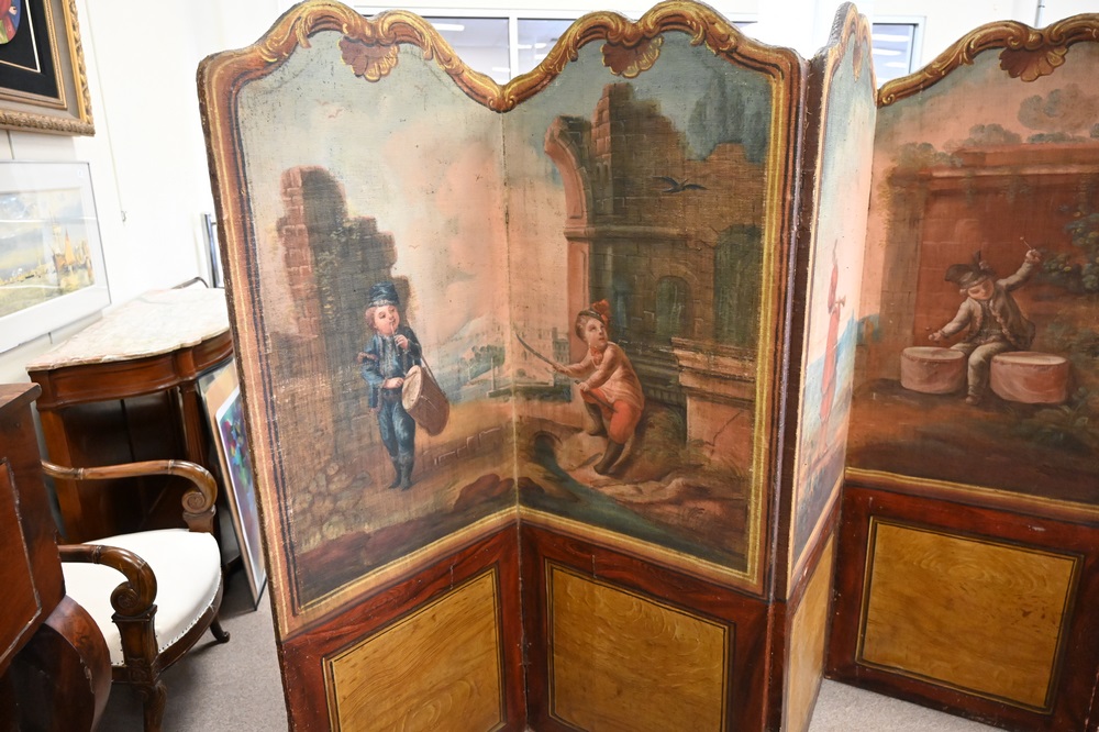 Lot 403: Six Fold Continental Canvas Dressing Screen, tops depicting children playing instruments, height 68 inches, width 12 feet.