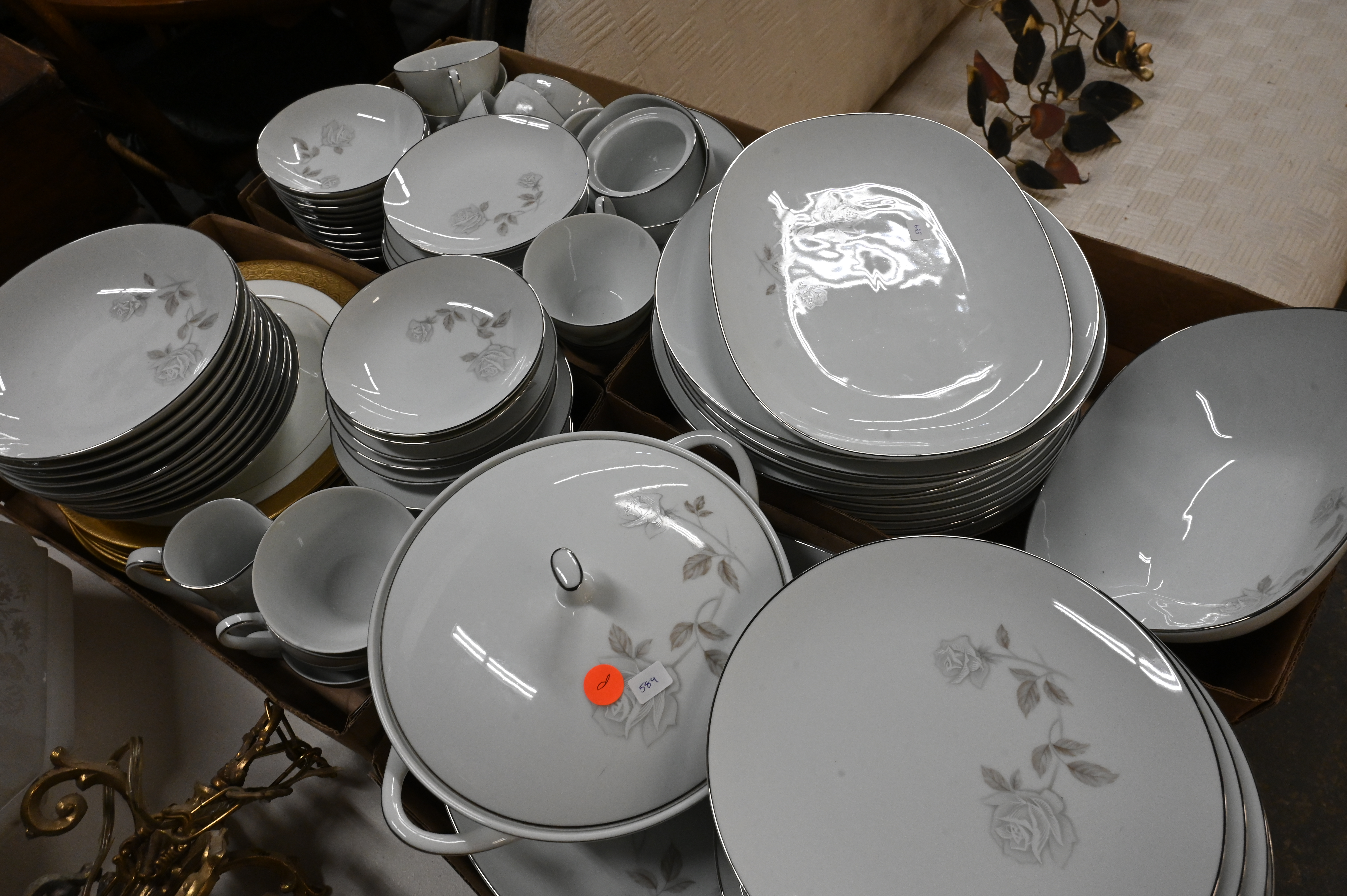 to include bohemian gilt glass decanters and stems, floral vase, Royal Doulton small plates, continental figural clock, teacups, underplates