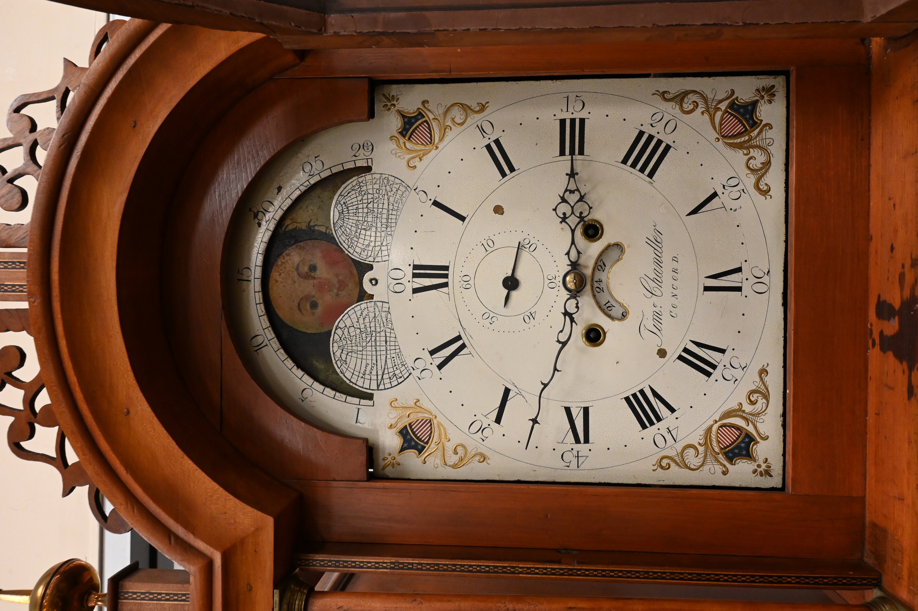 having three brass finials, fretwork top over tombstone door over long door flanked by fluted 1/4 columns all set on bracket base, painted metal dial with moonphase and ship with second hand, calendar, and American shields signed Tim Chandler Concord