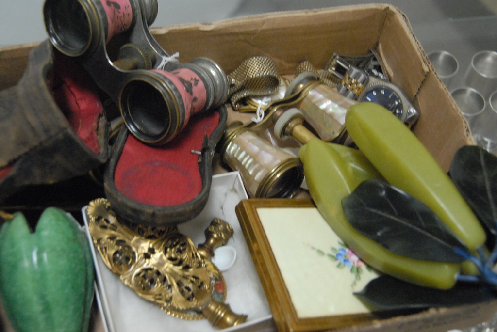 Two box lots several badges and medals, brass keys, two pairs of opera glasses one having pink enameling, carved nut, three wristwatches, alabaster fruit, etc.
