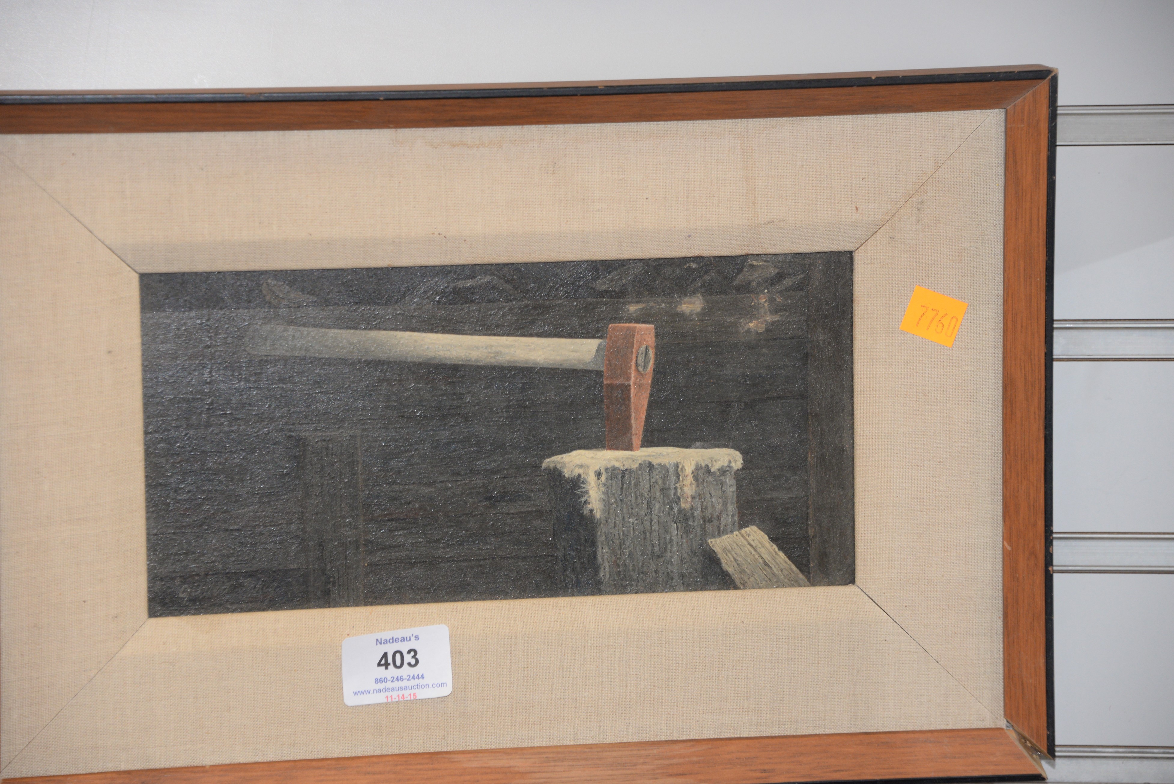 Lot 403: Two framed paintings including Gilbert Fahey oil on board Ax in a Log signed lower left Gilbert Fahey 4 3/4 x 9 3/4 and C.M. Ellio…