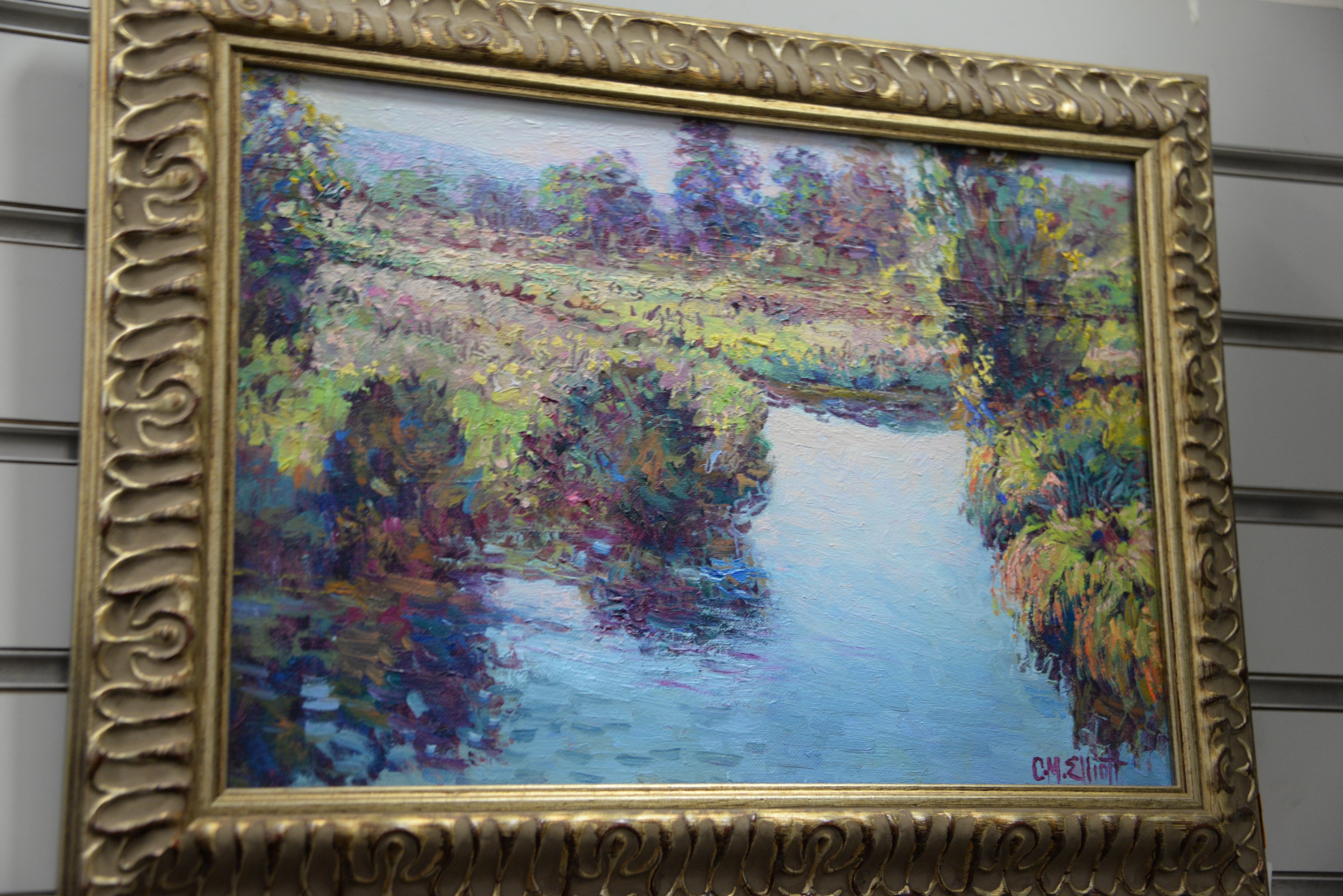 Two framed paintings including Gilbert Fahey oil on board Ax in a Log signed lower left Gilbert Fahey 4 3/4 x 9 3/4 and C.M. Elliott oil on canvas Spring Stream 9 1/2 x 13 1/2.