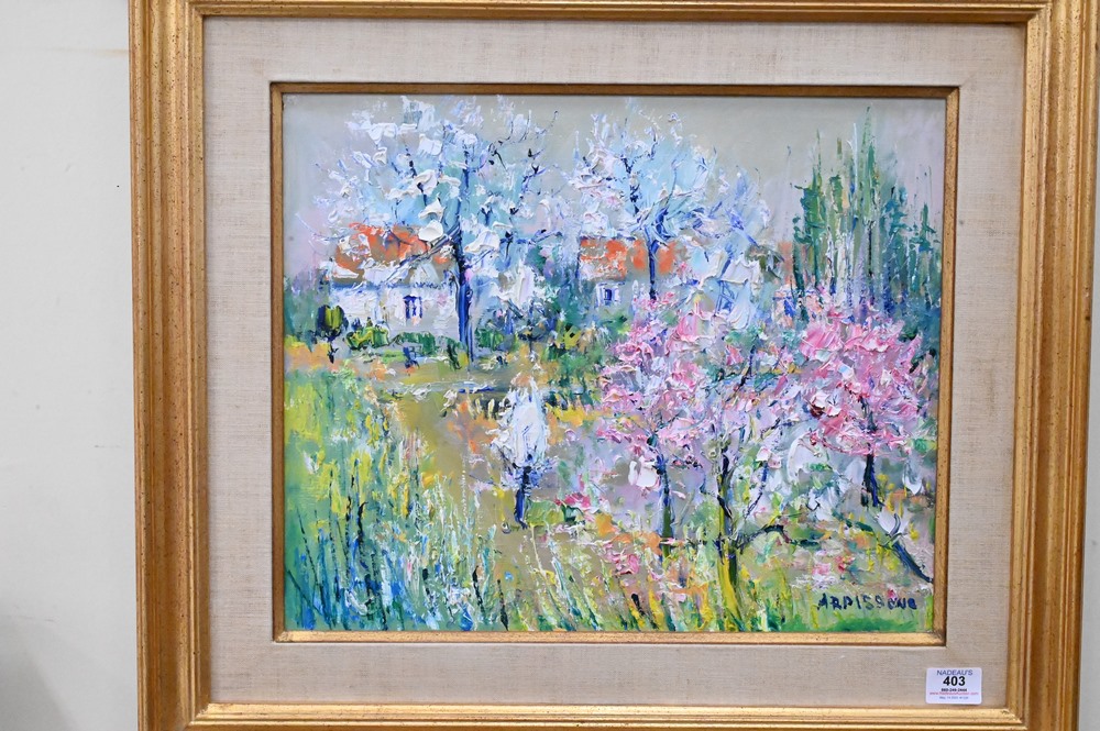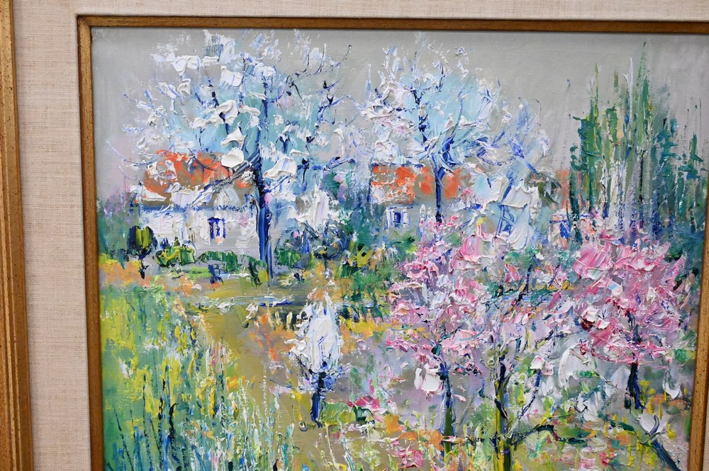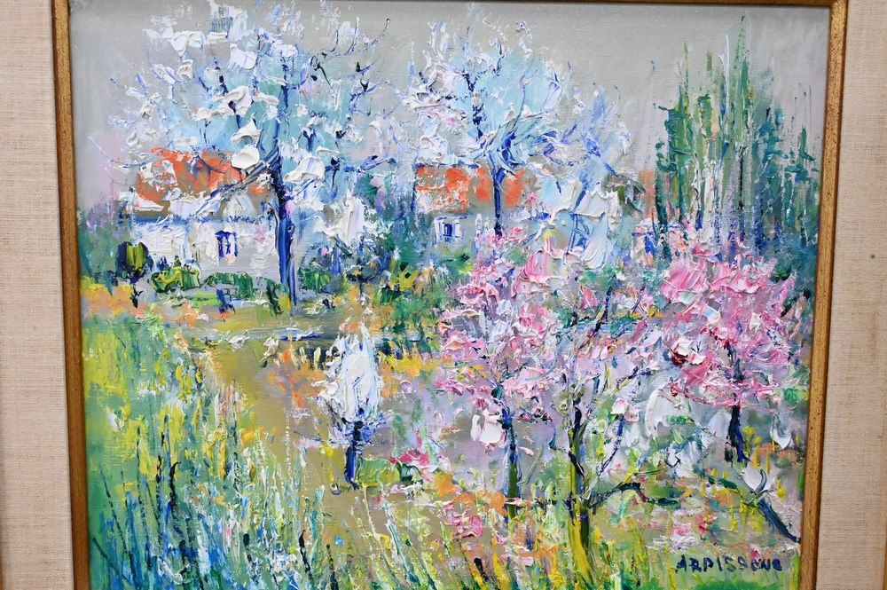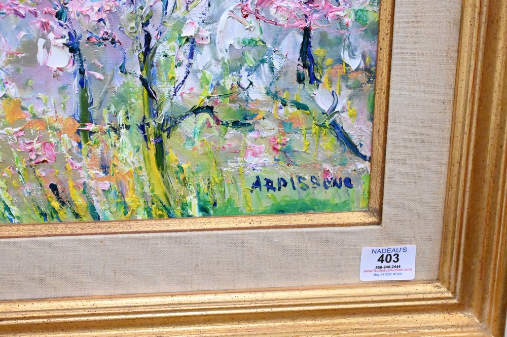 Lot 403: Yolande Ardissone (born 1927), landscape with flowers and trees, oil on canvas, titled “Pintemps en Loire”, signed lower right Ardissone, in gilt frame, 24″ x 21″.