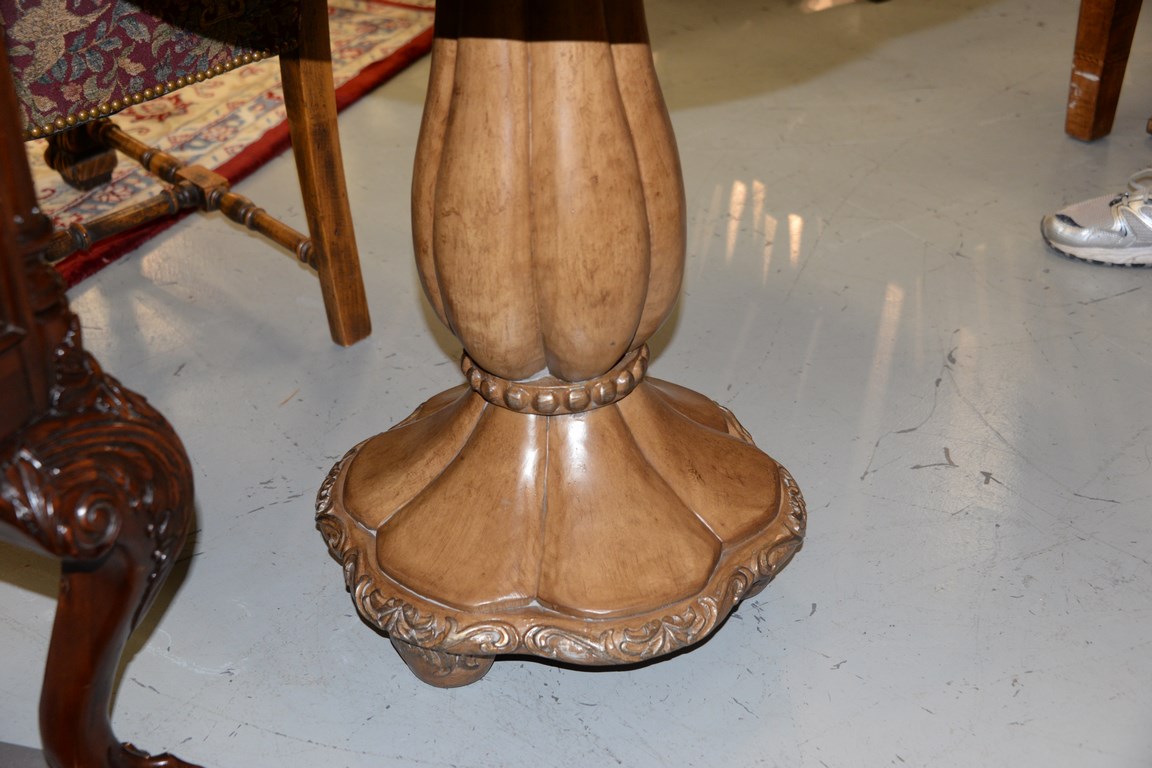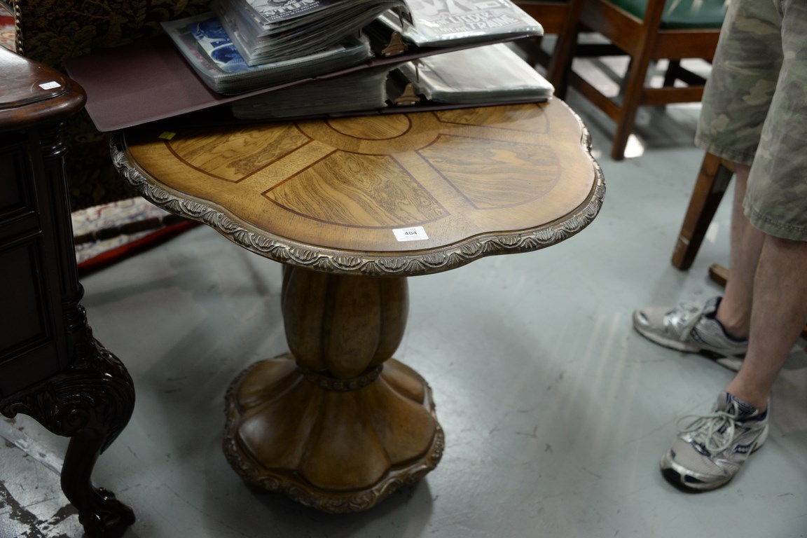 Decorative inlaid top table. ht. 27 in. dia. 28 in.