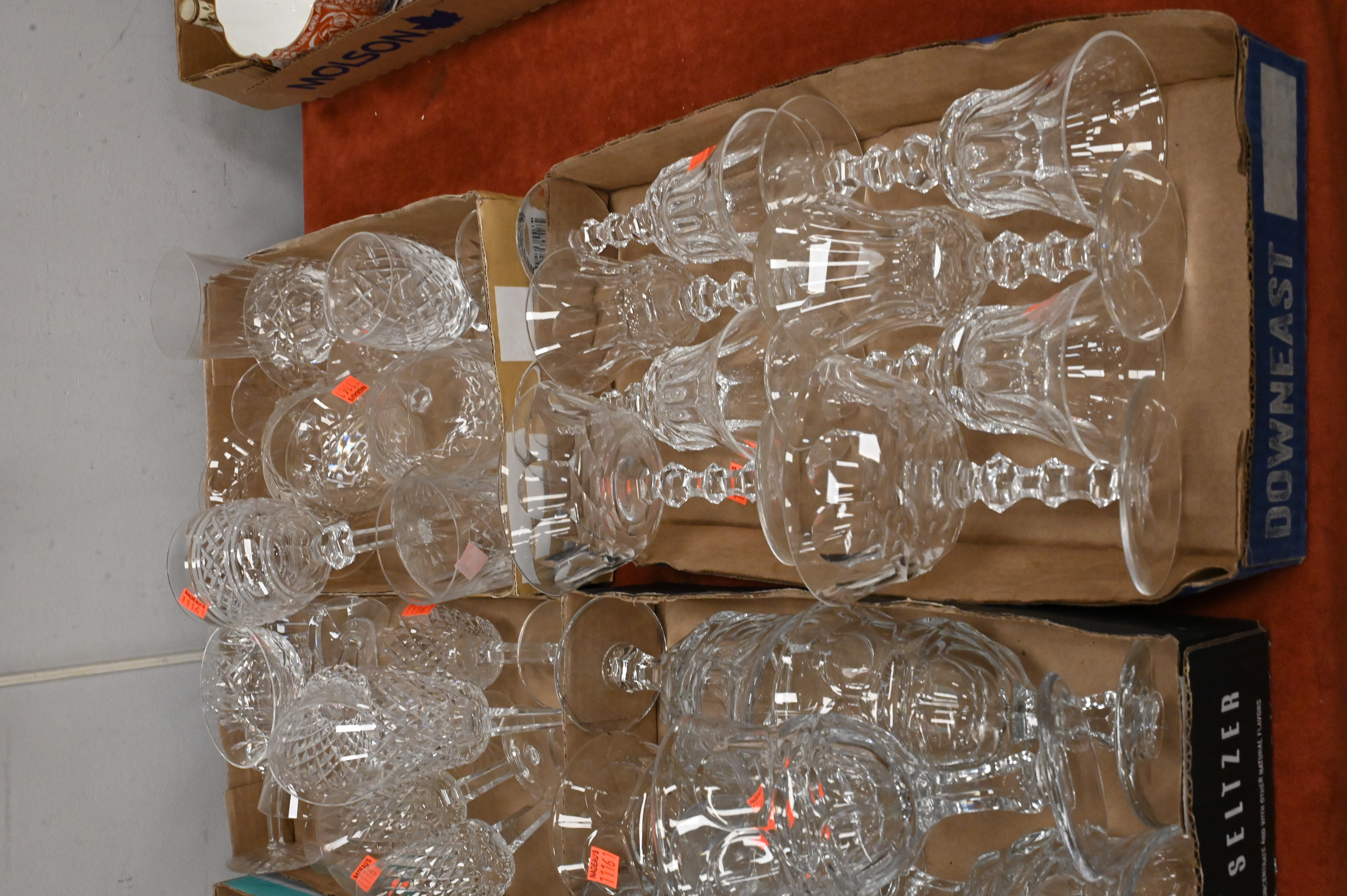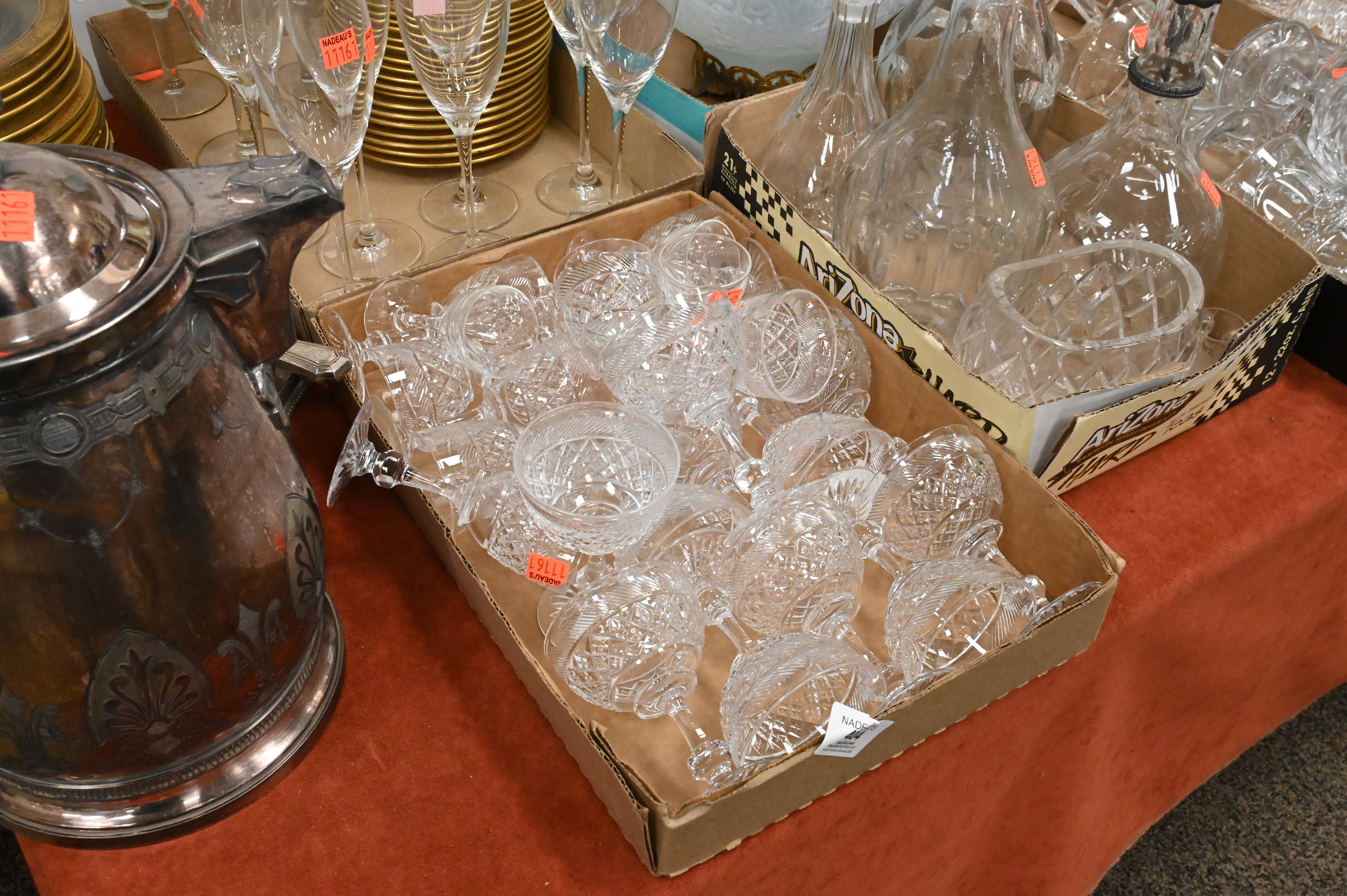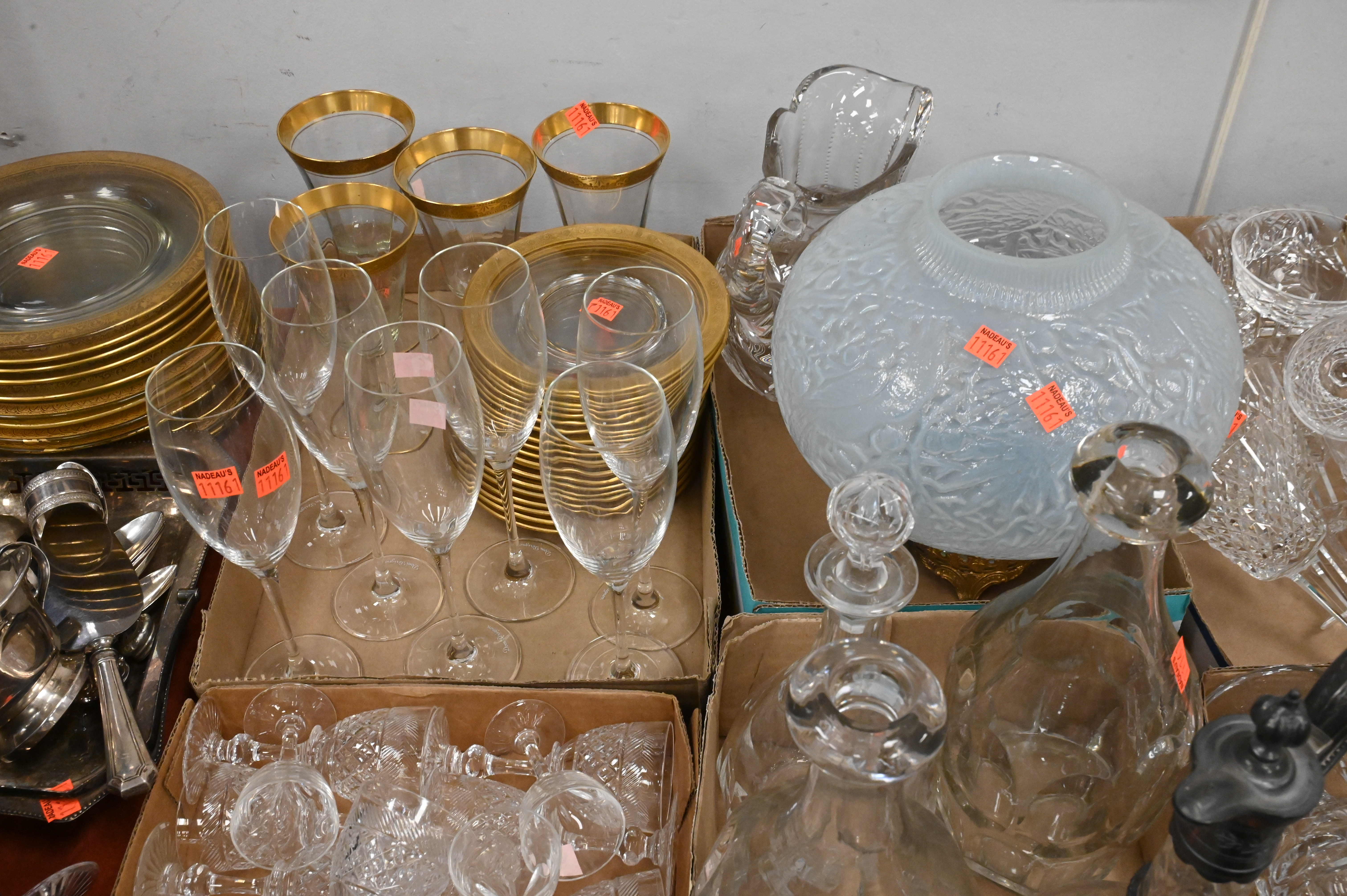 to include gilt rimmed plates, decanters, pressed glass stems, Waterford crystal stems, Dom Perignon champagne flutes, frosted vase, along with silver plate trays, large stein, utensils, etc…