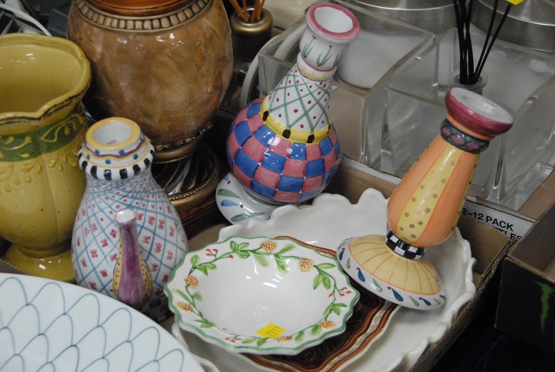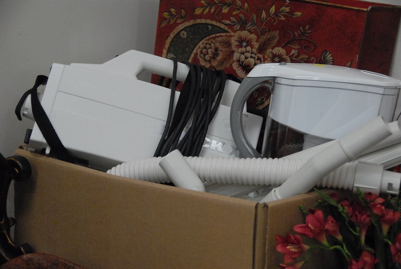 Lot 404: Group of five boxes to include stems, vases, phones, mirror, towels, linens, Oreck vacuum, center pieces, etc.