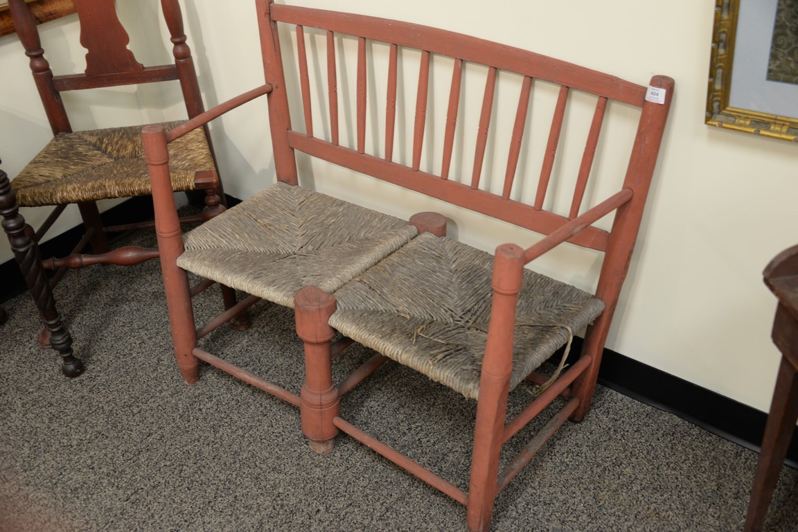 Lot 404: Primitive wagon bench with large turned center leg. height 31 inches, width 39 inches Provenance: Estate of R. Donald Bassette