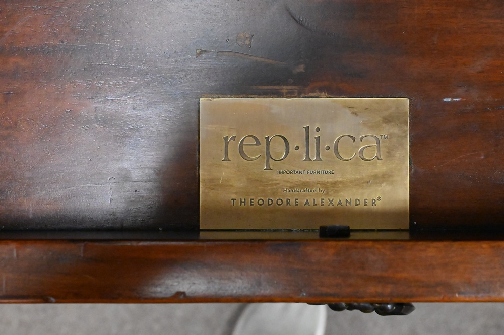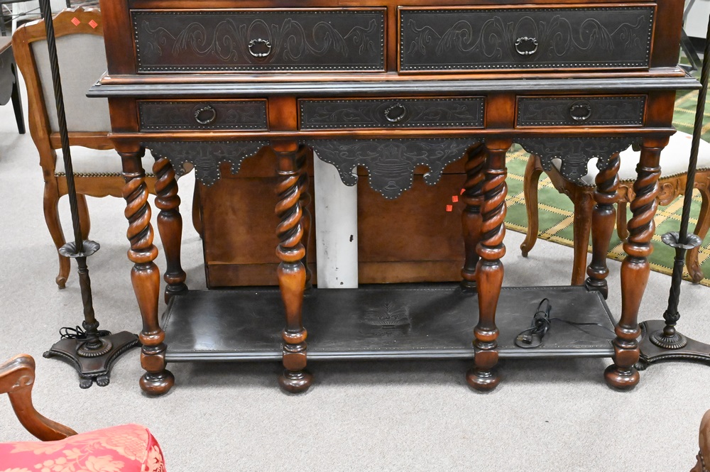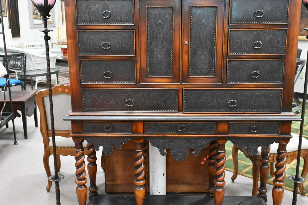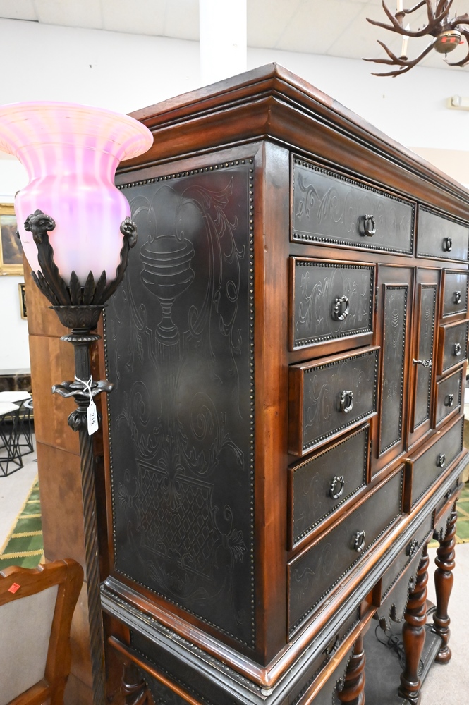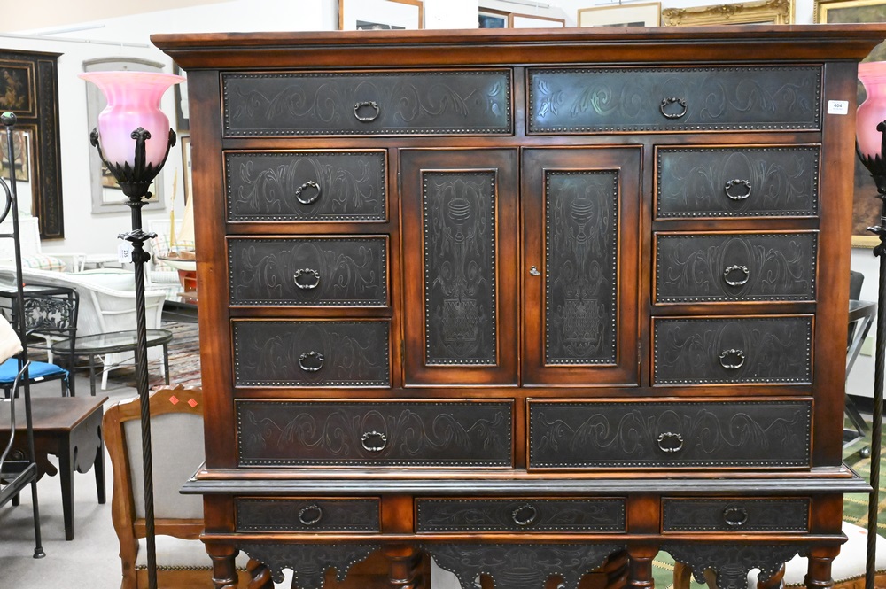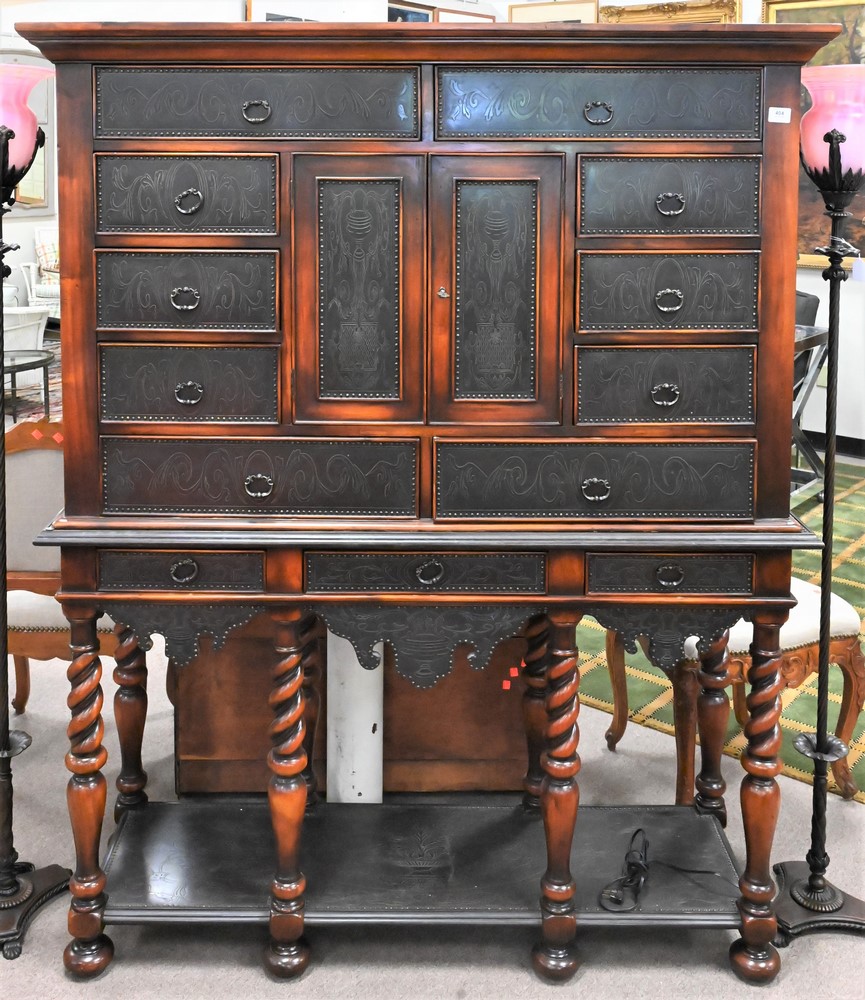 Theodore Alexander Collection Cabinet on Stand, in two parts with two doors and thirteen drawers, height 69 3/4 inches, top 18″ x 56″.