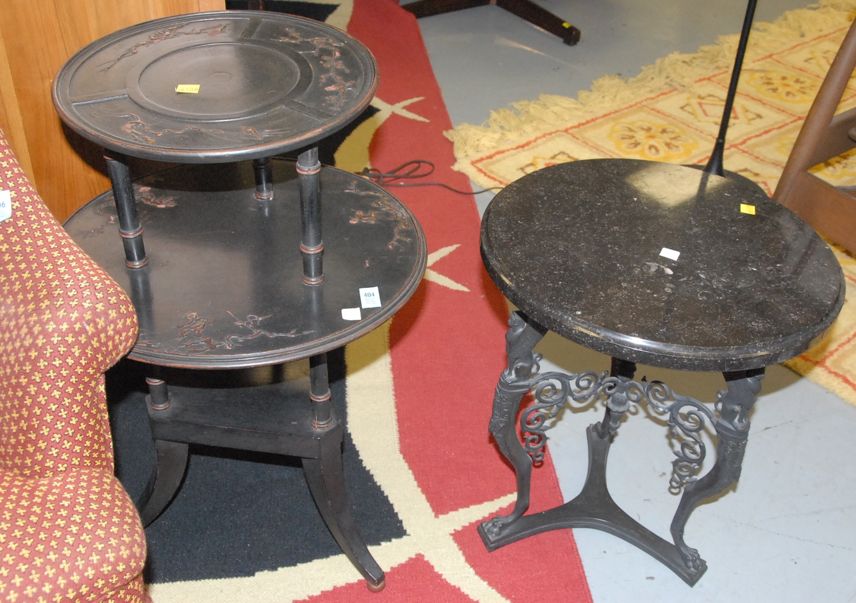Two tables chinoiserie decorated two tier table with black lacquered ht. 25in. dia. 16in. and iron base marble top table, dia. 16in. Provenance: property from a home in Rockville Center, New York which was decorated by Iris Apfel.