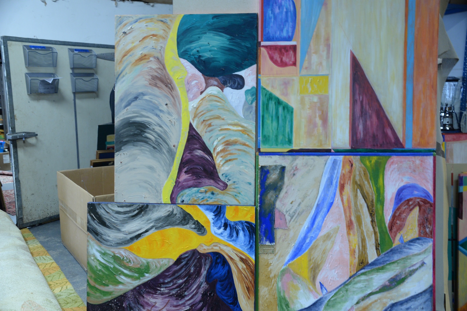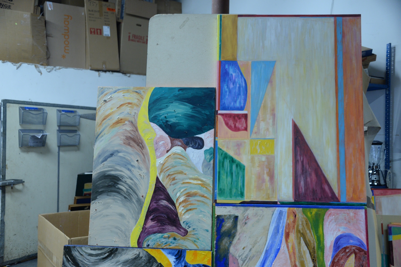 Lot 404B: Group of Four Faith Dorian Wright Abstracts, mixed media on canvas, each signed and titled on the stretcher bar, largest 47 1/2″ x 36″.