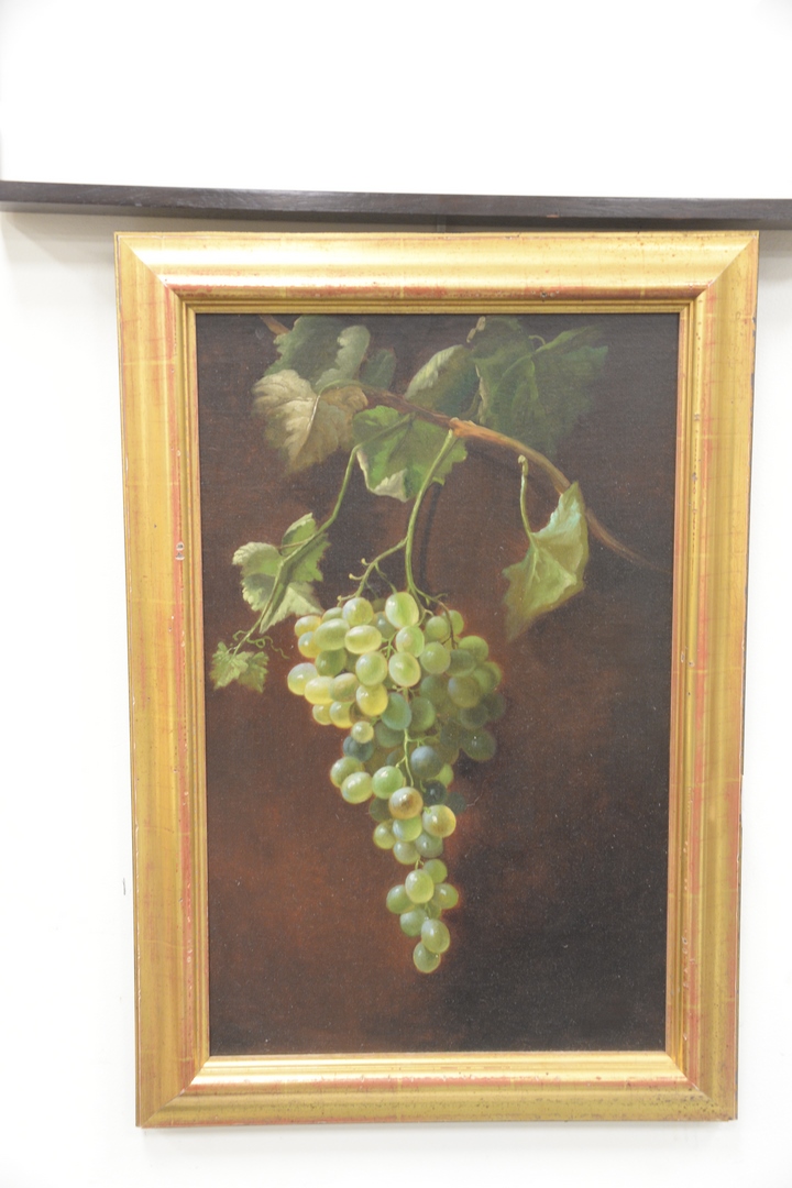 Attributed to Andrew John Henry Way American, 1826-1888 Pair of Still Lives, hanging green grapes and hanging purple grapes, oil on relined canvas, unsigned, 22 x 14.