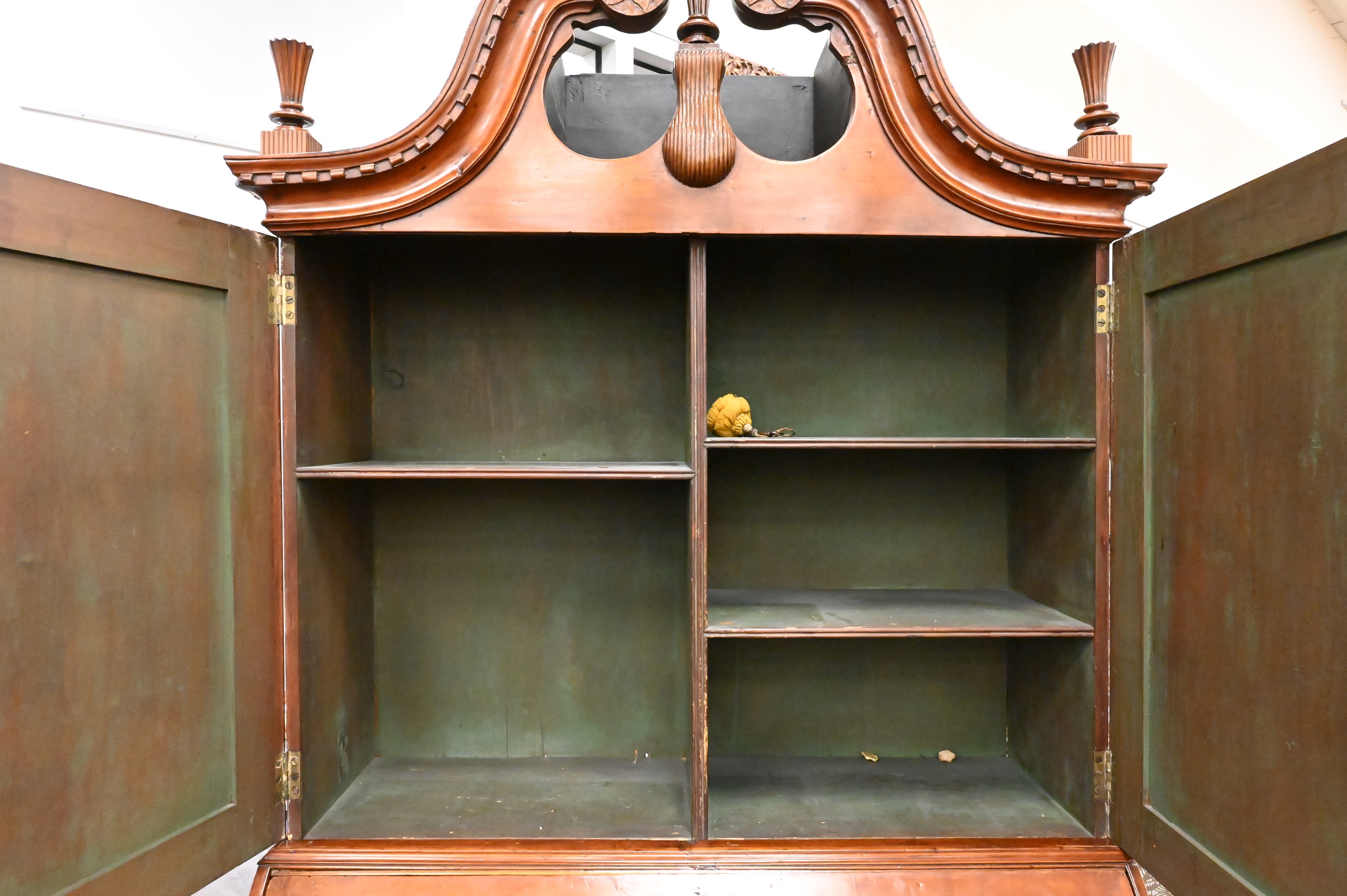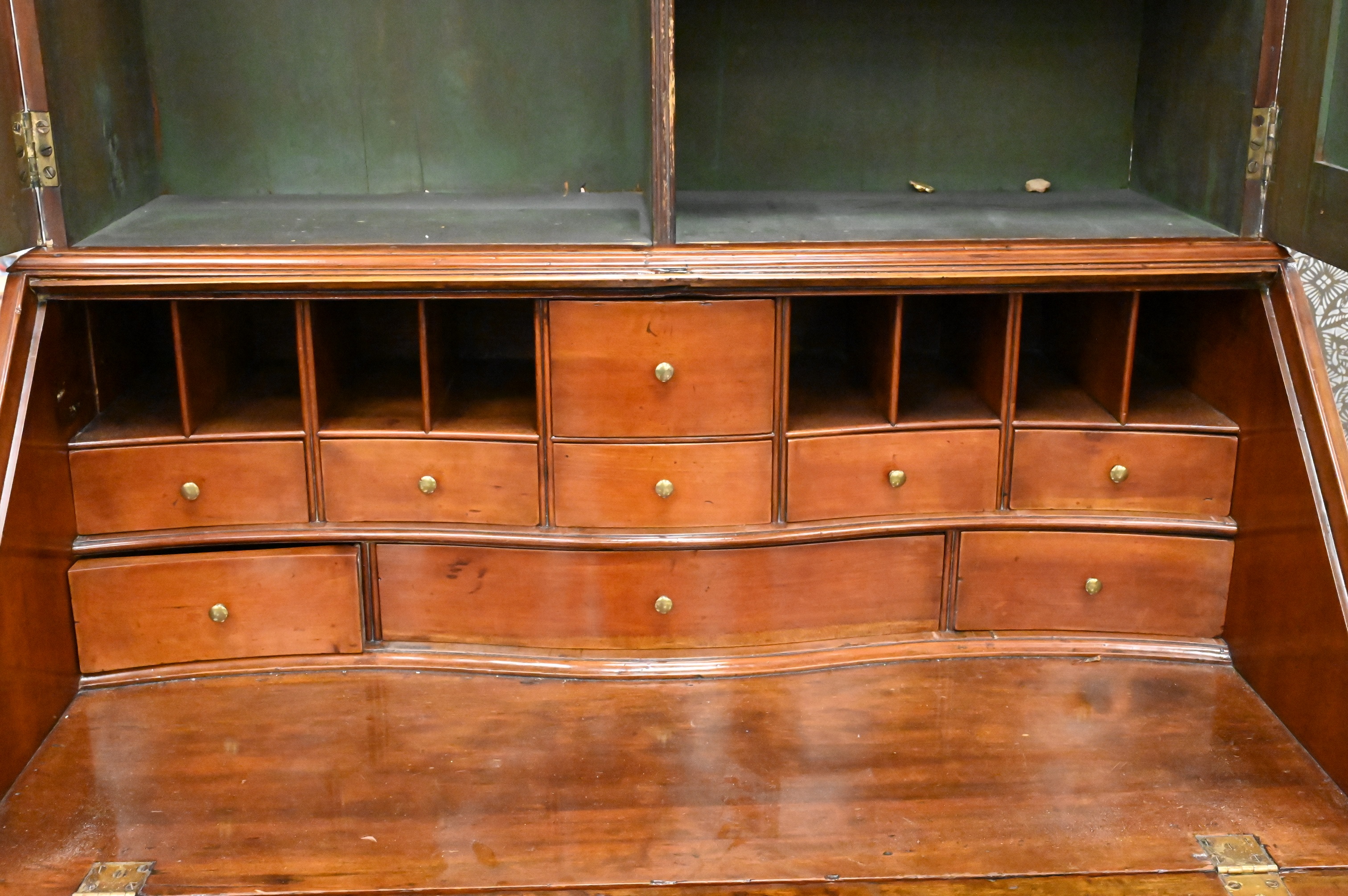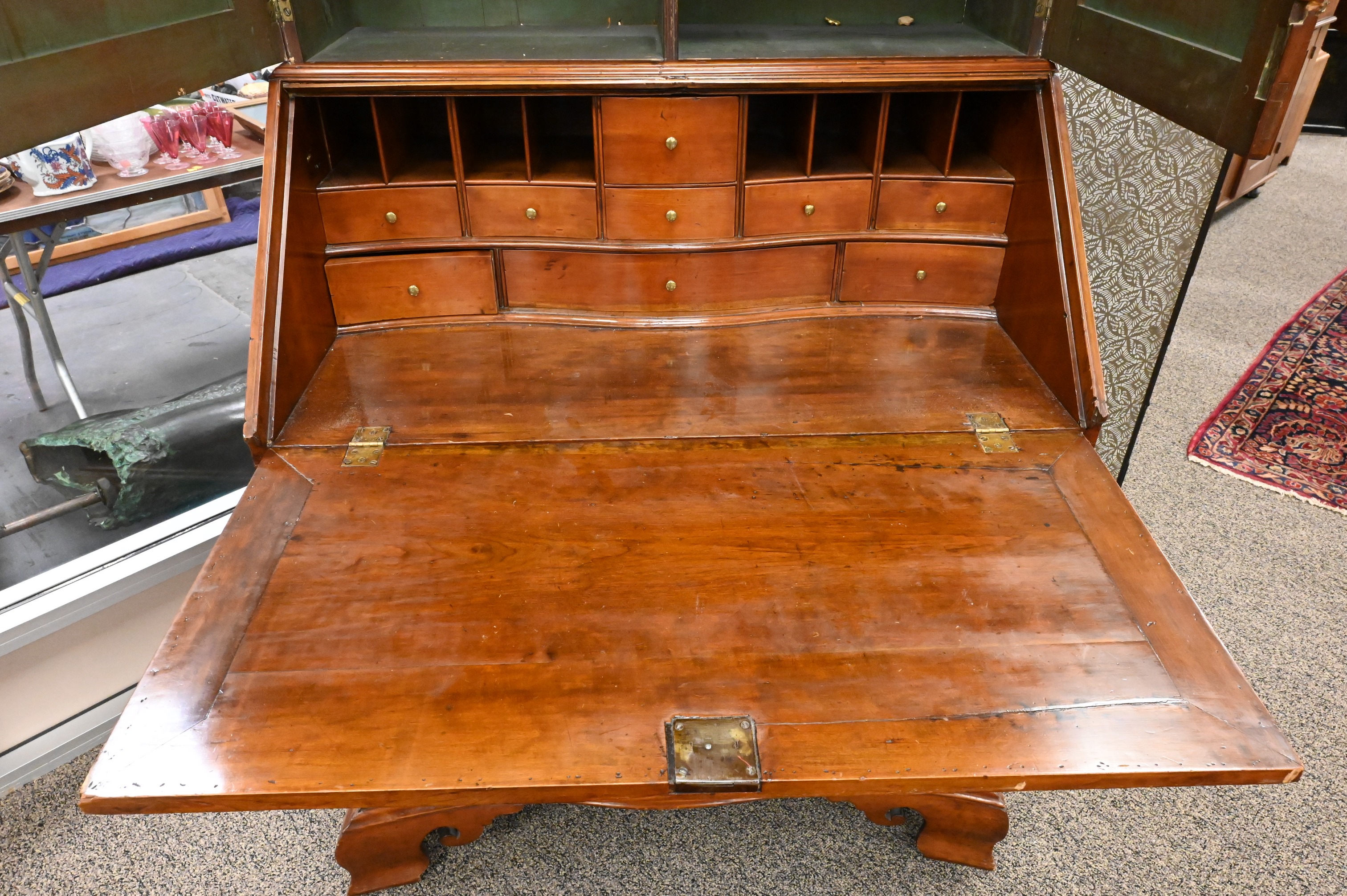in two sections, the upper section having carved broken arch pediment top over twin blind doors over lower section having having slant lid opening to interior with reverse serpentine form of drawers, over reverse serpentine drawers all raised on large ogee feet, circa 1760
