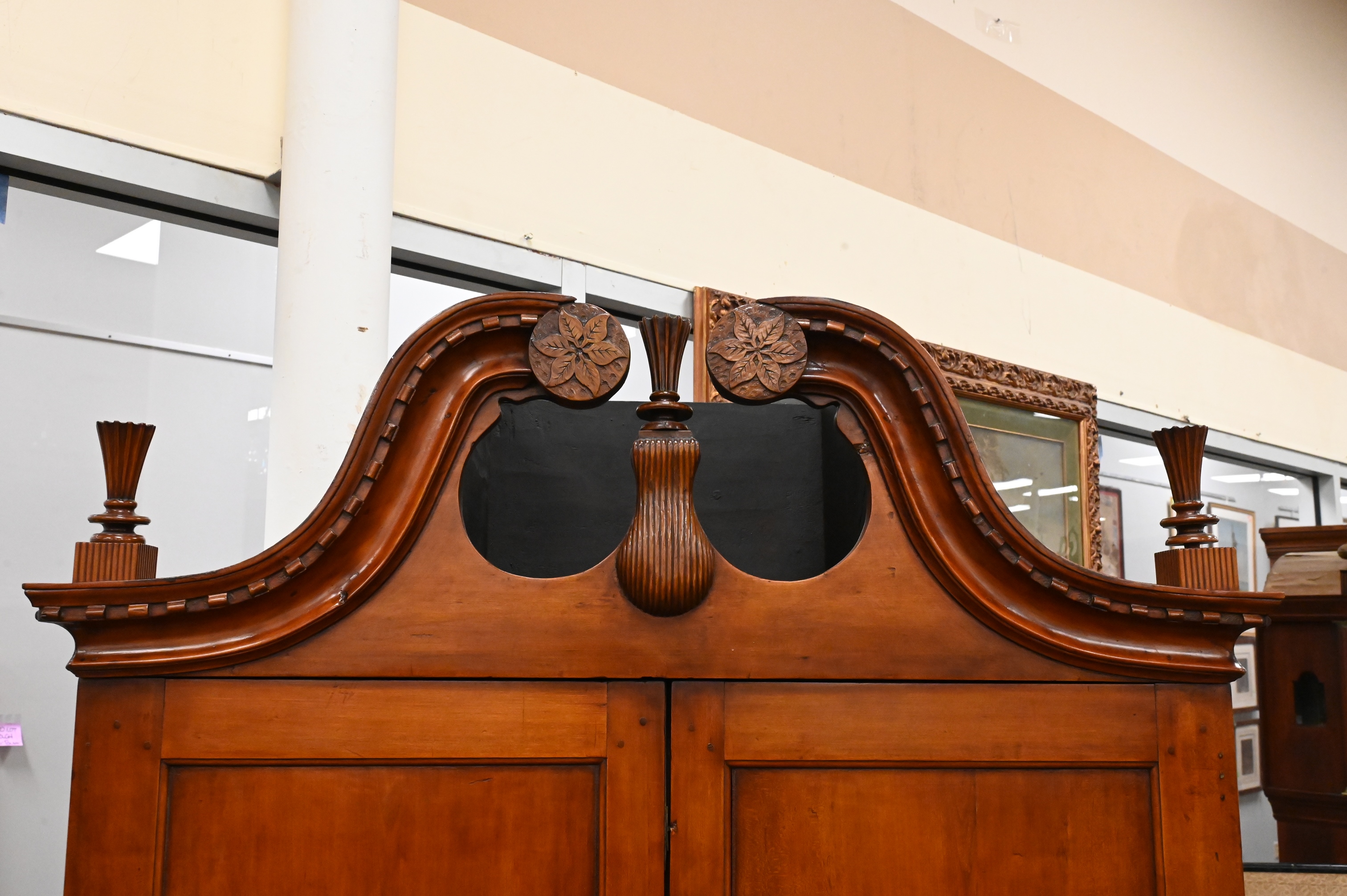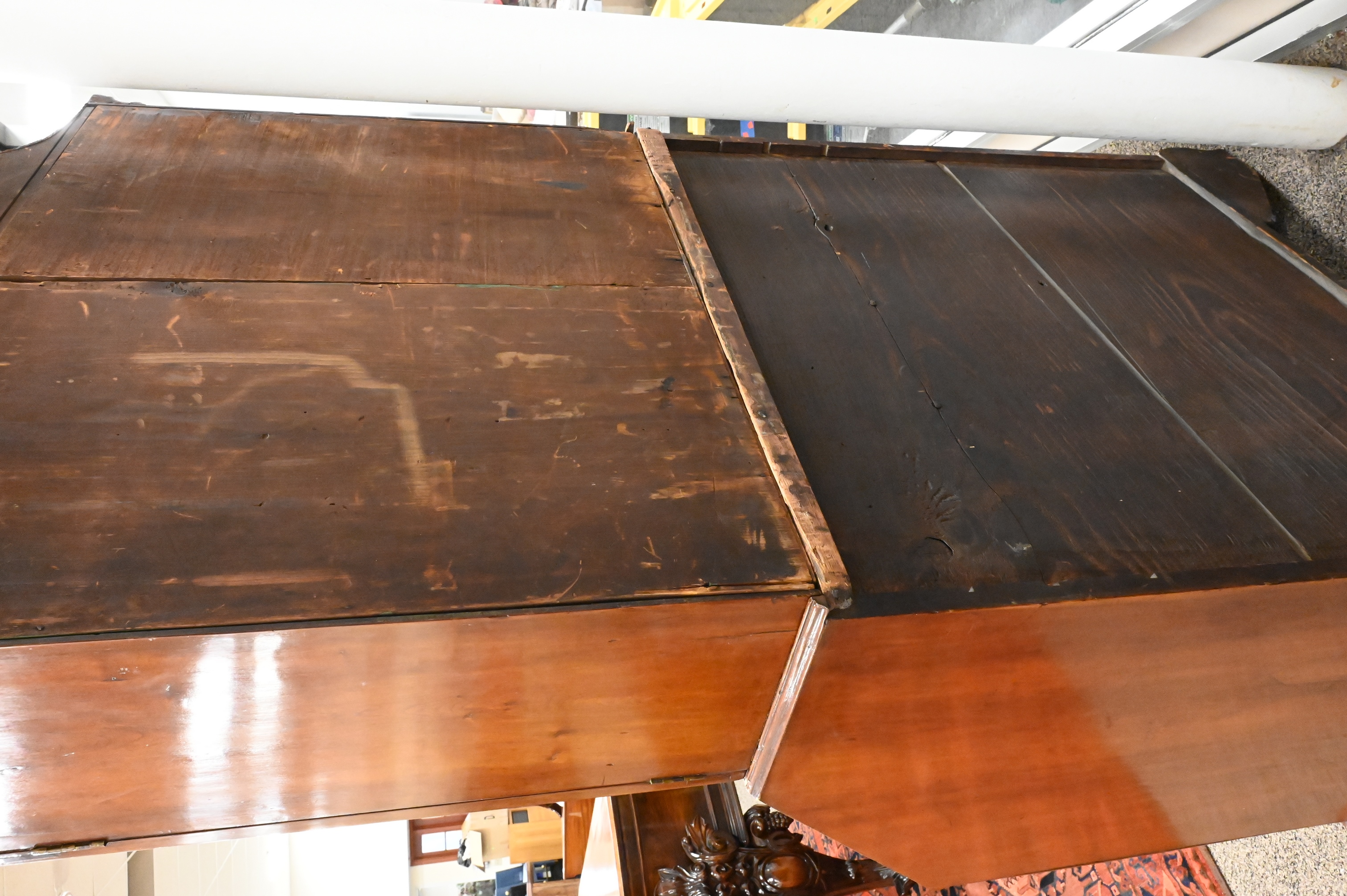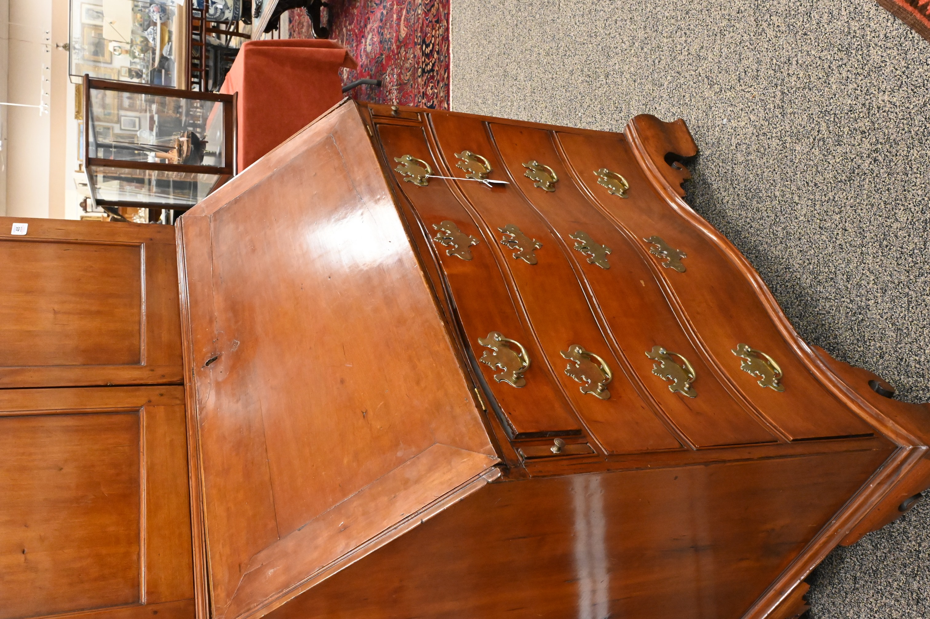 in two sections, the upper section having carved broken arch pediment top over twin blind doors over lower section having having slant lid opening to interior with reverse serpentine form of drawers, over reverse serpentine drawers all raised on large ogee feet, circa 1760