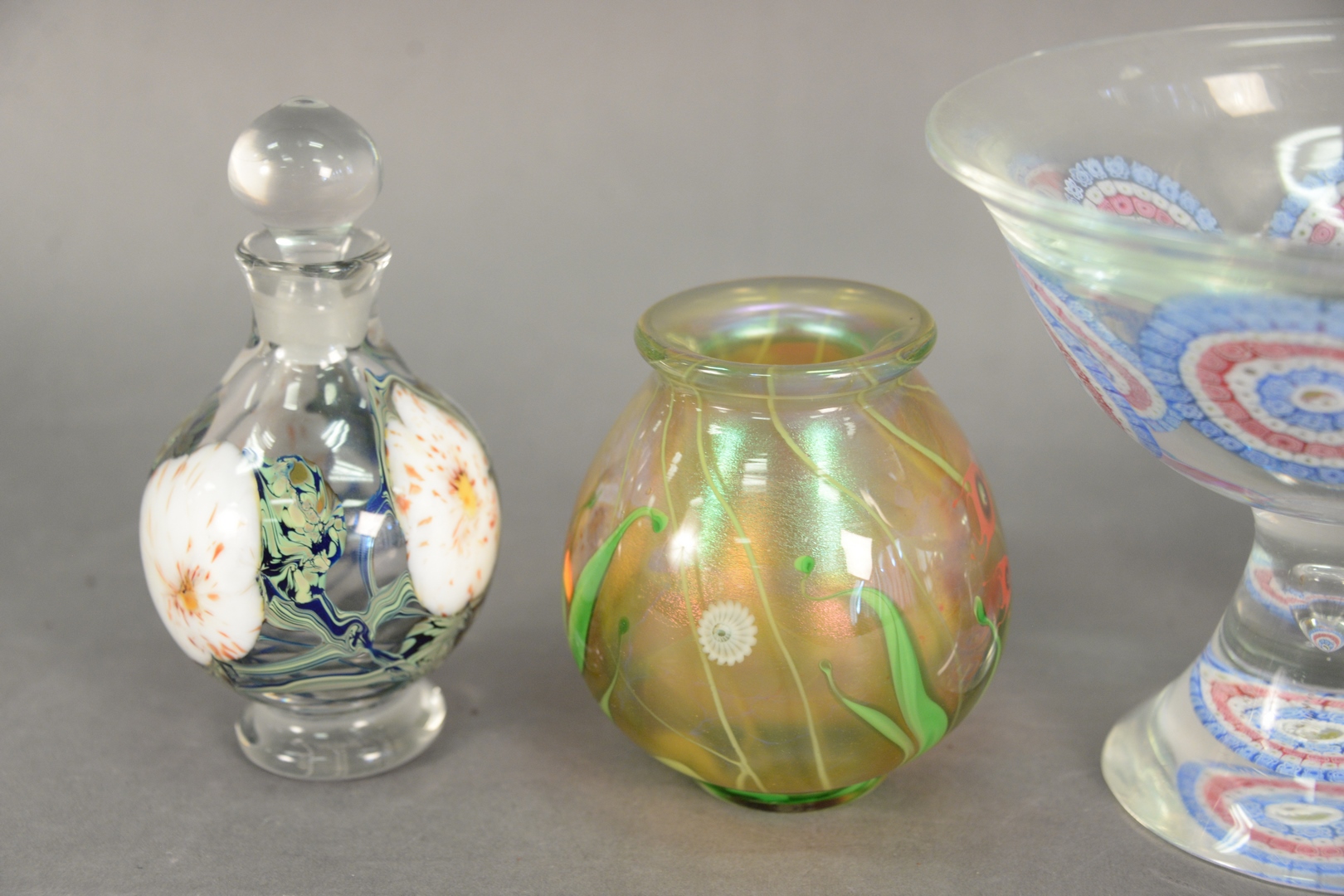 Lot 405: Five Piece Group of Murano Glass, to include a Lundberg Studios paperweight vase signed on the underside; a Charles Lotton “Multiflora” decanter, signed on the underside; an Orient & Flume paperweight vase, signed to the underside, along with two unmarked pieces including a Millefiori compote and paperweight vase having fish motif, compote height 6 inches, diameter 7 1/8 inches. Provenance: Estate of James Wadhams
