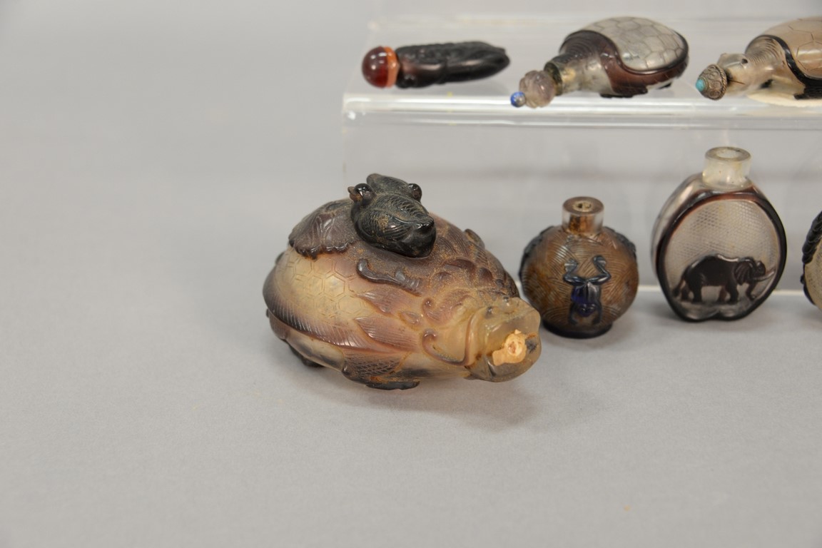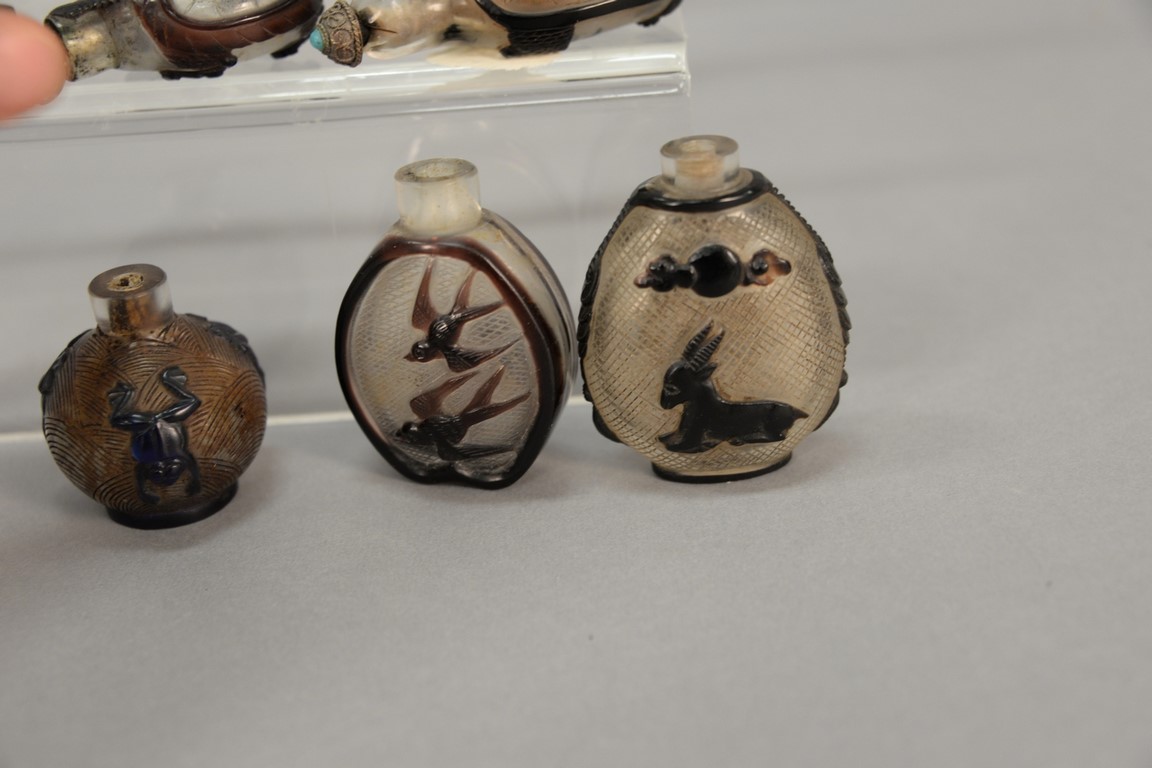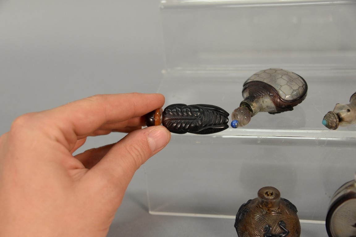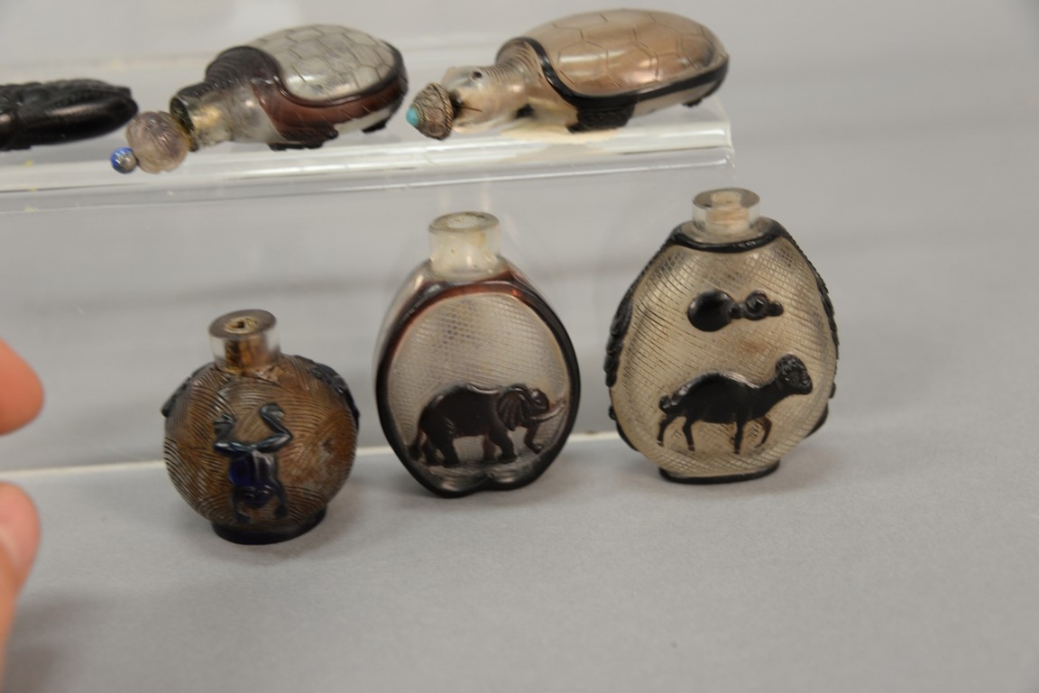 Lot 405: Seven overlay glass snuff bottles including two in the form of a turtle, one in the form of a beetle, three with pattern cut glass w…