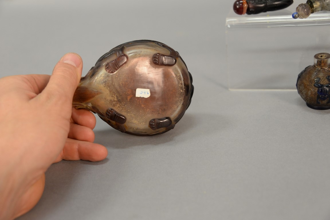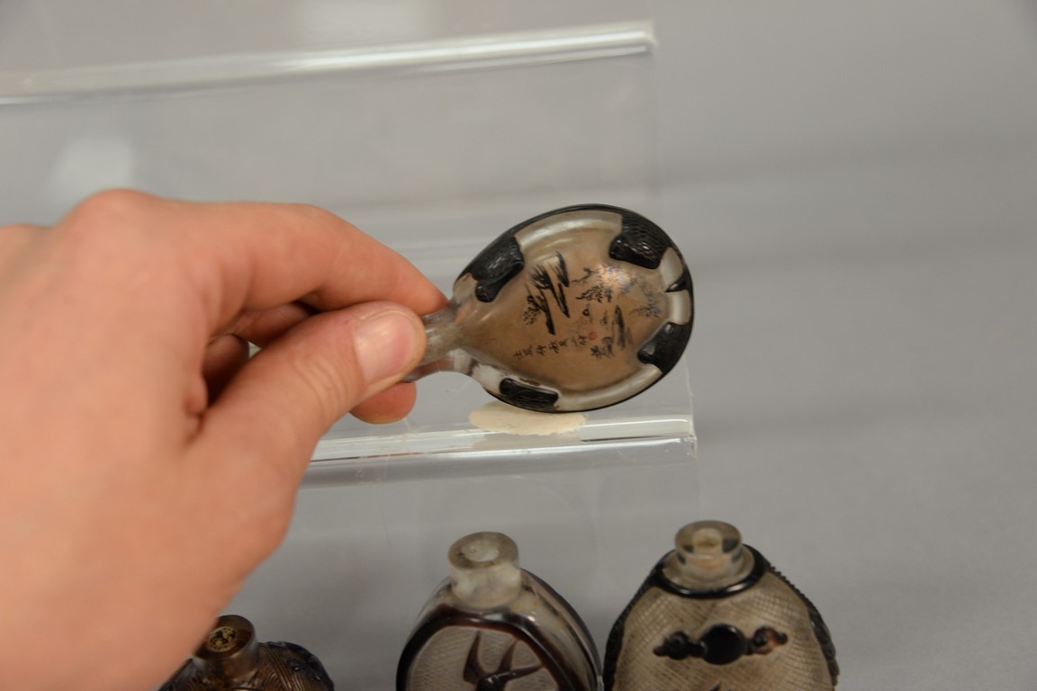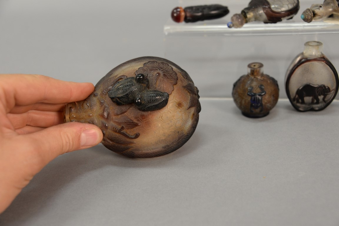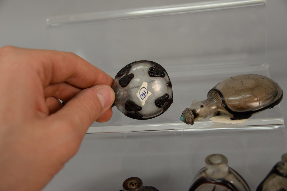 Lot 405: Seven overlay glass snuff bottles including two in the form of a turtle, one in the form of a beetle, three with pattern cut glass w…