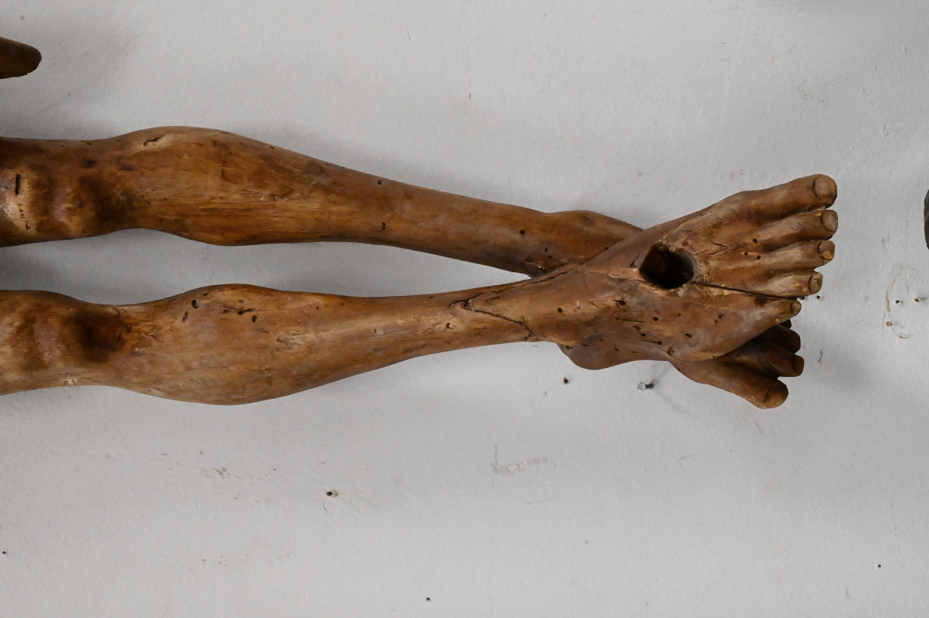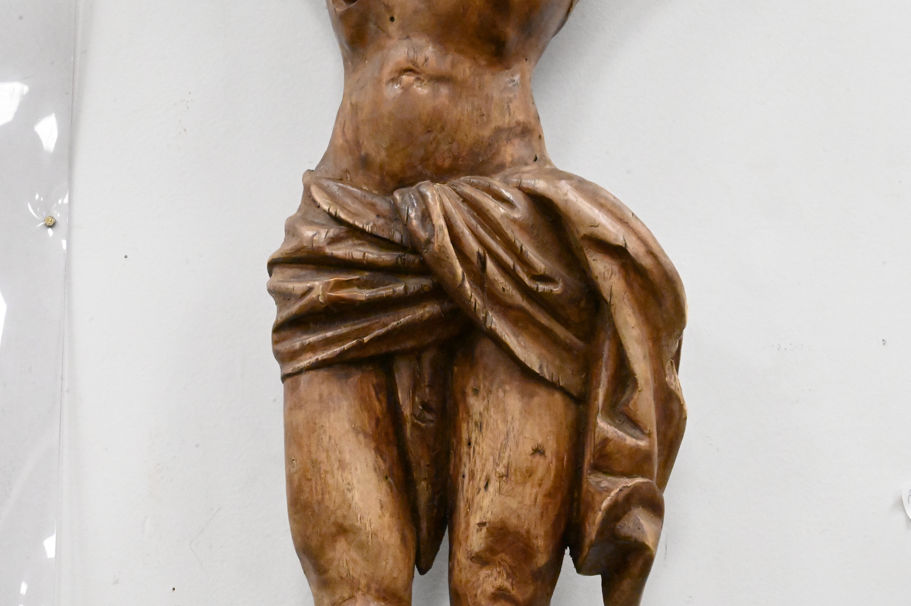 A finely carved late Gothic linden wood Corpus figure of Christ, His thorn-crowned head inclined to the left. The emaciated torso is rendered with sharply defined ribs and abdomen, the lower body draped in a deeply folded perizomium. The legs are crossed at the ankles. This figure was originally part of a larger crucifix group