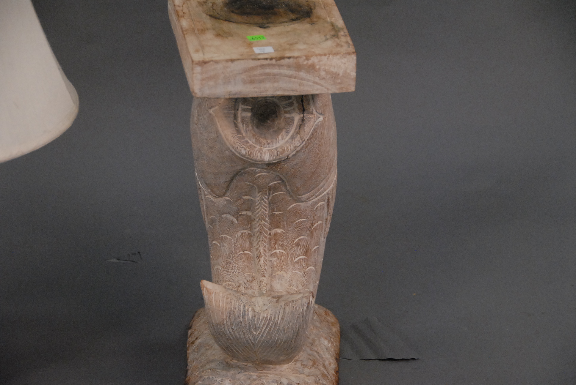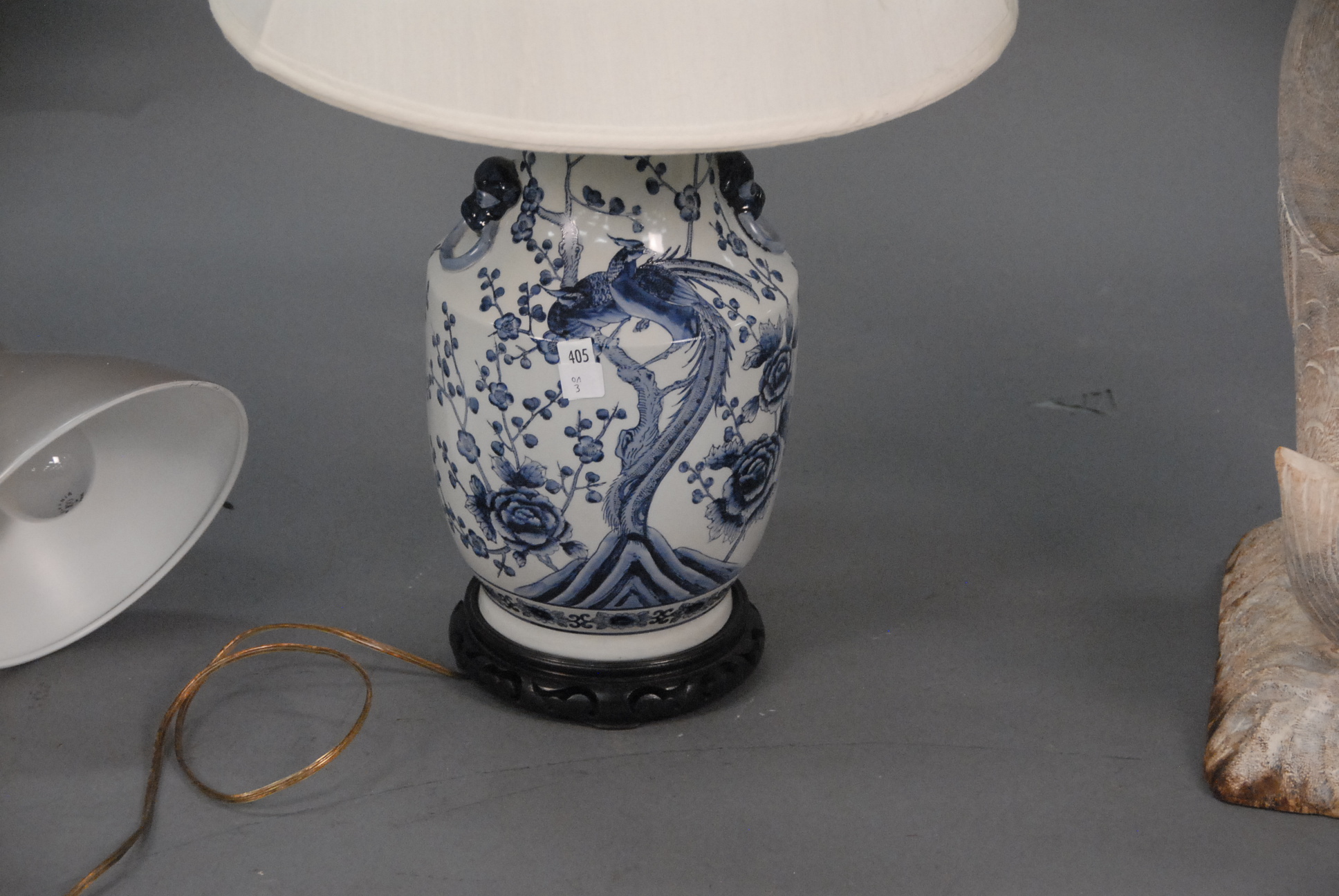 Three piece lot blue and white porcelain lamp, retractable lamp, and carved wood fish stand.