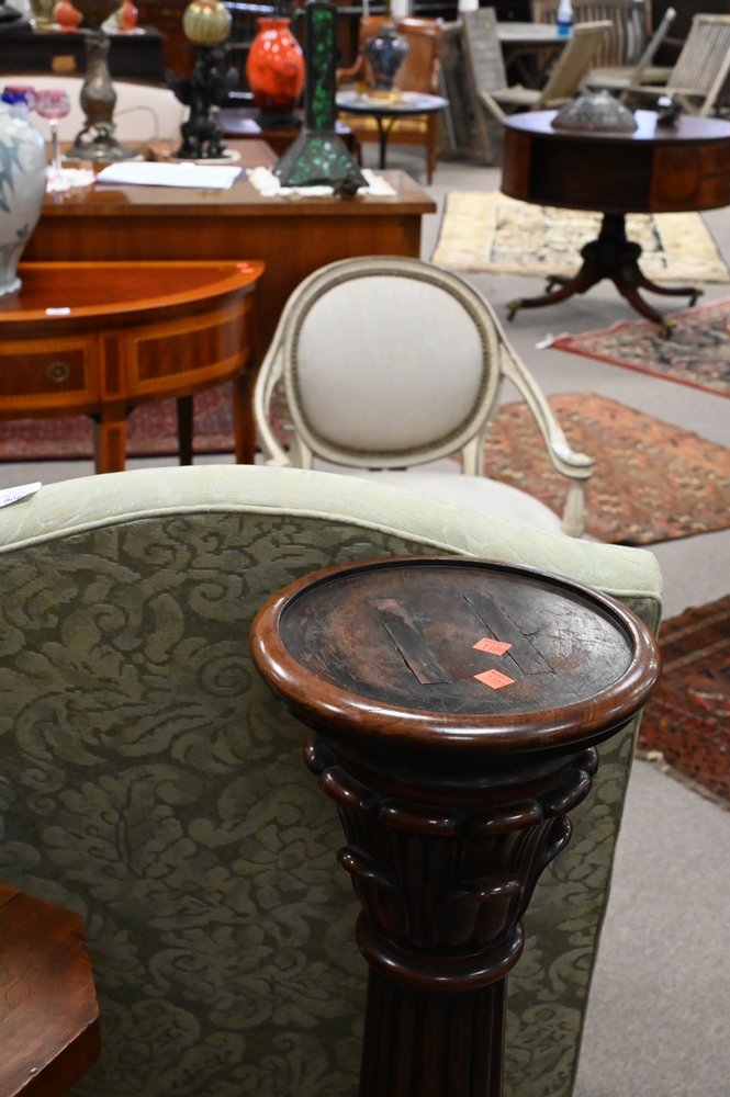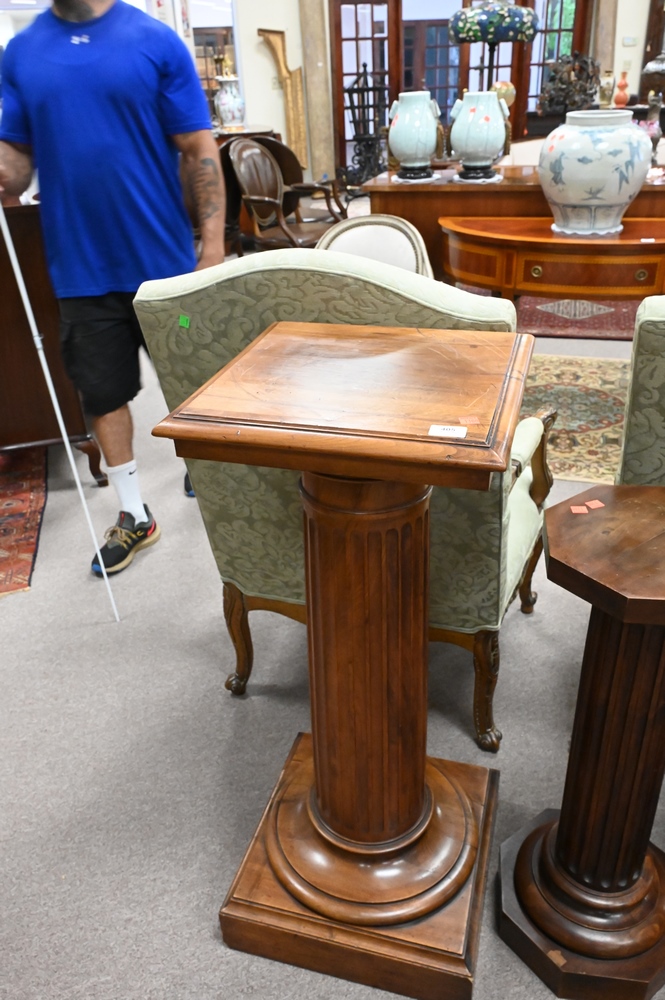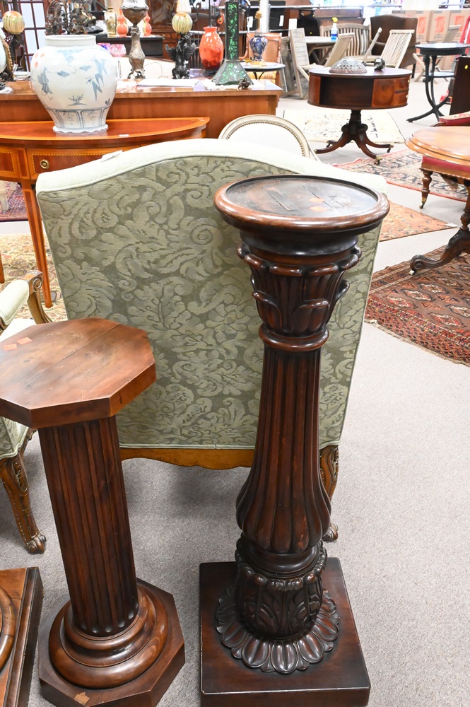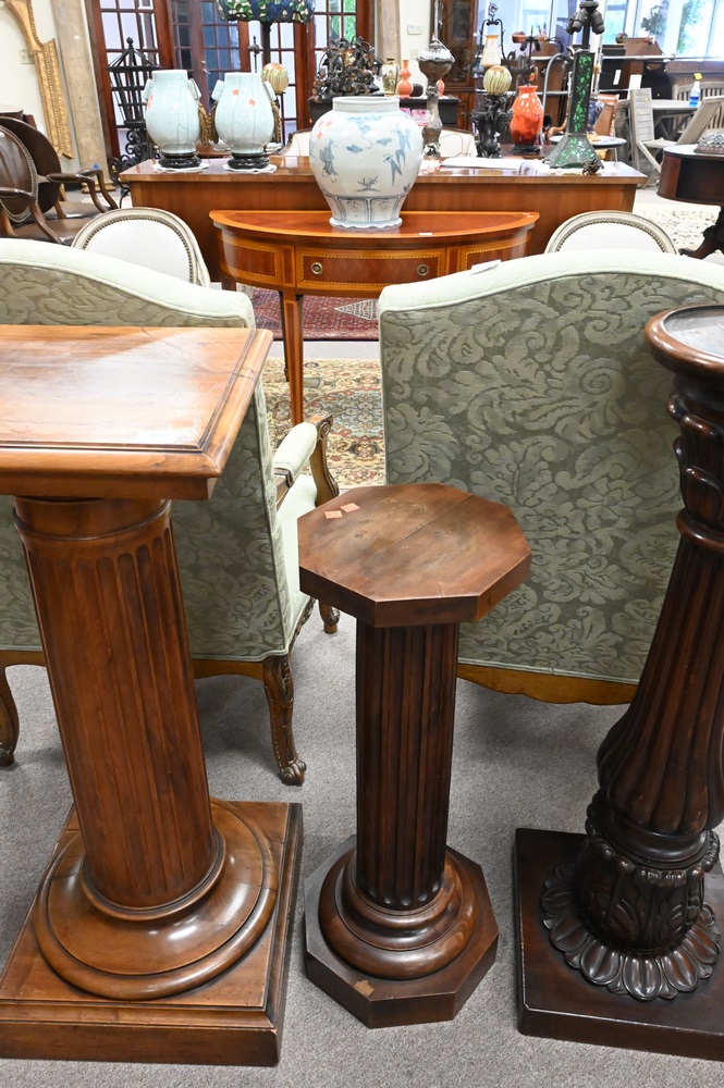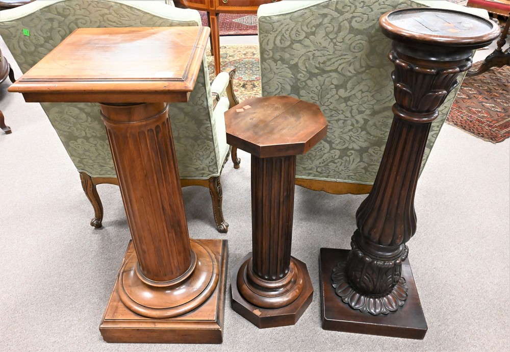 Three Wooden Pedestals, each having fluted shafts, heights 31, 39, and 41 inches.