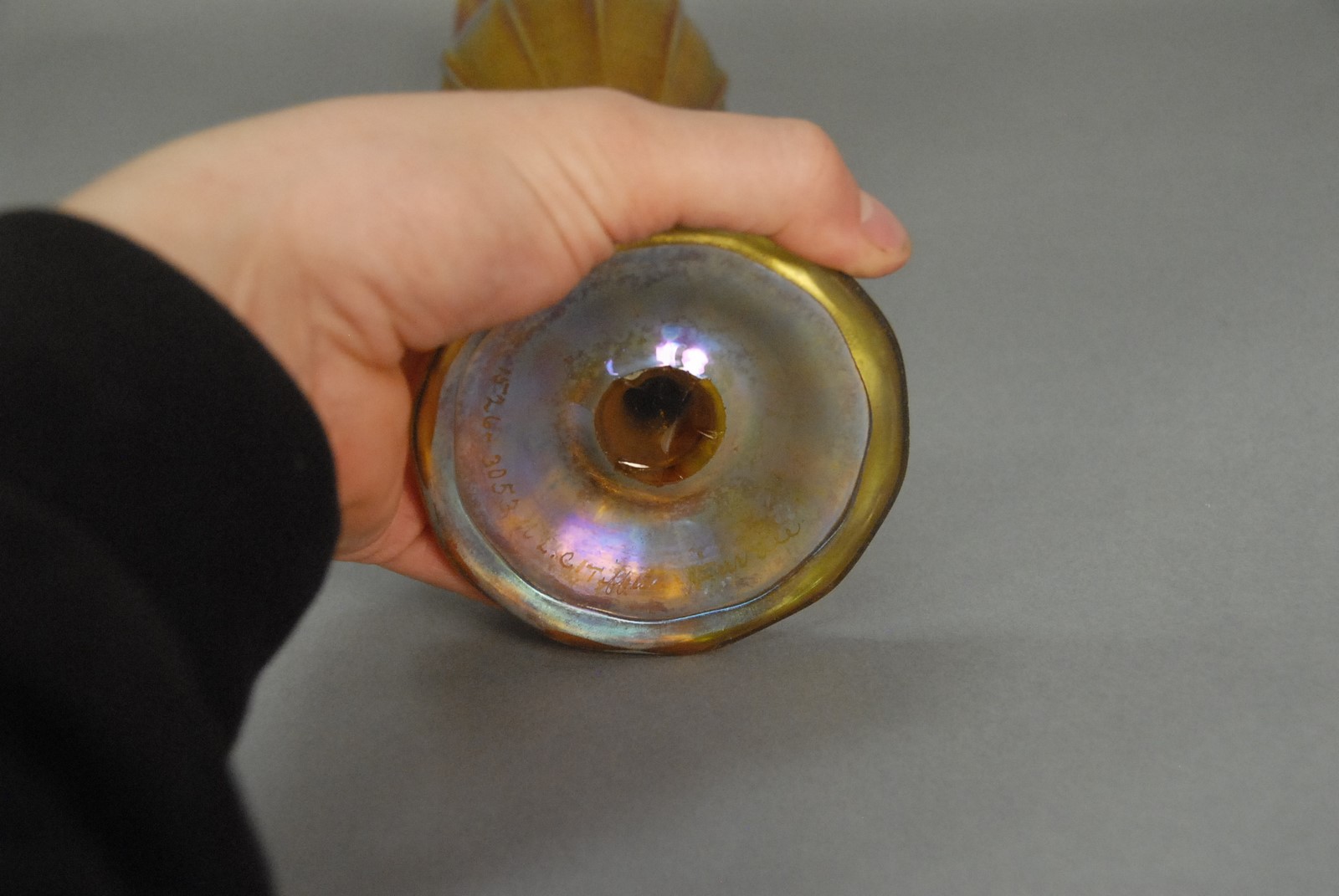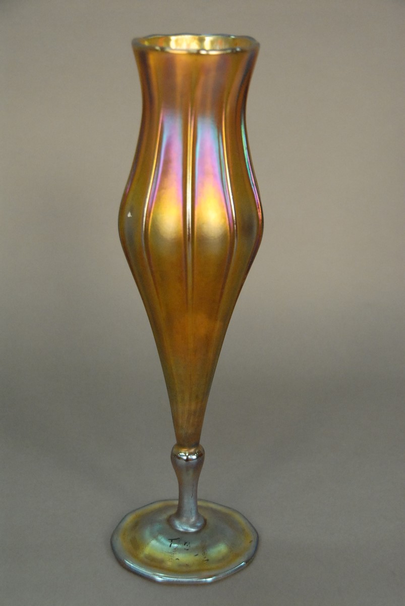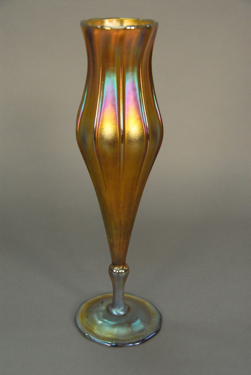 Lot 405: Tiffany gold iridescent Favrile floriform vase with flared rim and ribbed body on a circular foot, marked on base L.C. Tiffany Favrile 1526-3053M. ht. 12 3/4 in.
