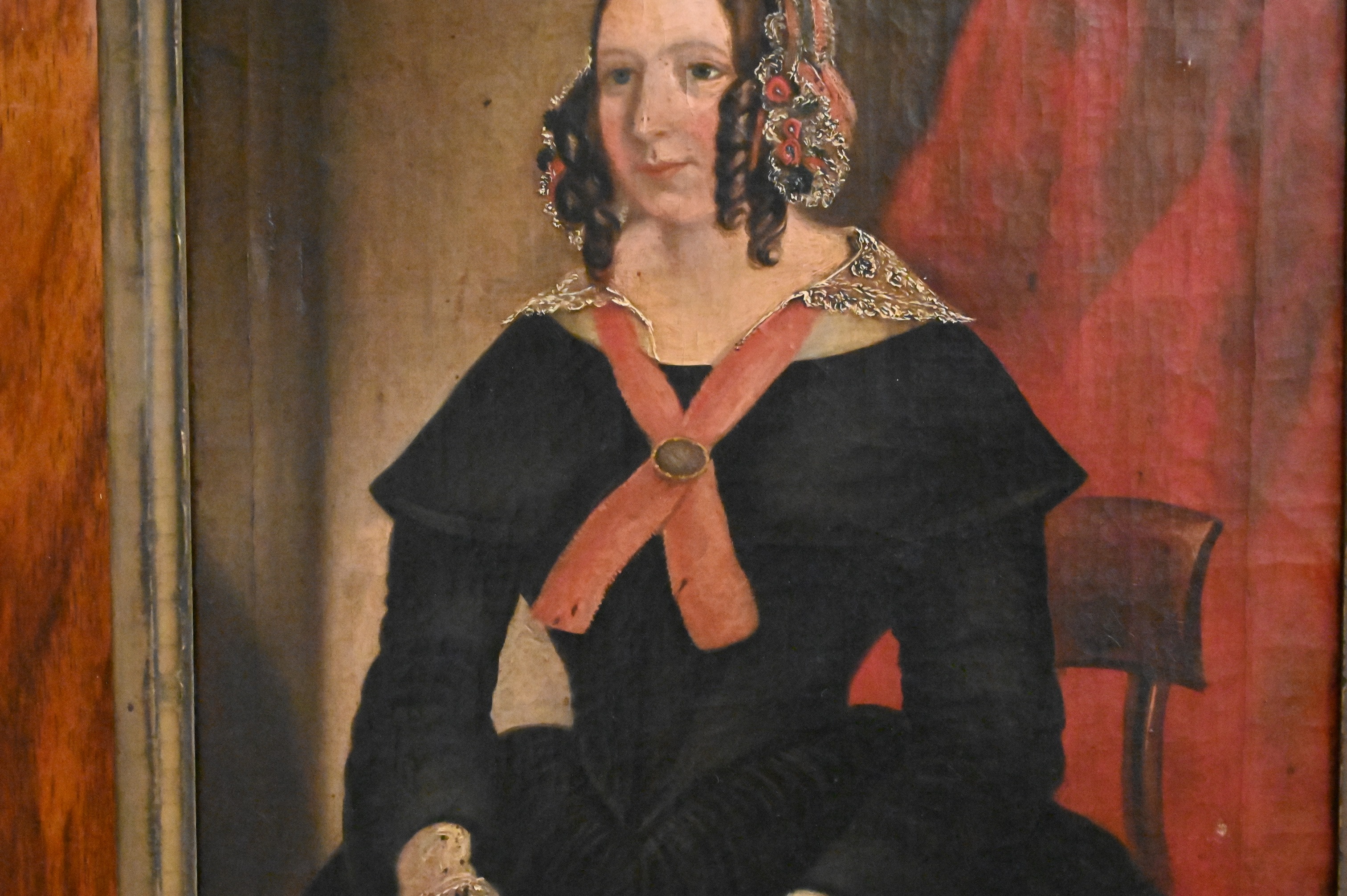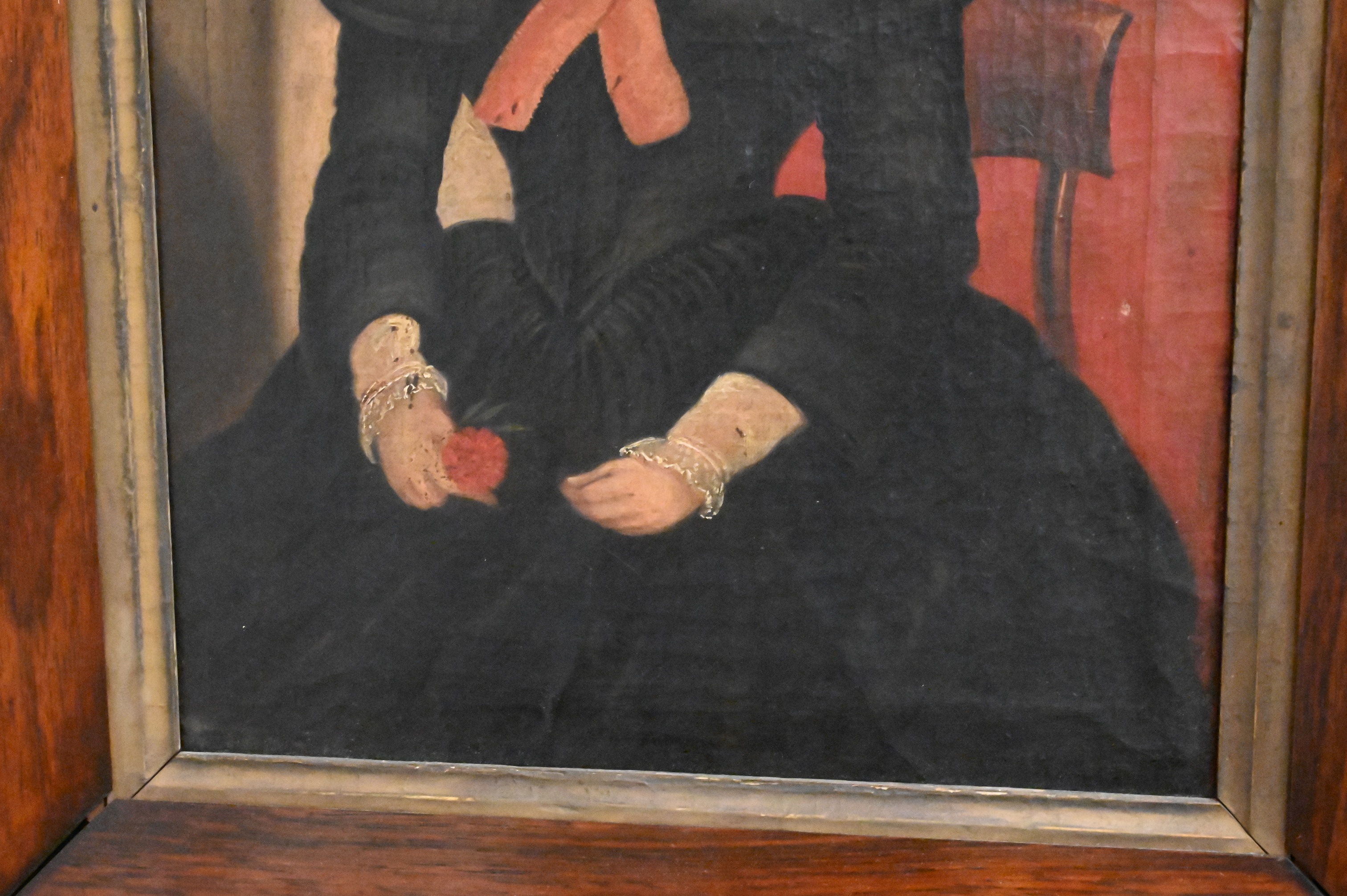 Depicting a seated woman in black dress holding a red flower, 3/4 view, in rosewood frame